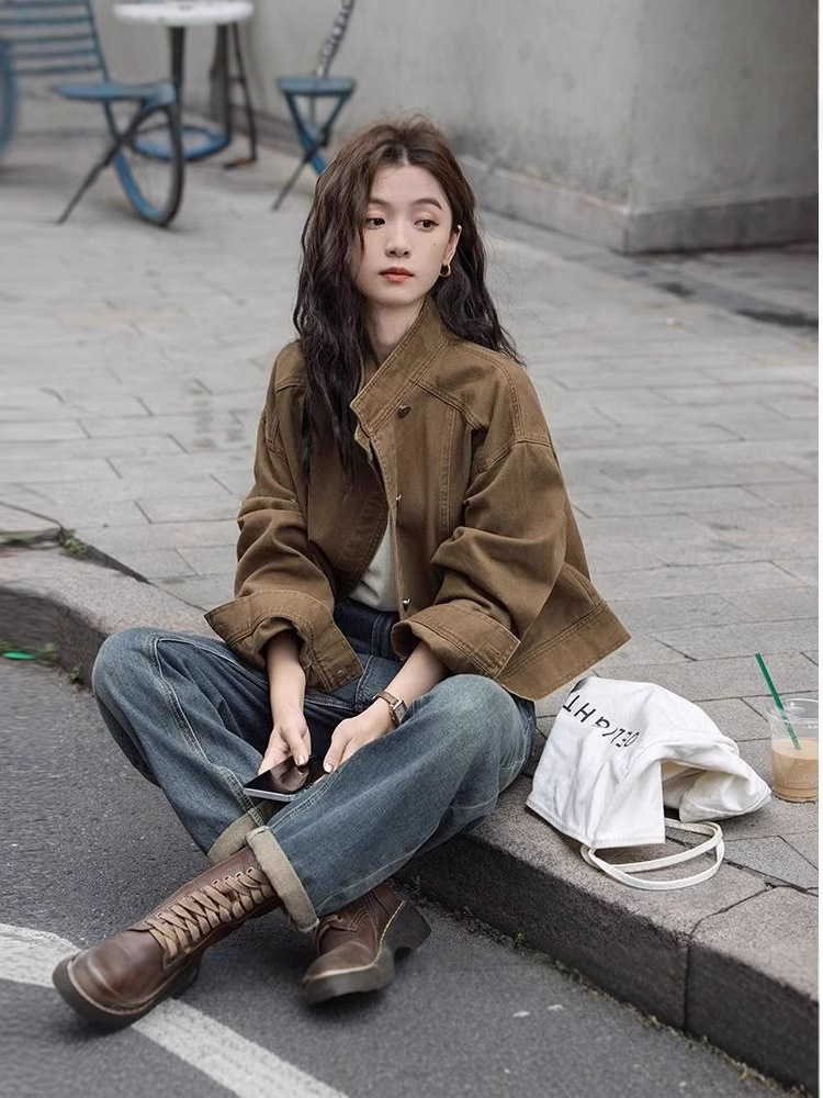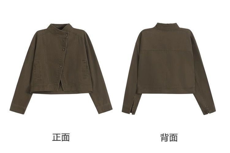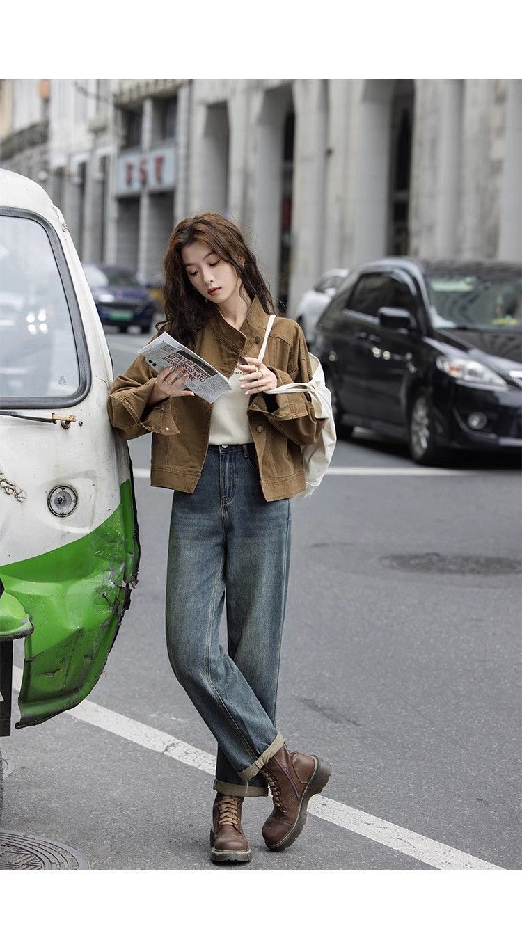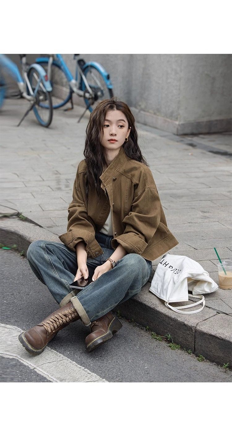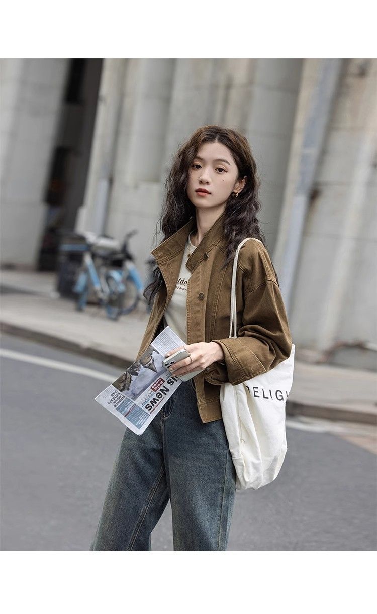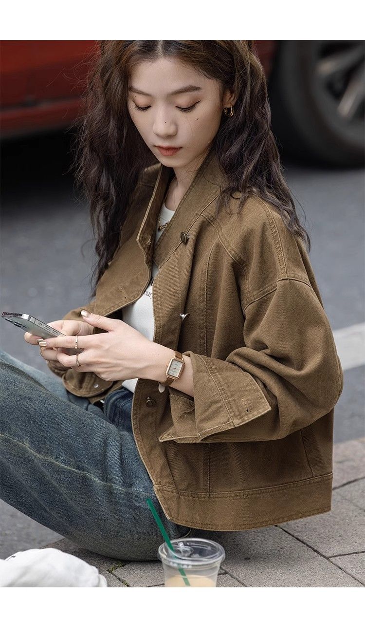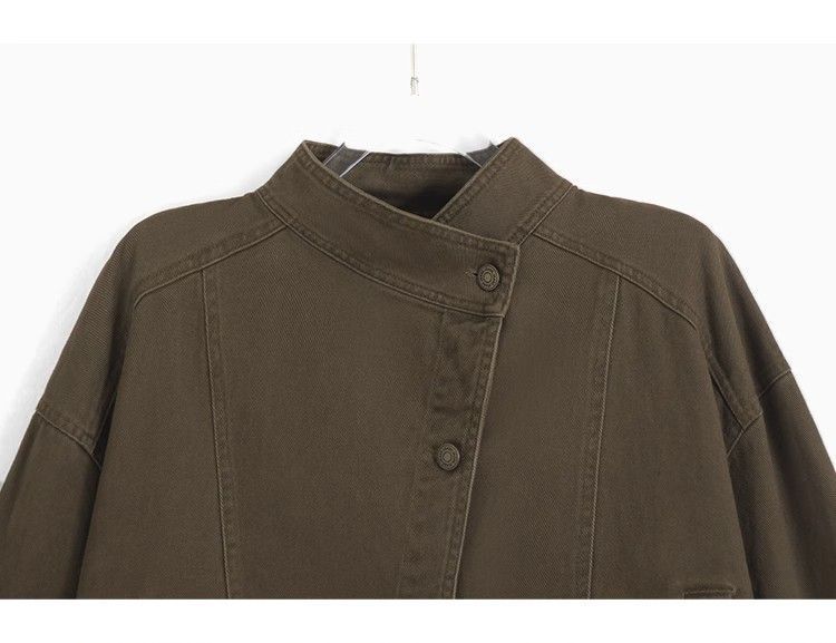 한국식 레트로 툴링 수직 칼라 재킷 코트 여성의 가을 새로운 오토바이 스타일 느슨한 캐주얼 짧은 자켓 탑