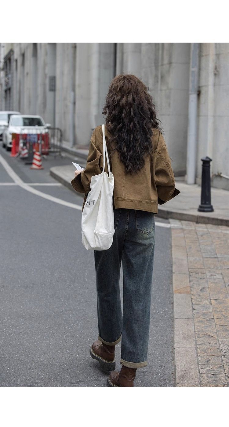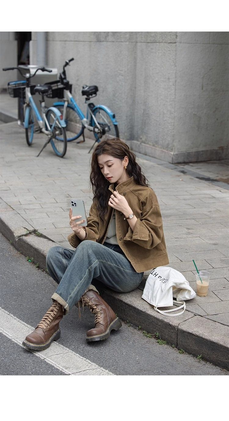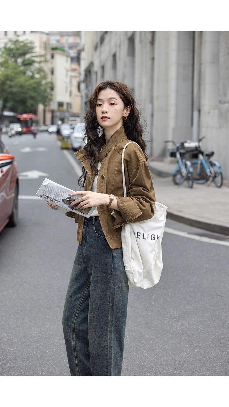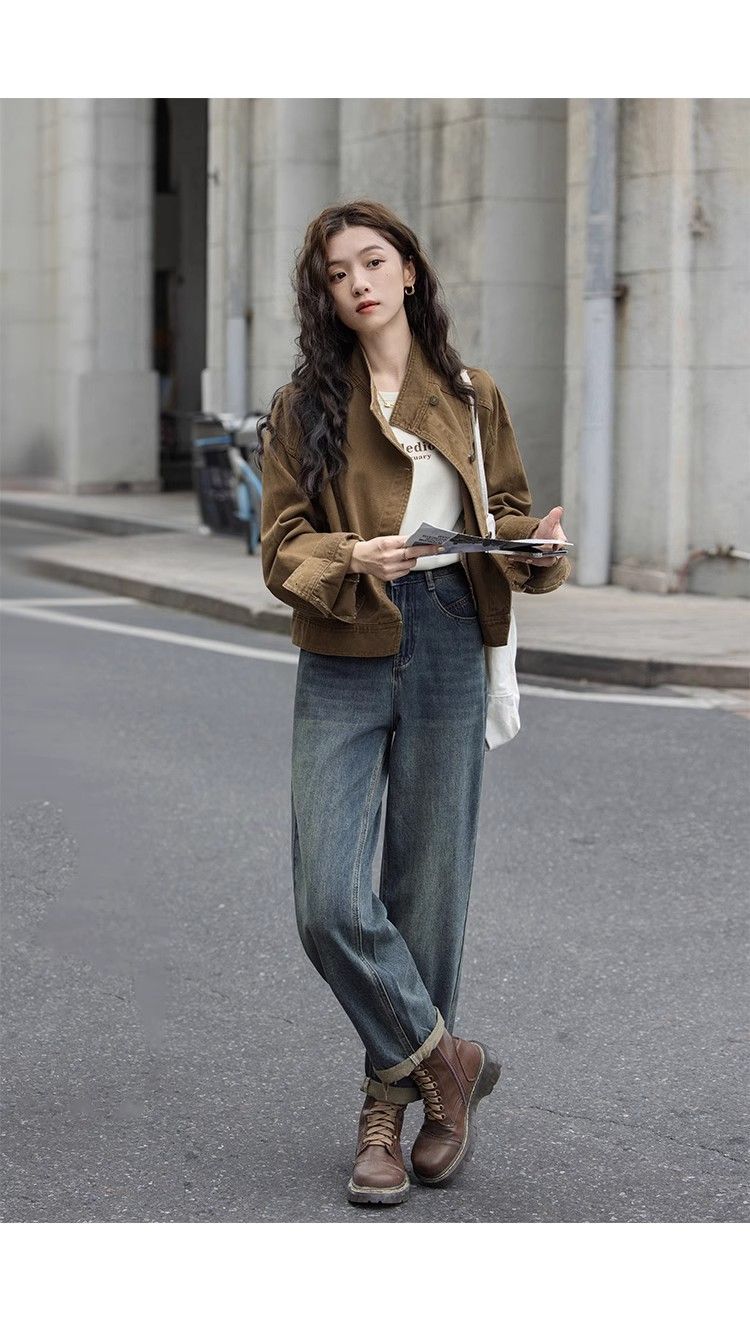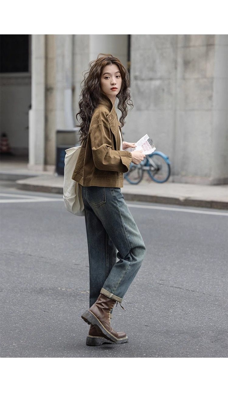 한국식 레트로 툴링 수직 칼라 재킷 코트 여성의 가을 새로운 오토바이 스타일 느슨한 캐주얼 짧은 자켓 탑