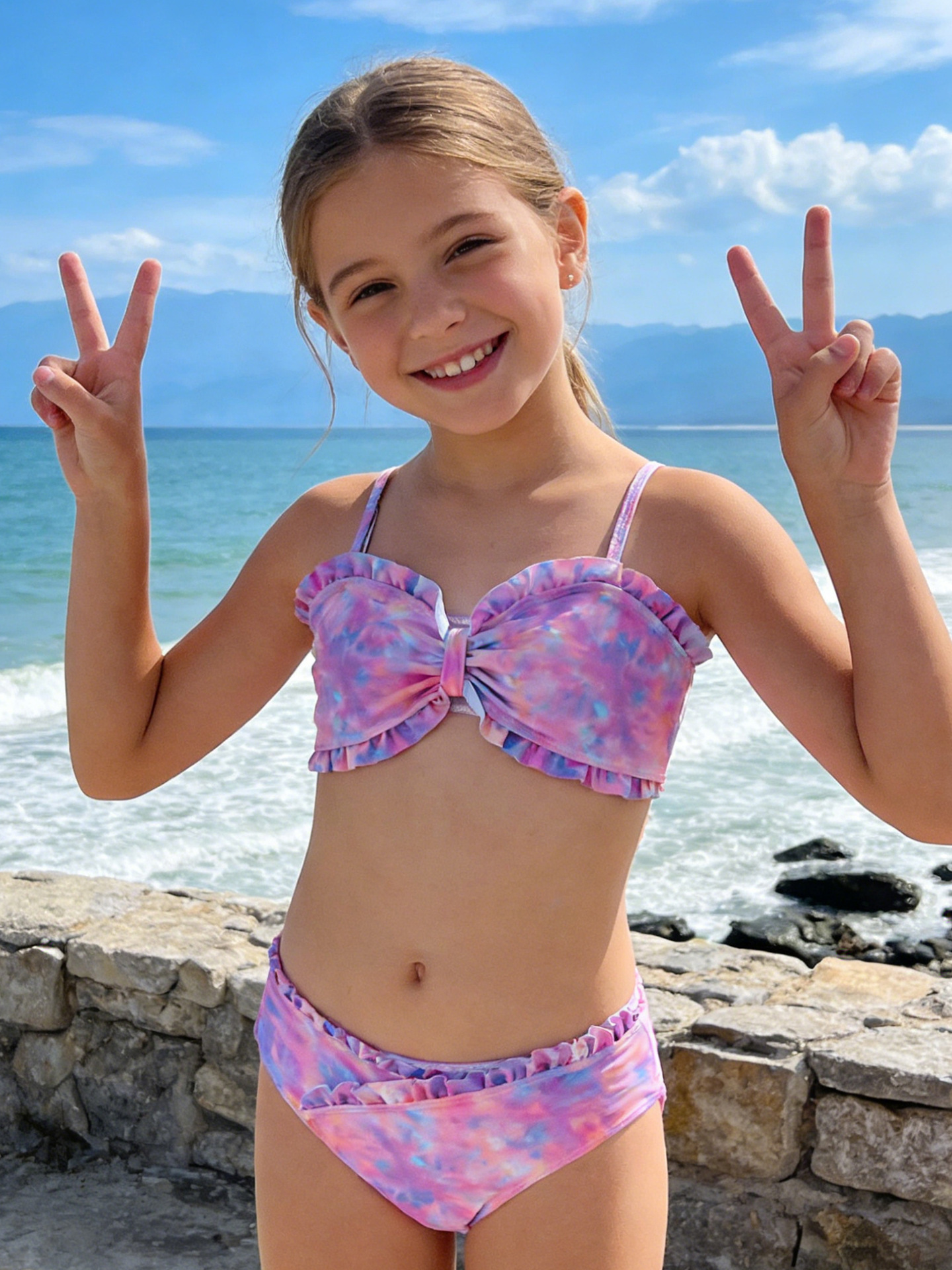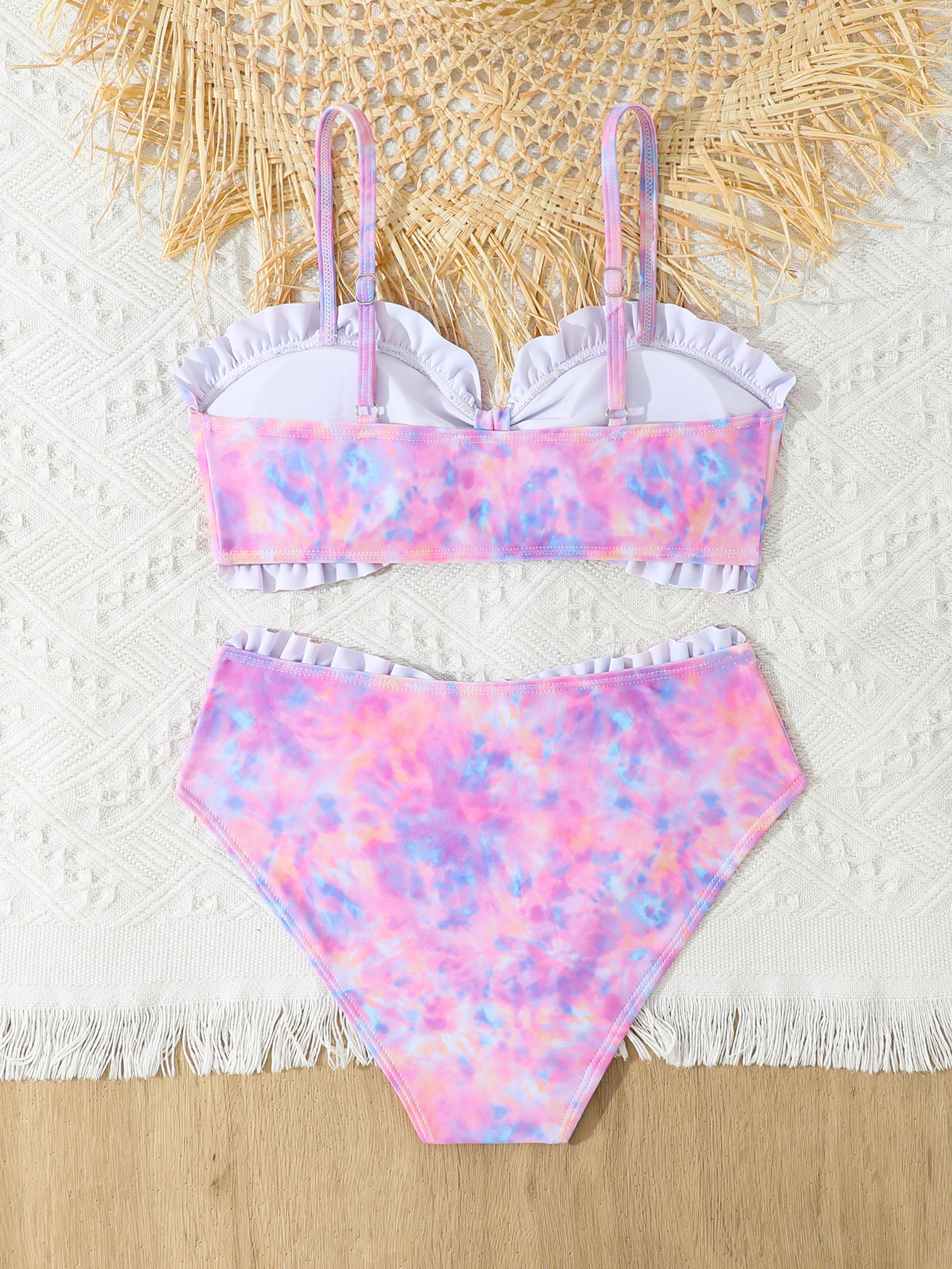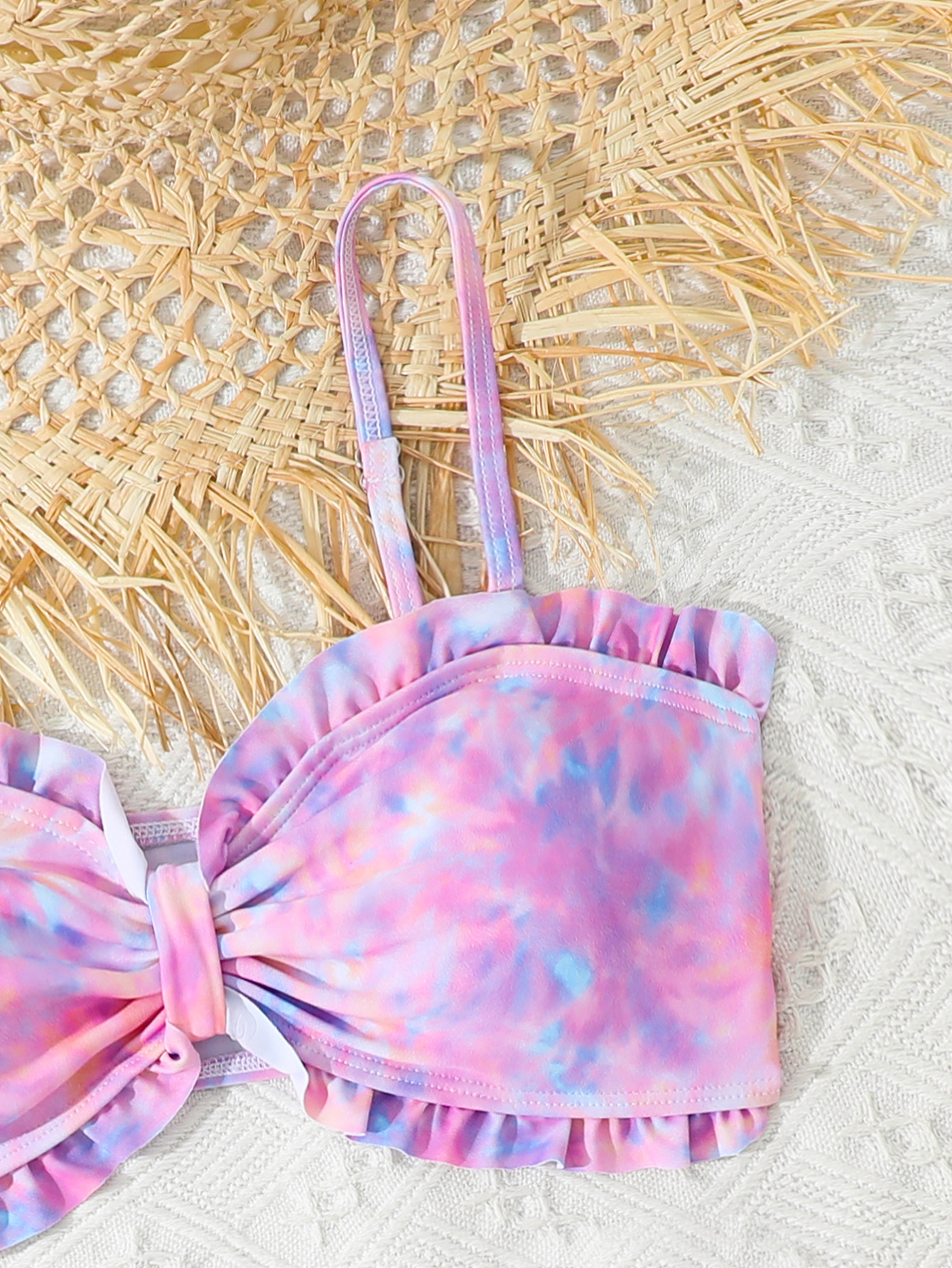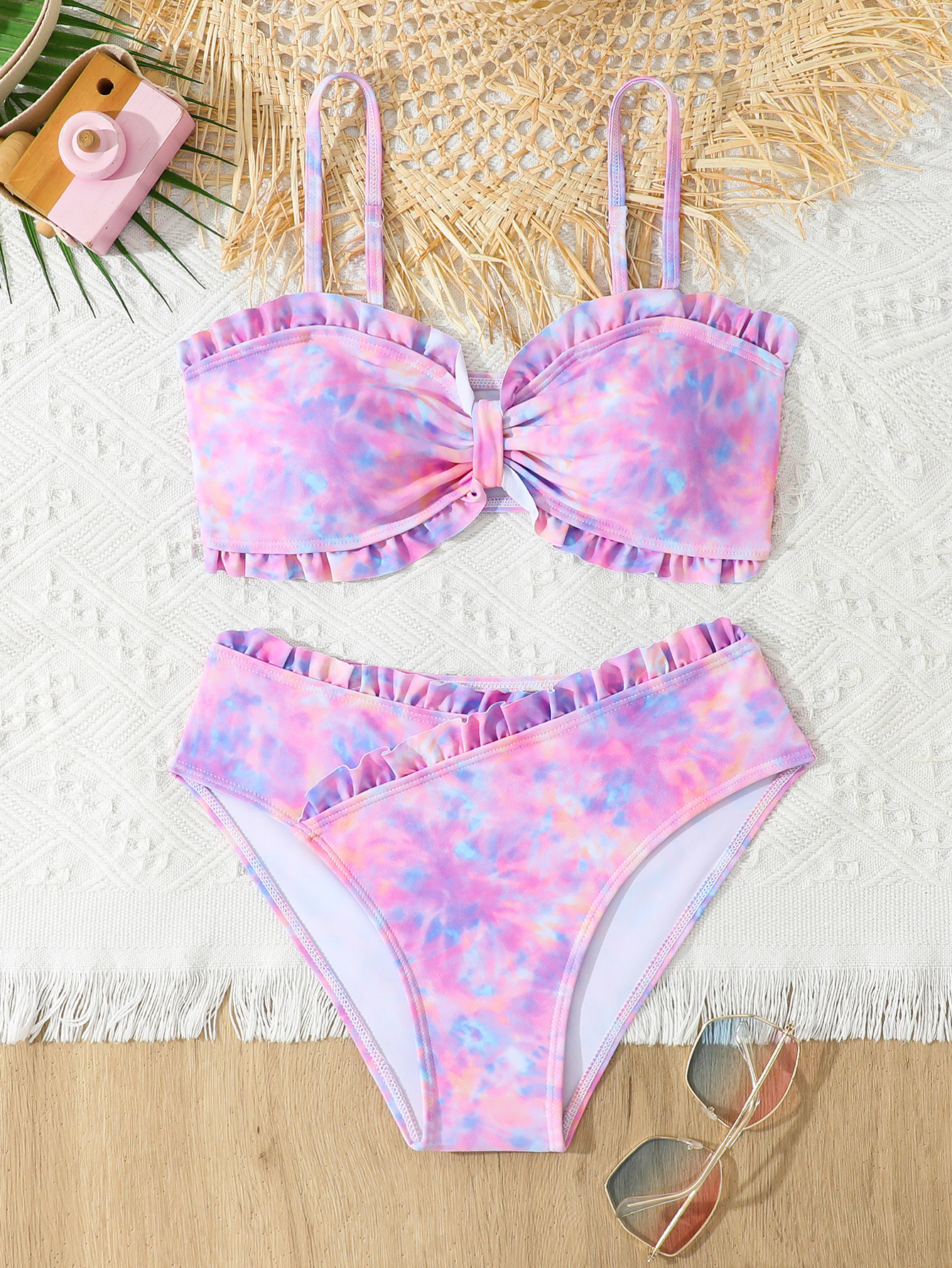 2025 새로운 소녀 분할 수영복 어린이 2 조각 슬링 이어 엣지 타이 다이 수영복 주니어, 중, 빅 키즈 학생