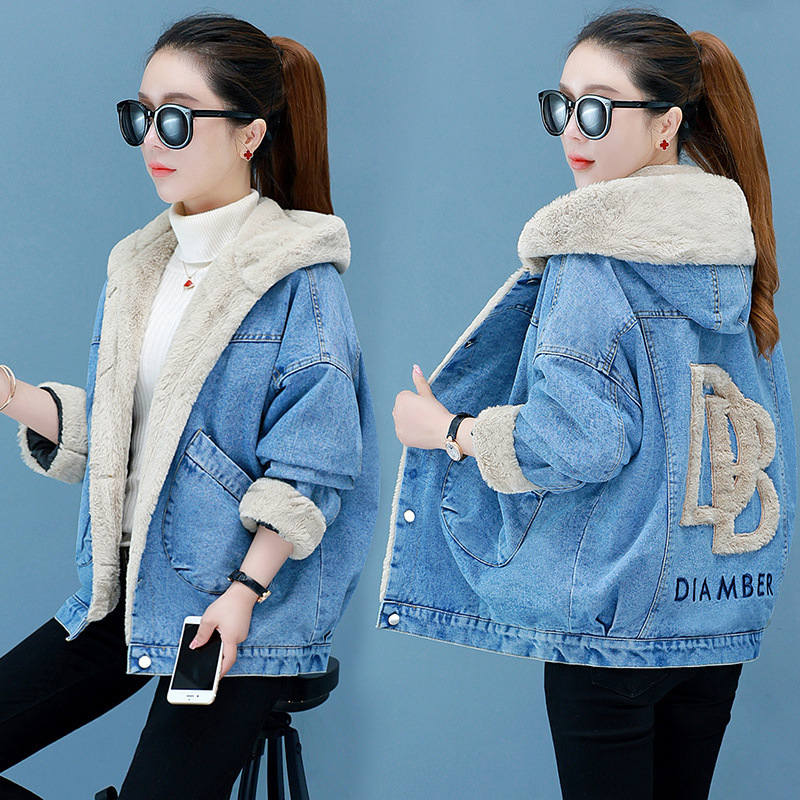 기모 재킷 여성 캠퍼스 스타일 가짜 양고기 양털 데님 재킷 세련된 코튼 패딩 재킷 스몰 사이즈 따뜻함스토어 가기