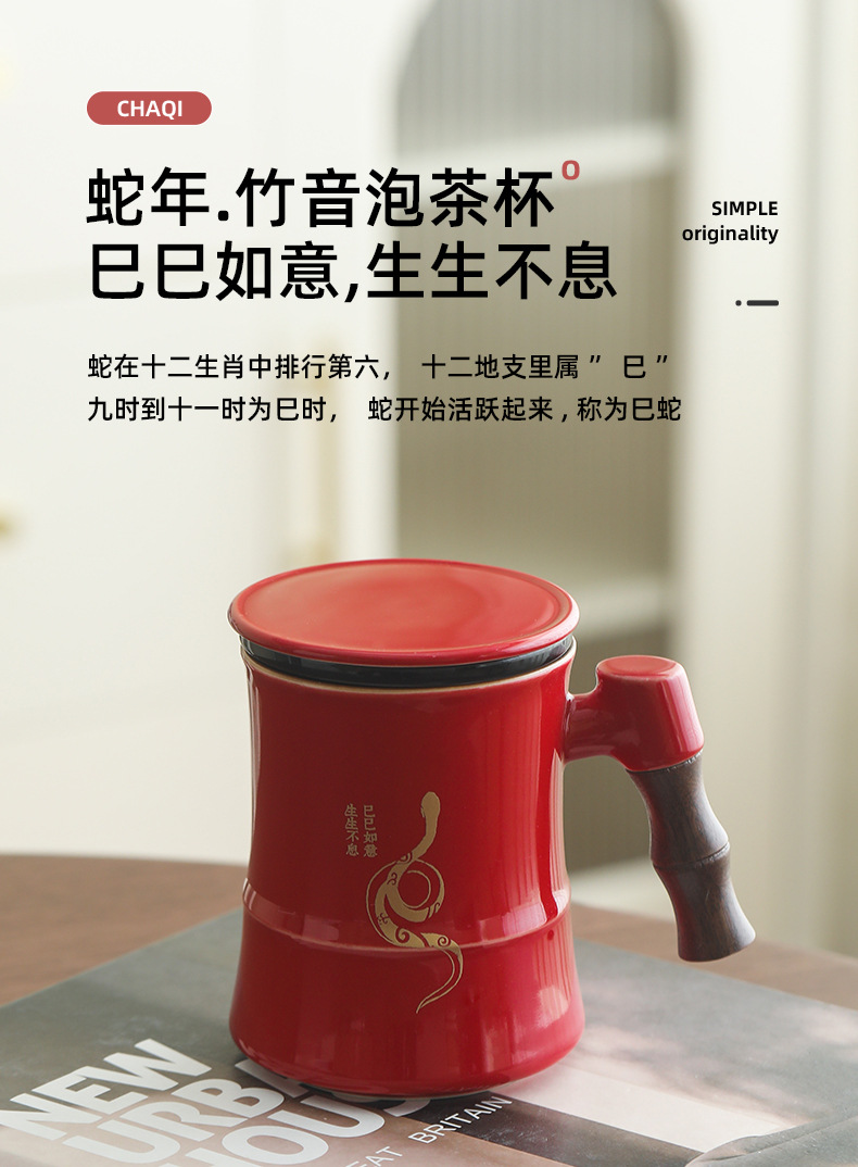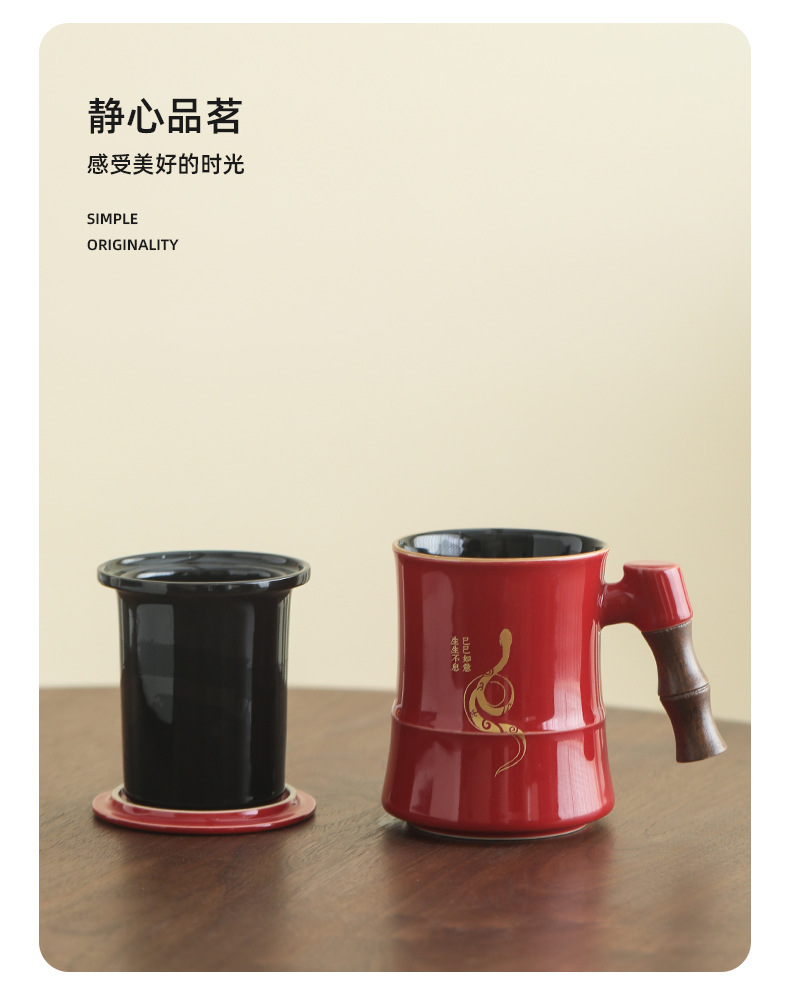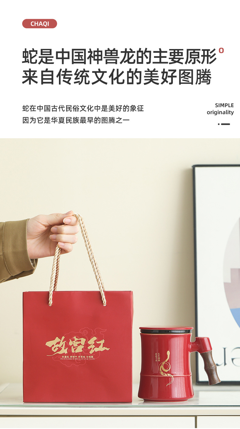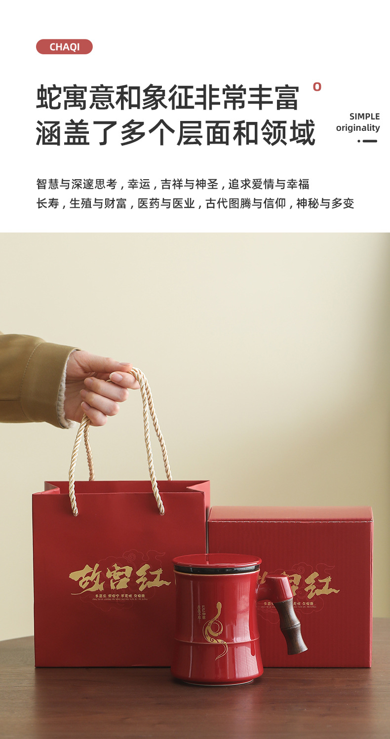 뱀의 해 2025 신년 고궁 박물관 레드 컵 차 분리 티 컵 세라믹 컵 뚜껑 필터 동반식