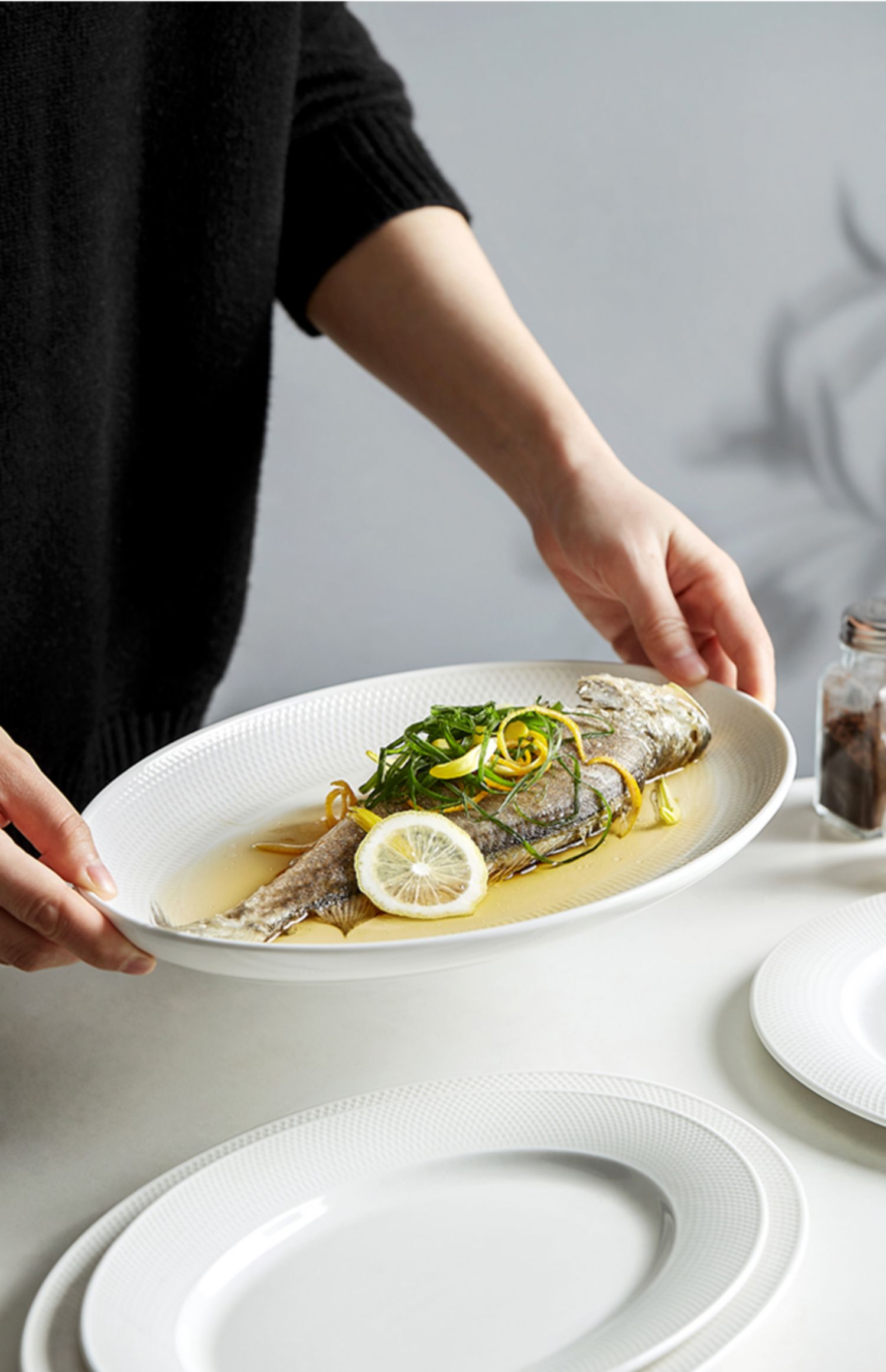 Tiantai Hualian 2024 새로운 타원형 생선 접시 가구 찐 생선 접시 창조적 인 북유럽 세라믹 접시스토어 가기