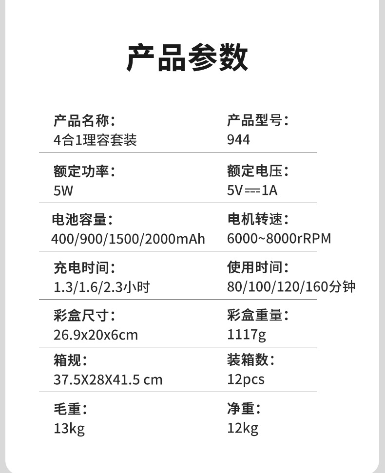 产品型号:944子母机套装+剃须刀+鼻毛器(4套装);
