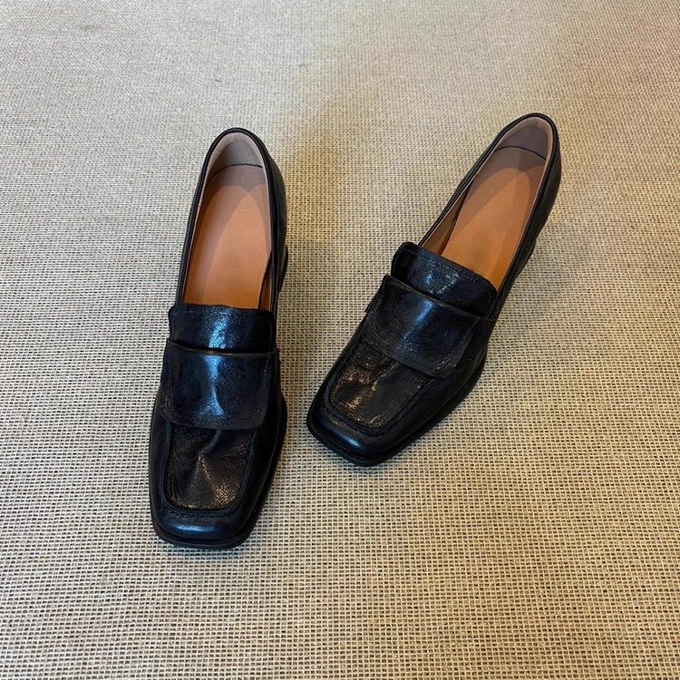 양가죽 버전 ~ 문학 복고풍 가죽 사각 발가락 작은 가죽 신발 여성 통근 하이힐 싱글 레이어 신발 원스텝 두꺼운 힐 로퍼스토어 가기