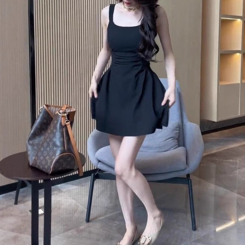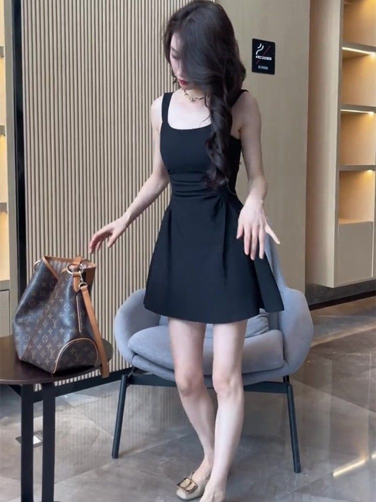 여름 프랑스 기질 원피스 작은 검은 색 원피스 여성의 순수한 허리 A 자형 서스펜더 원피스