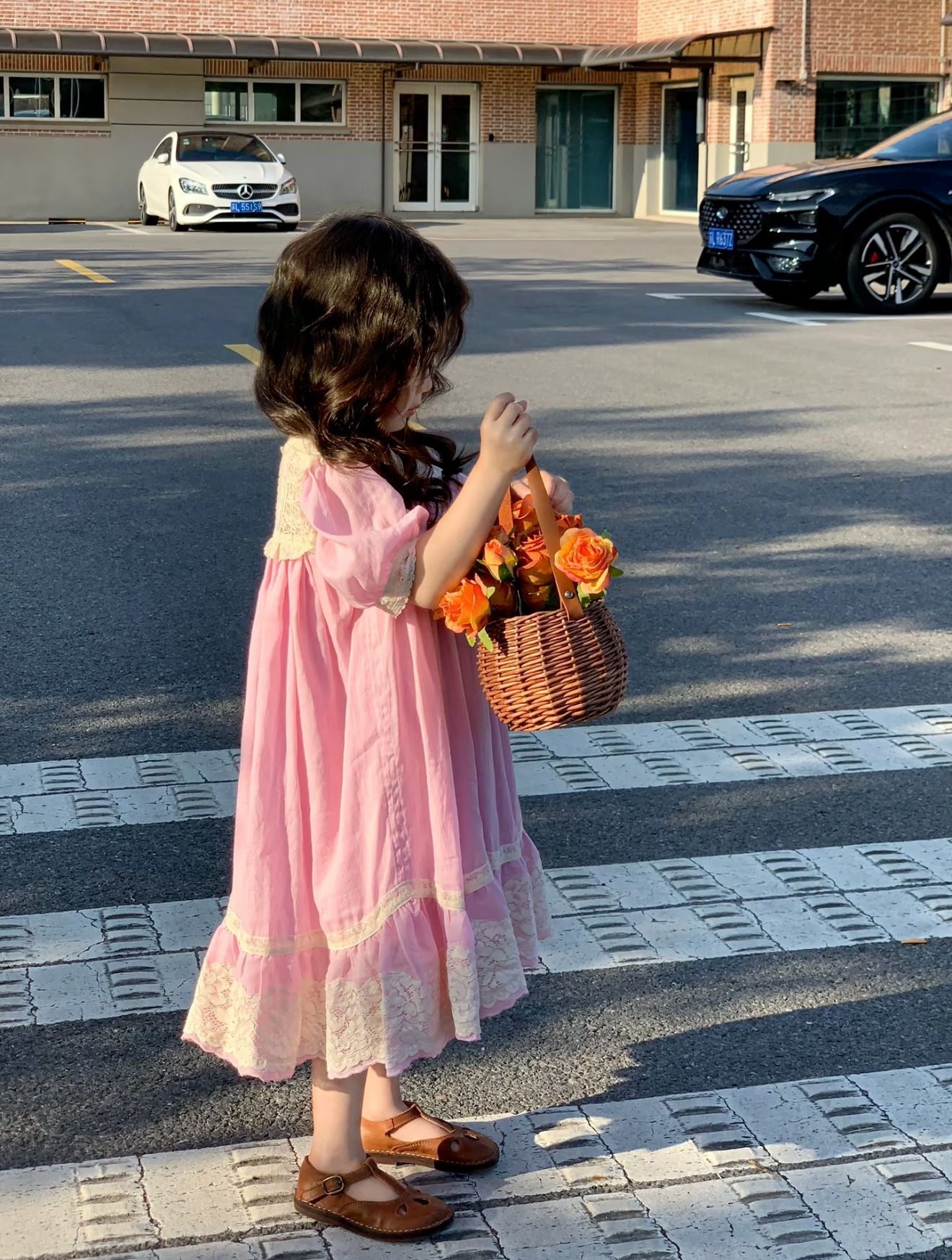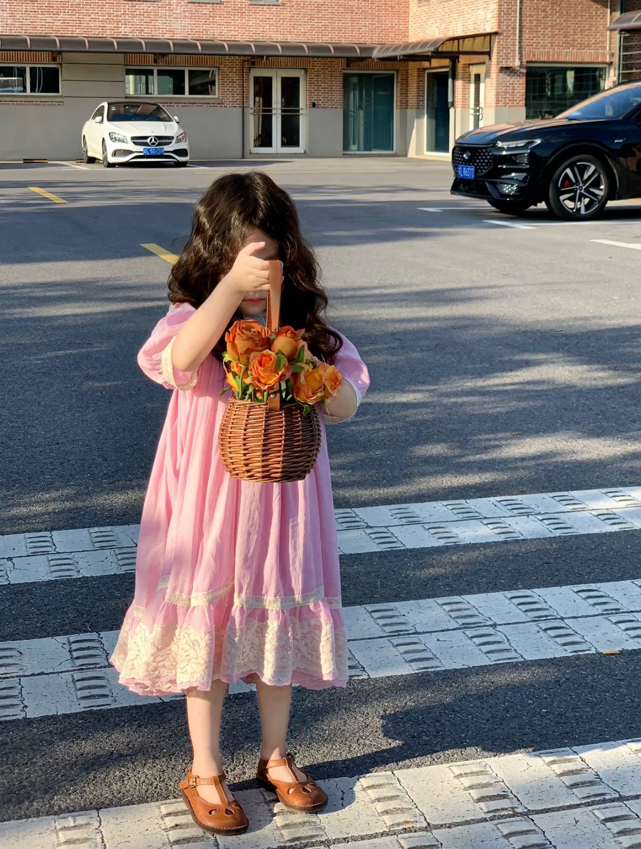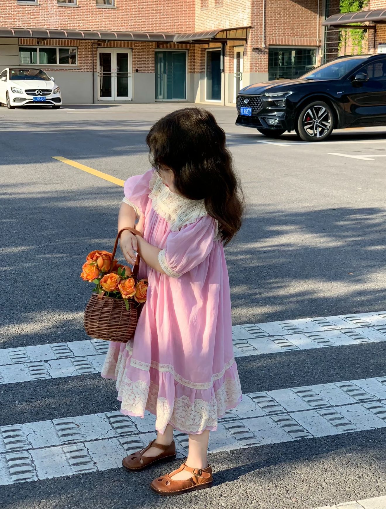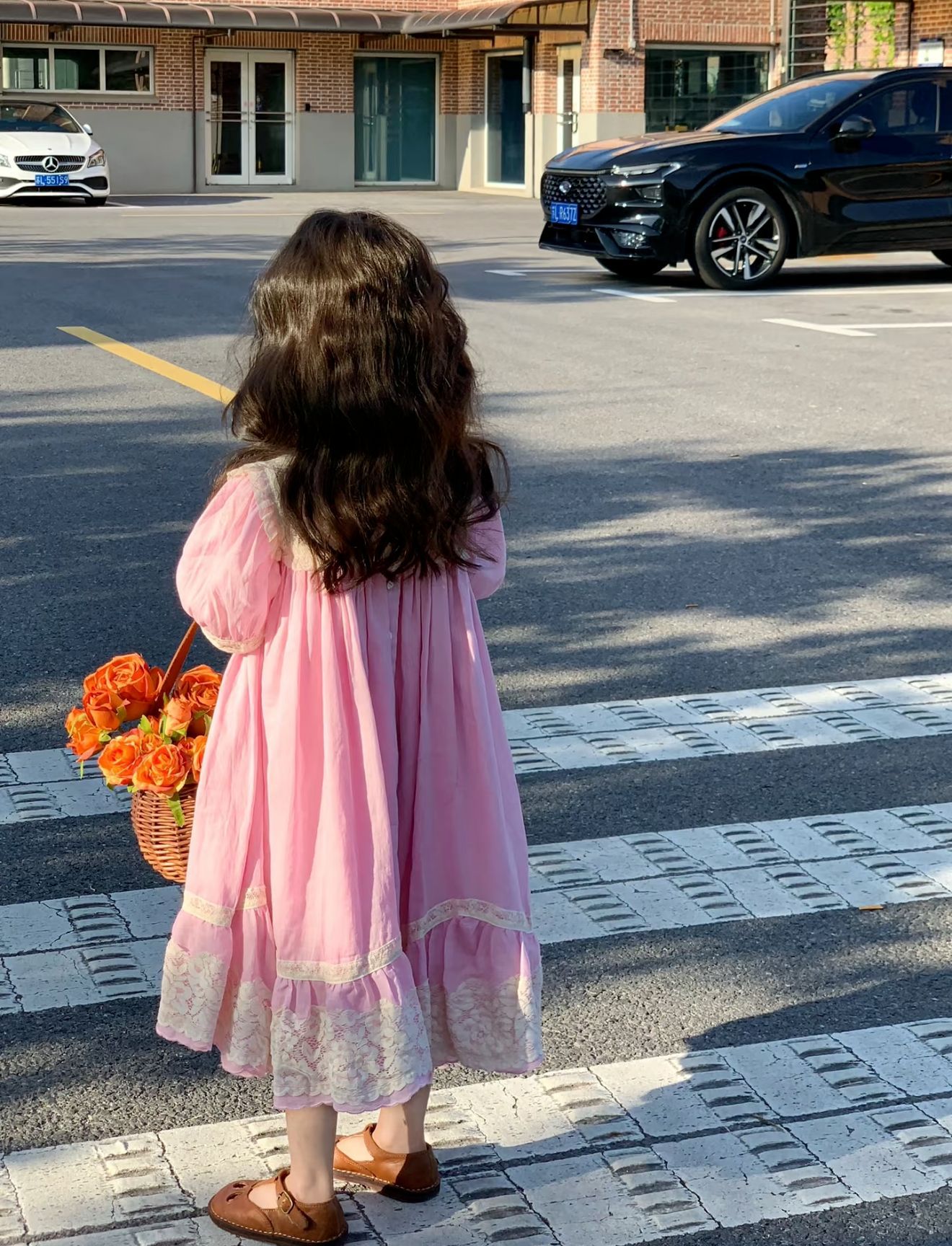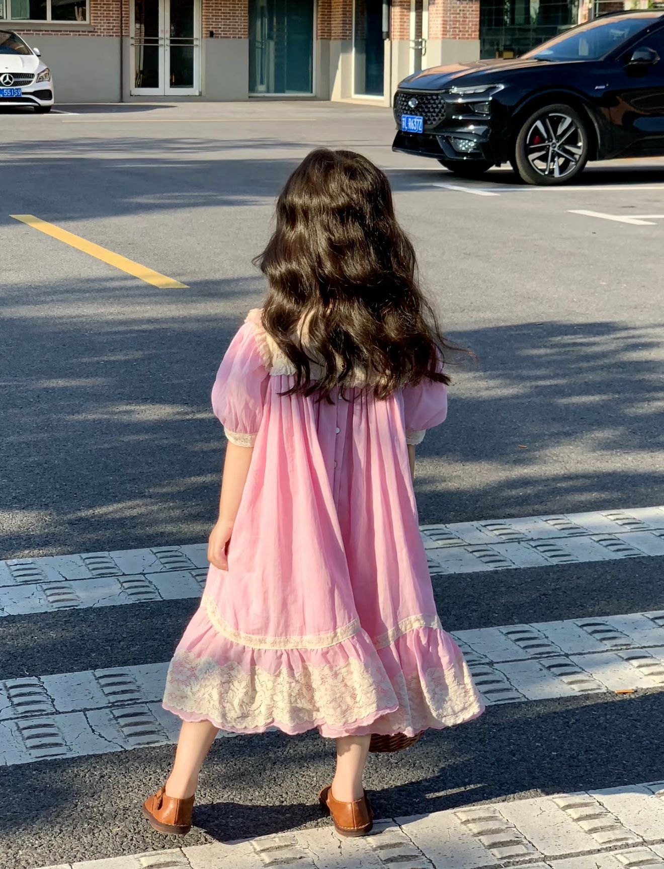 봄/여름 2025 ~ 한국 스타일 소녀의 달콤한 레이스 핑크 퍼프 소매 대형 스윙 우아한 디자인 공주 원피스