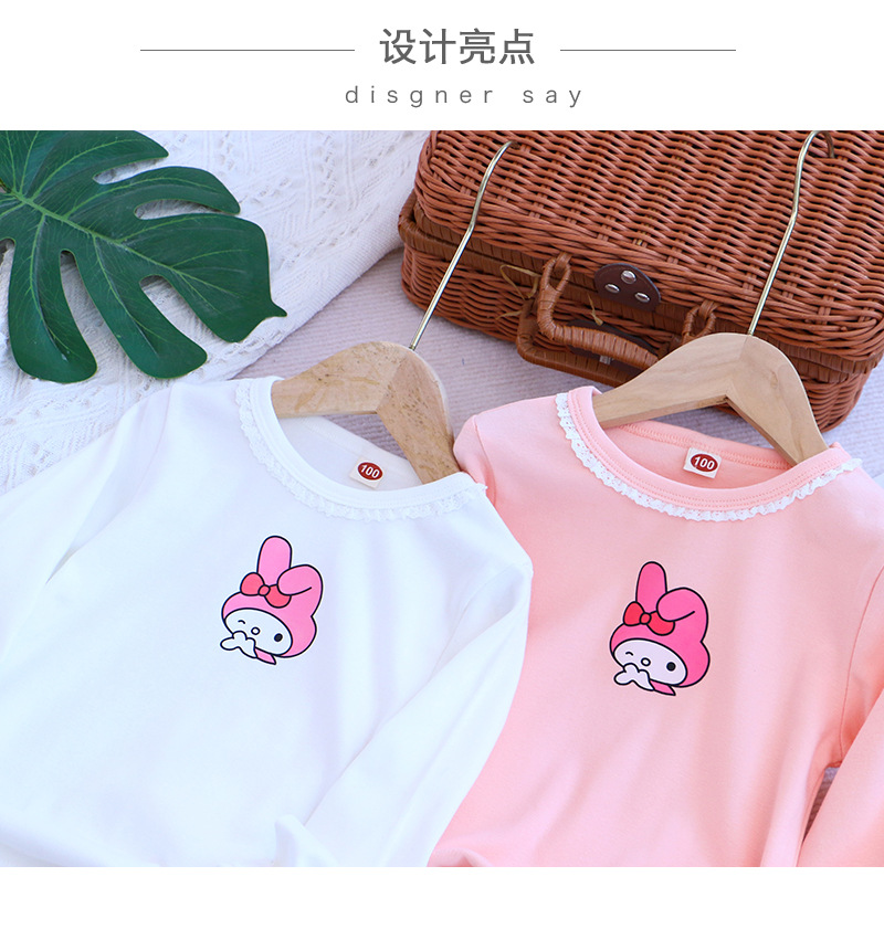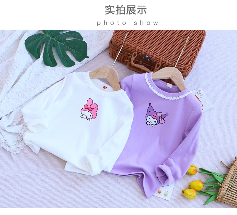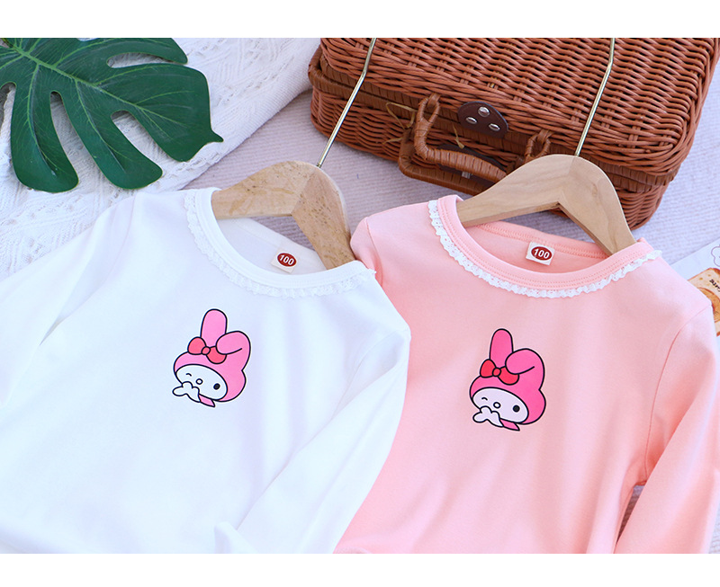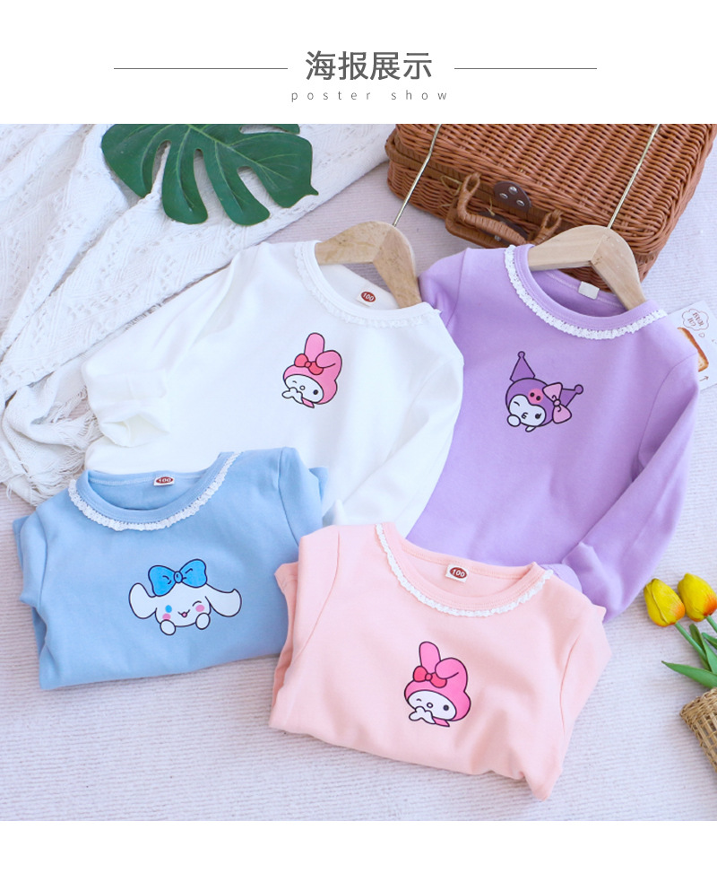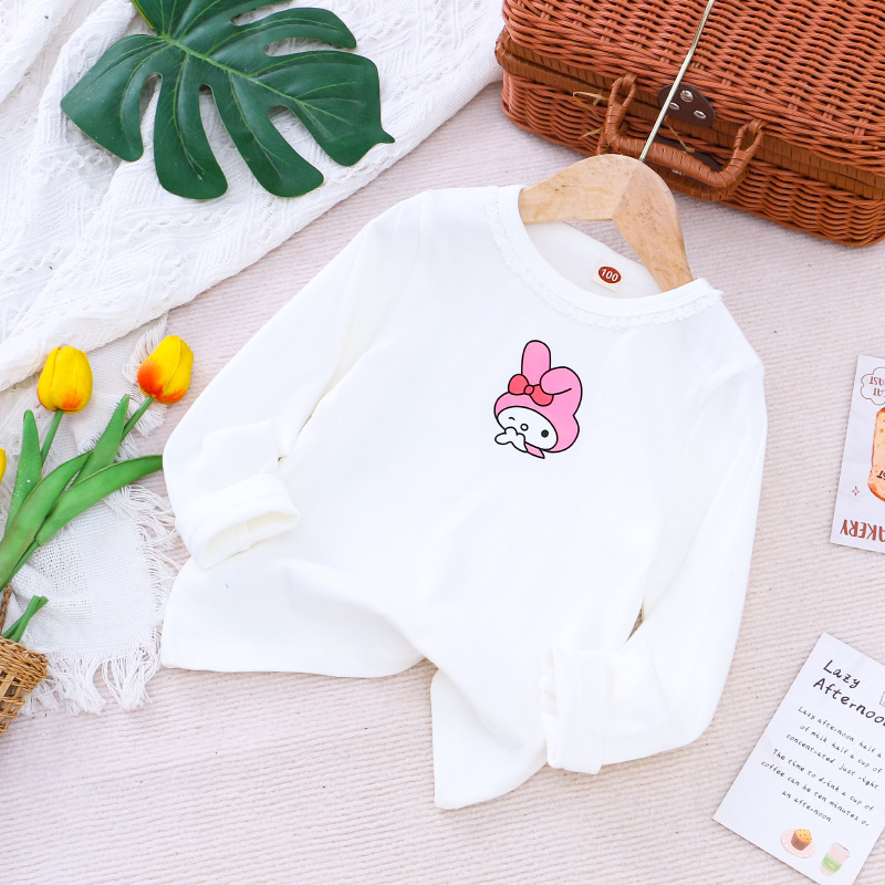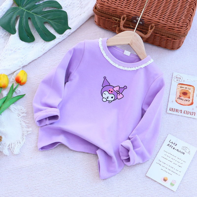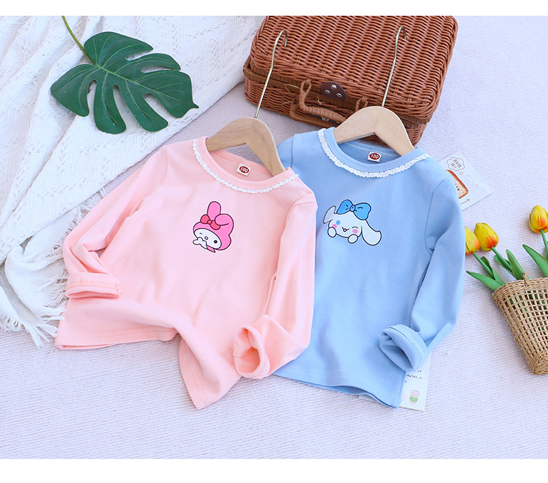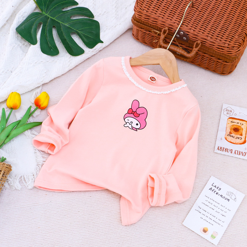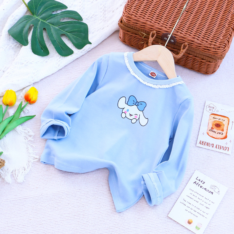 2025 새로운 아동복 봄과 가을 소녀베이스 셔츠 어린이 티셔츠 만화 인쇄 레이스 라운드 넥 내부 탑