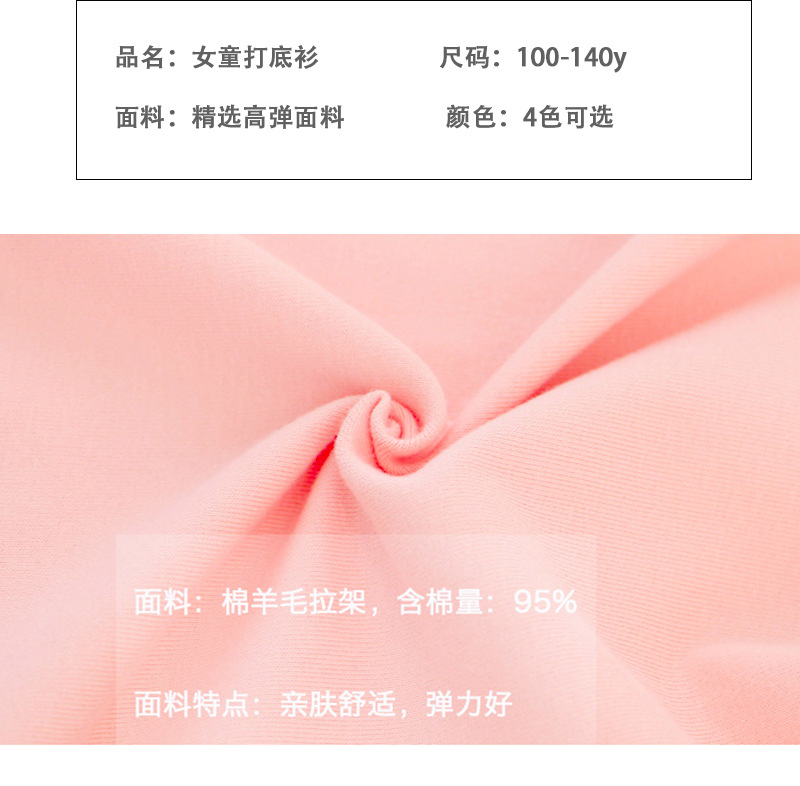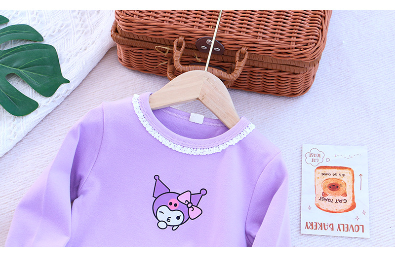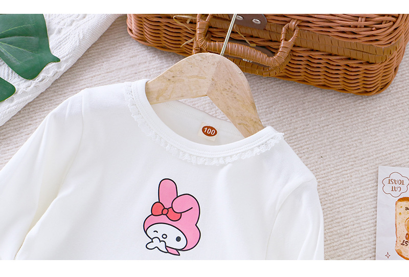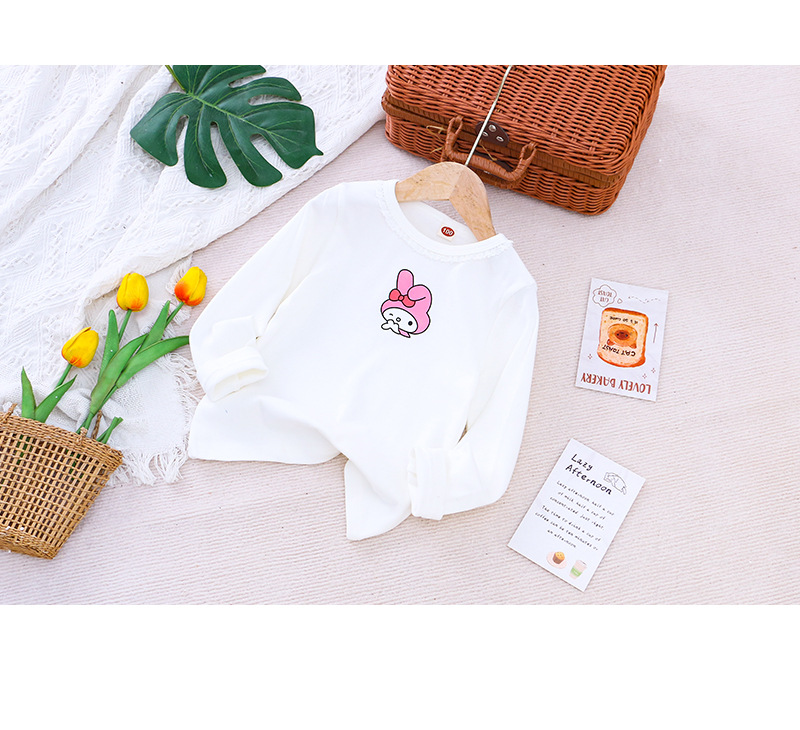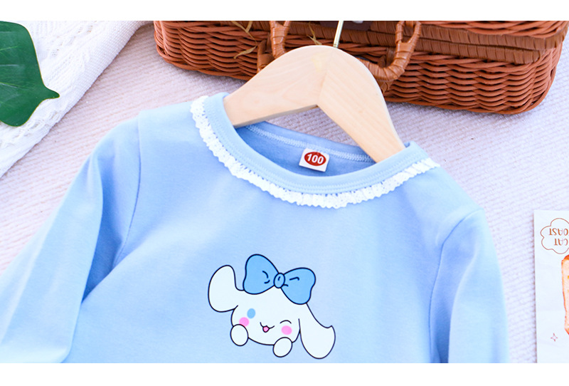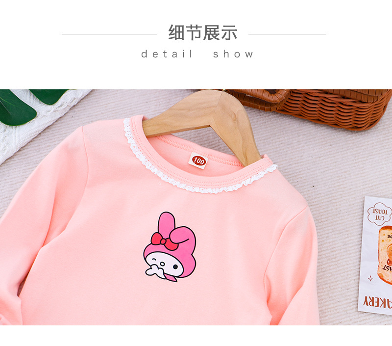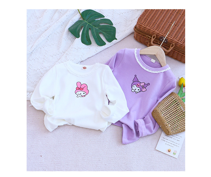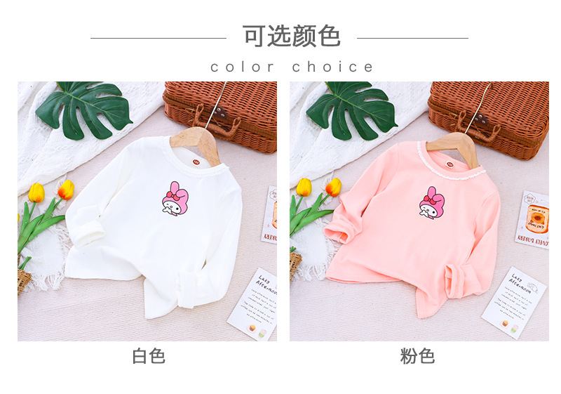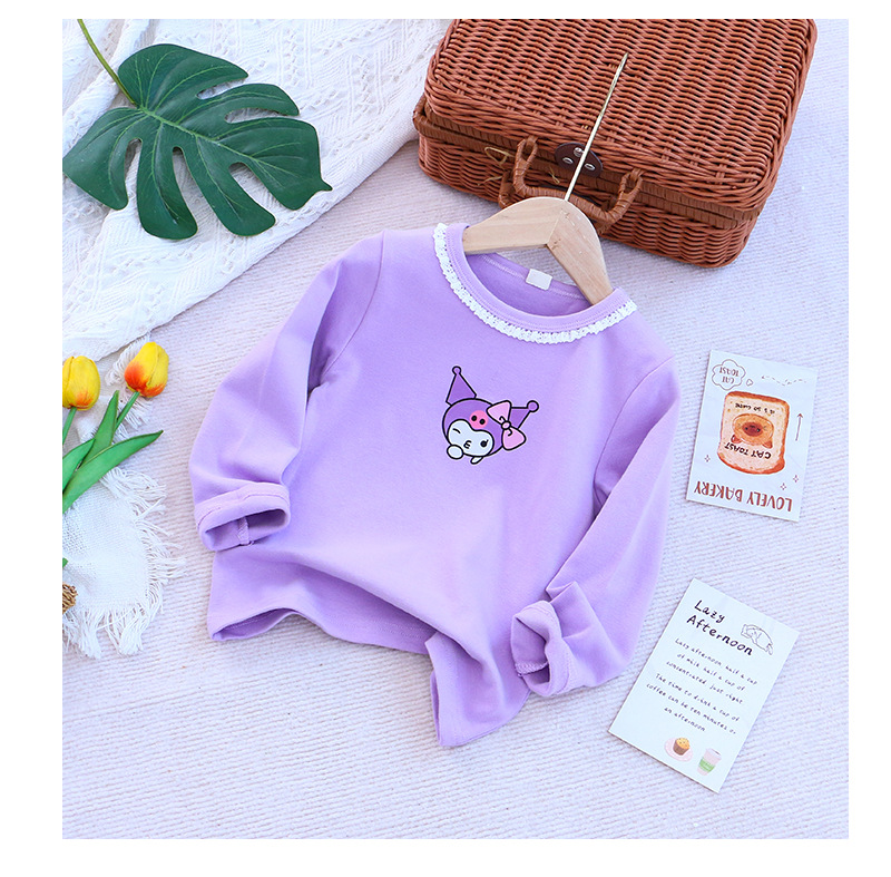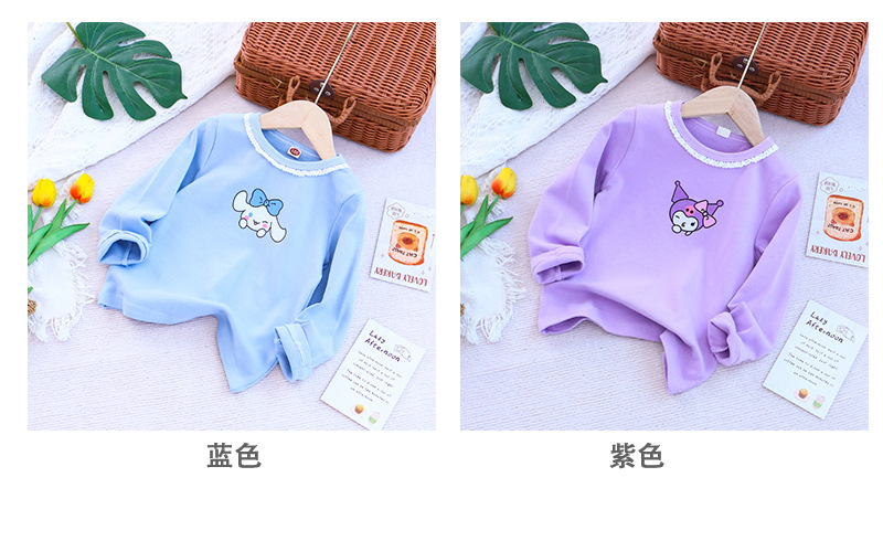 2025 새로운 아동복 봄과 가을 소녀베이스 셔츠 어린이 티셔츠 만화 인쇄 레이스 라운드 넥 내부 탑