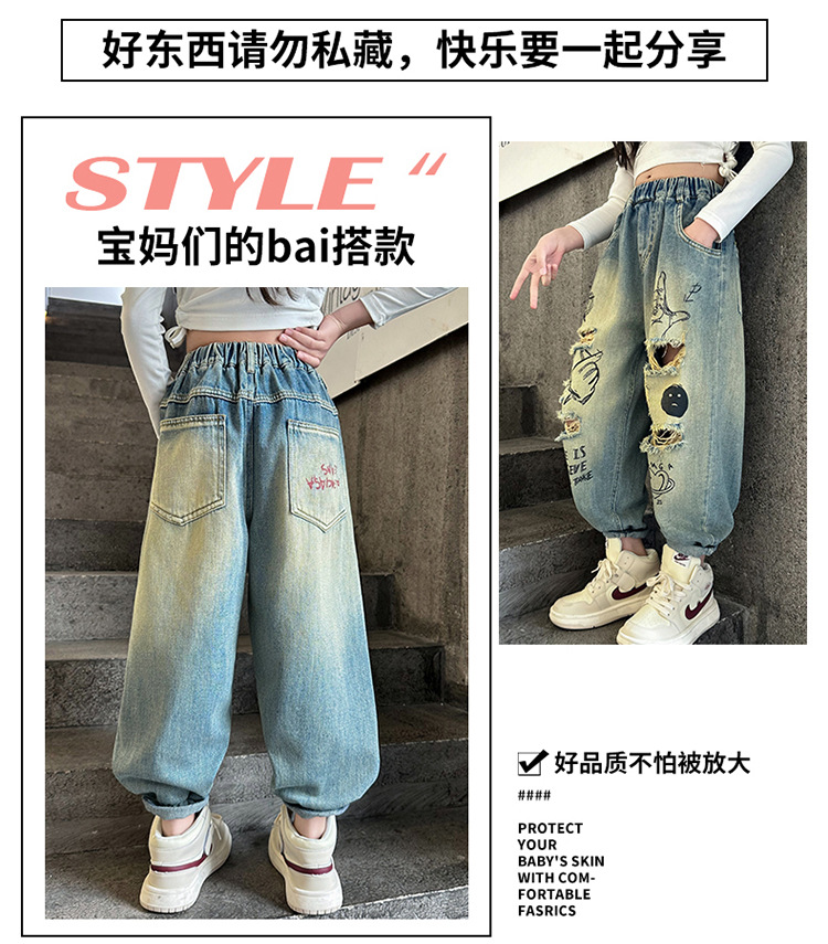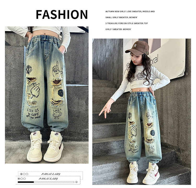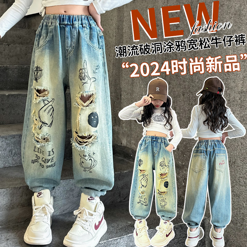 소녀의 봄 찢어진 낙서 청바지 한국식 큰 어린이 느슨한 캐주얼 아빠 바지 겉옷 어린이 바지 도매스토어 가기