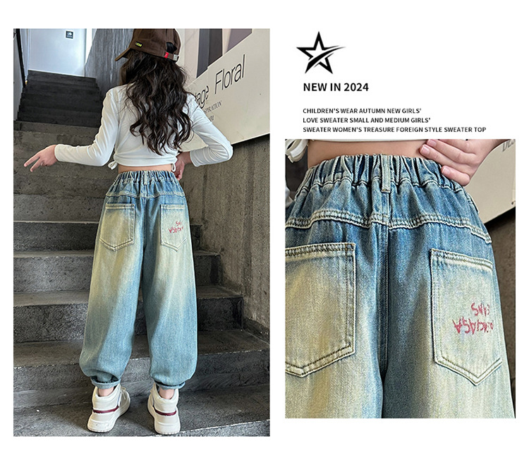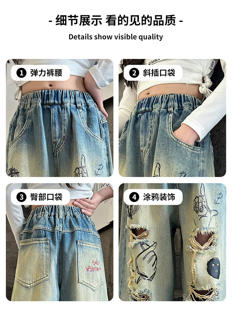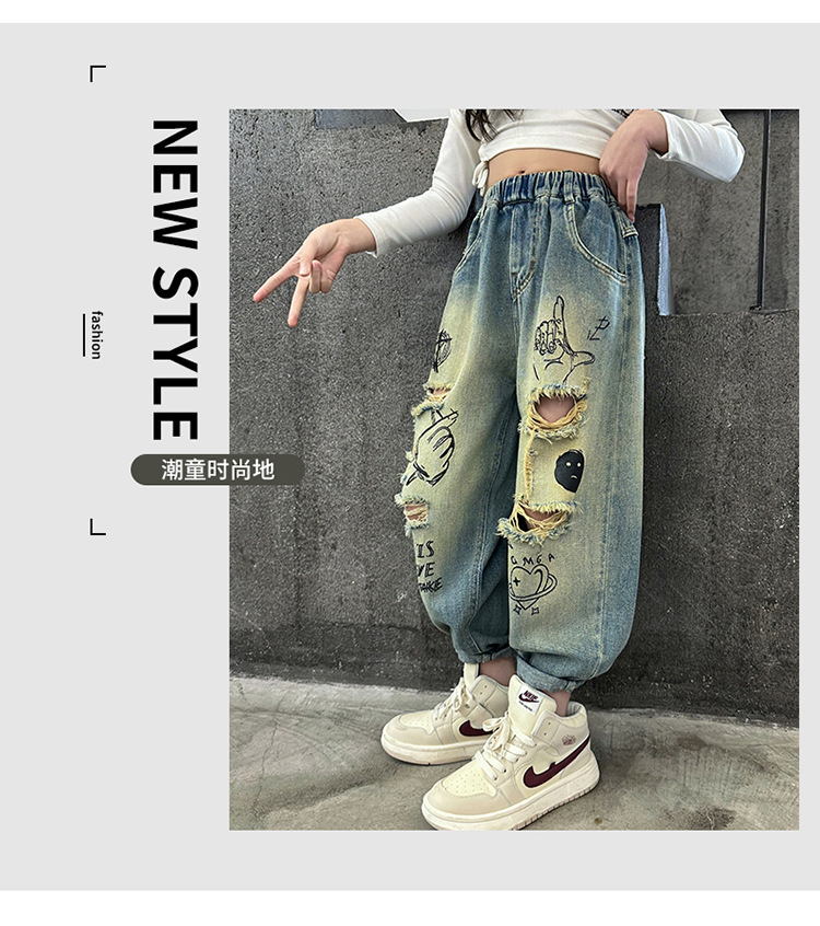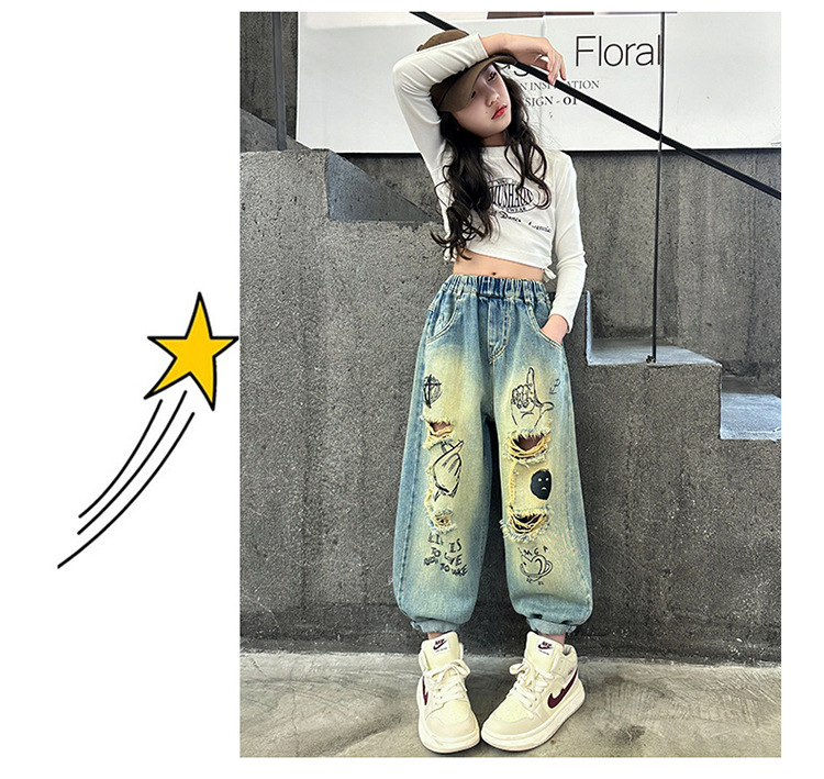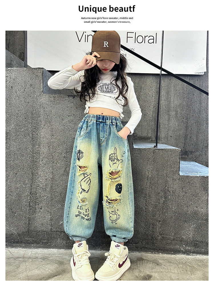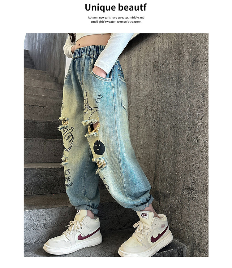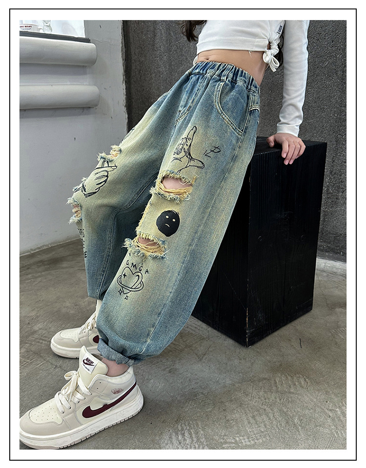 소녀의 봄 찢어진 낙서 청바지 한국식 큰 어린이 느슨한 캐주얼 아빠 바지 겉옷 어린이 바지 도매
