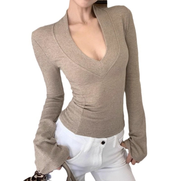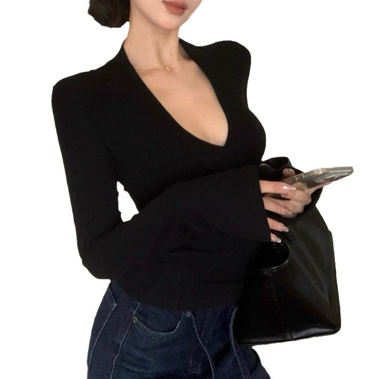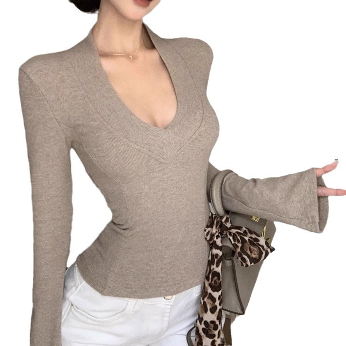 섹시한 V 넥 어깨 스웨터 긴팔 여성용 가을 및 겨울 기본 슬림 핏 내부 스트레치 슬림베이스 셔츠 탑