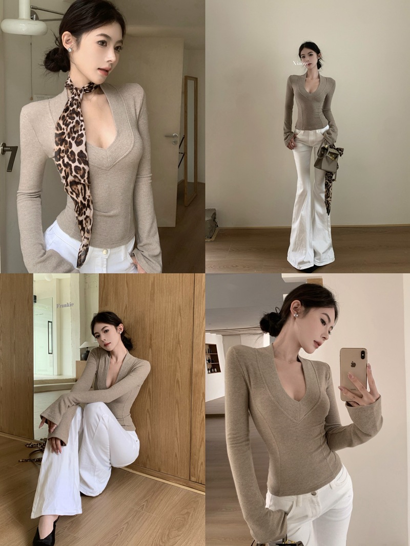 섹시한 V 넥 어깨 스웨터 긴팔 여성용 가을 및 겨울 기본 슬림 핏 내부 스트레치 슬림베이스 셔츠 탑스토어 가기