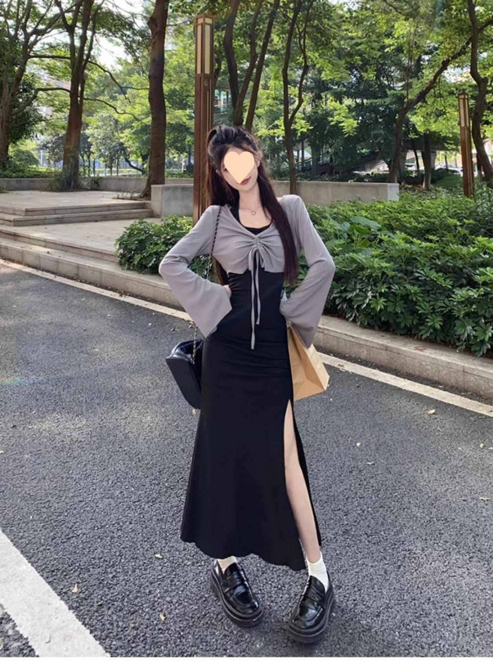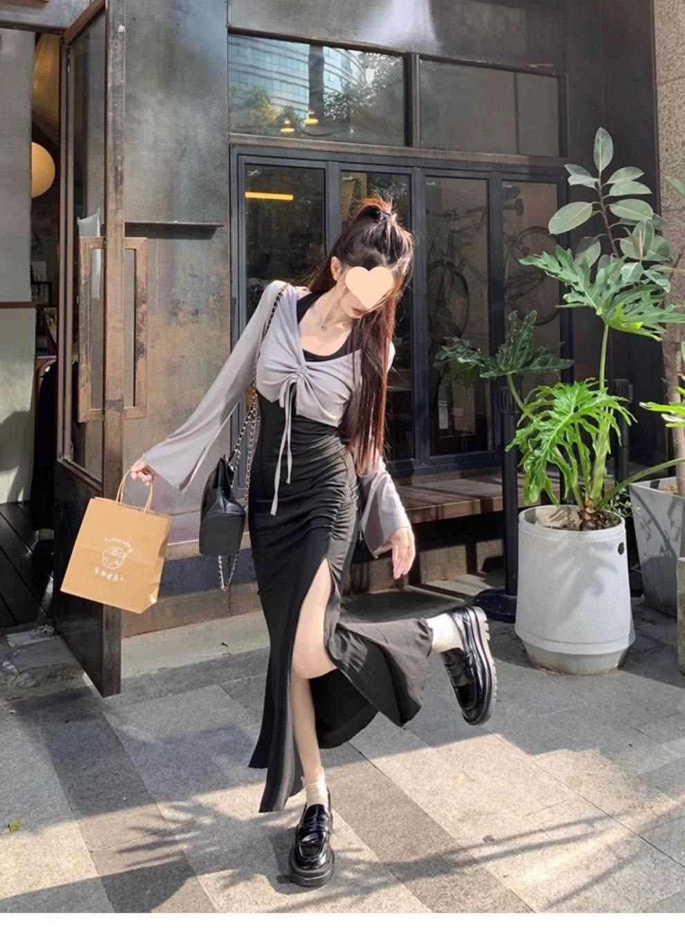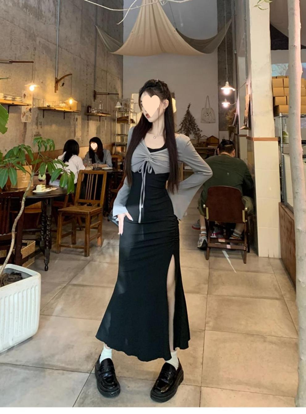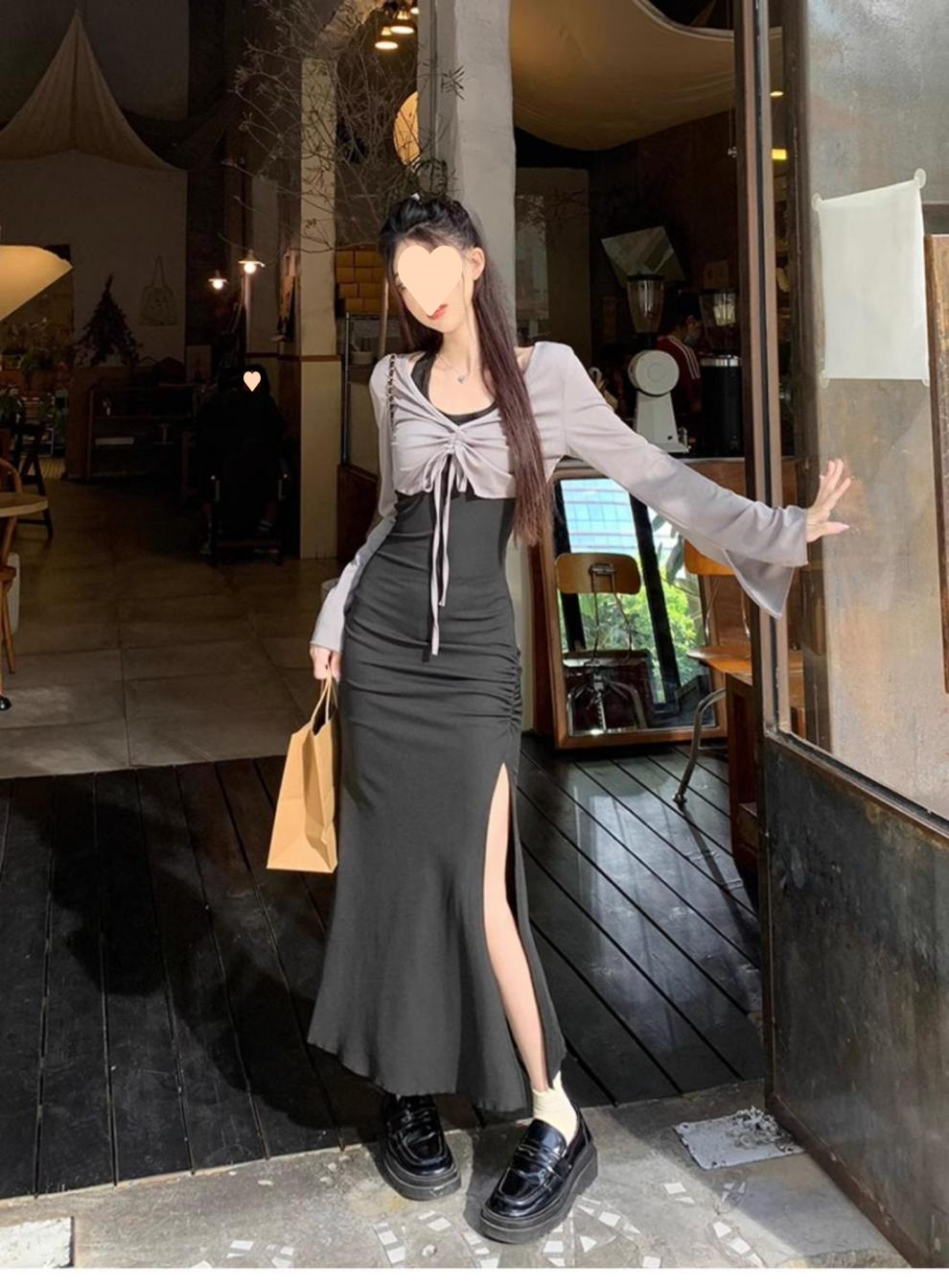 달콤하고 매운 검은 백조 작은 엄마 스타일 스커트 투피스 가을 순수한 욕망 허리 분할 엉덩이 교수형 목 원피스 여성 패션스토어 가기