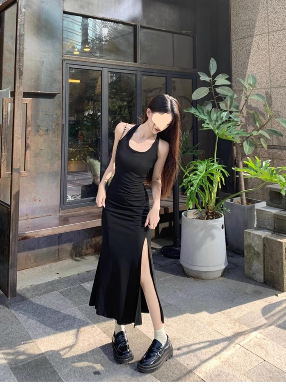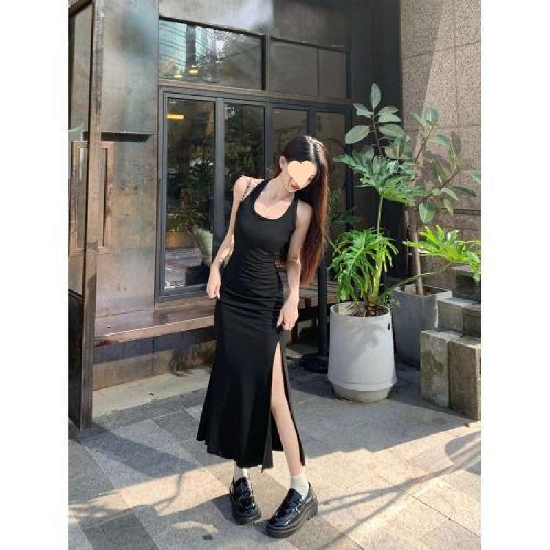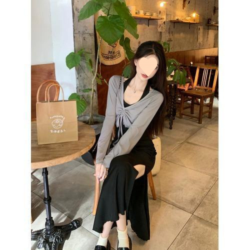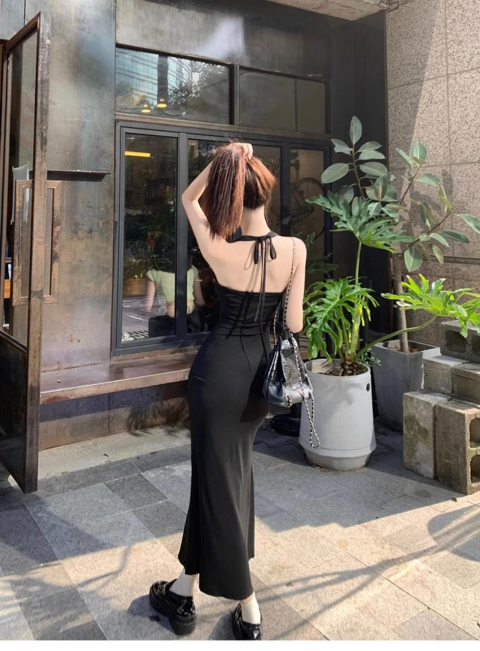 달콤하고 매운 검은 백조 작은 엄마 스타일 스커트 투피스 가을 순수한 욕망 허리 분할 엉덩이 교수형 목 원피스 여성 패션스토어 가기