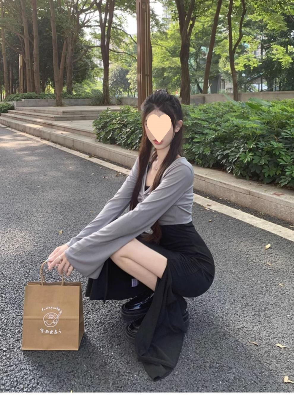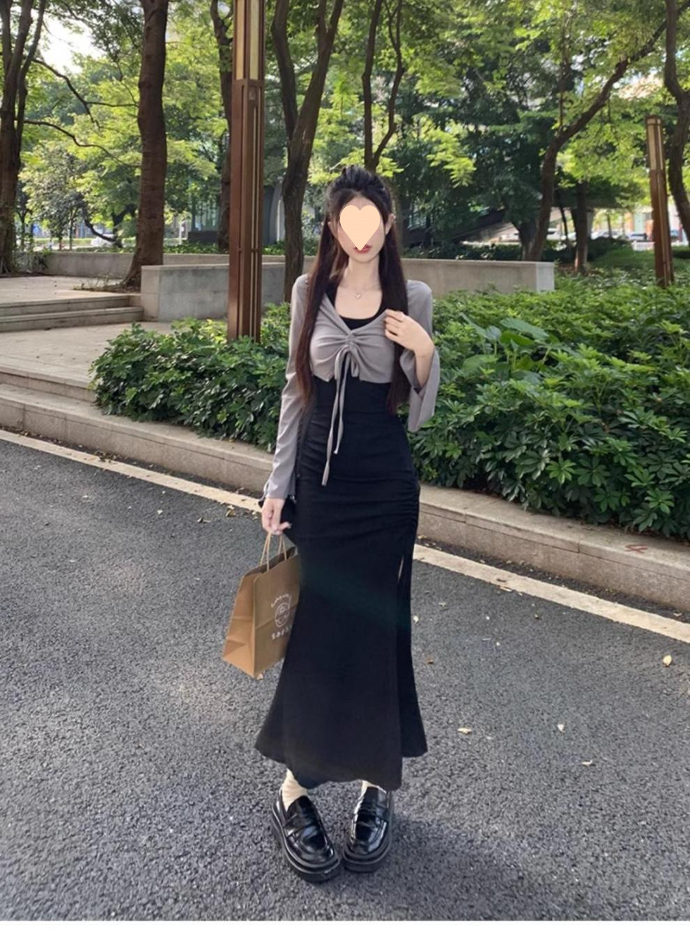 • 그레이 탑 + 블랙 롱 스커트