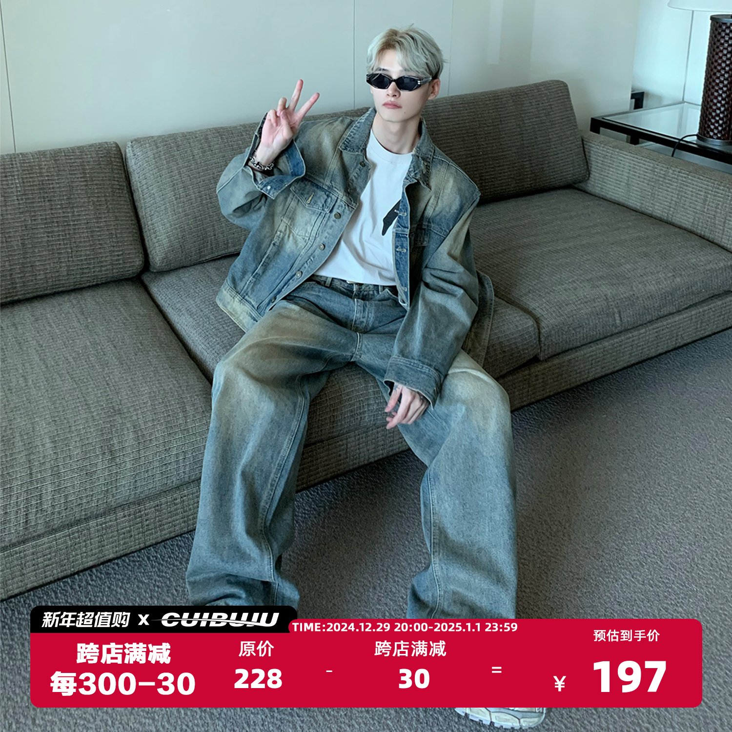 2024 봄과 가을 틈새 오래된 빈티지 세척 데님 세트 느슨한 어깨 패드 재킷 코트 스트레이트 바지 2 피스 세트스토어 가기