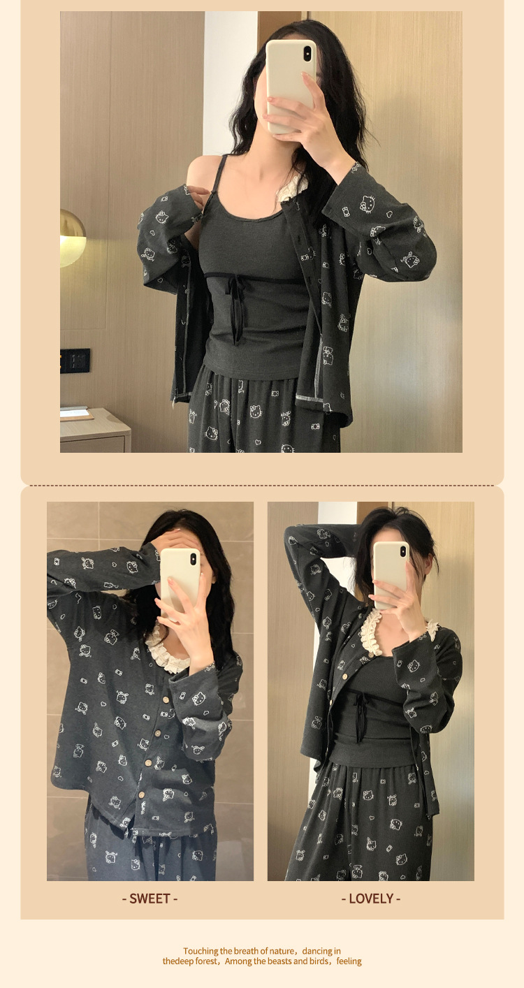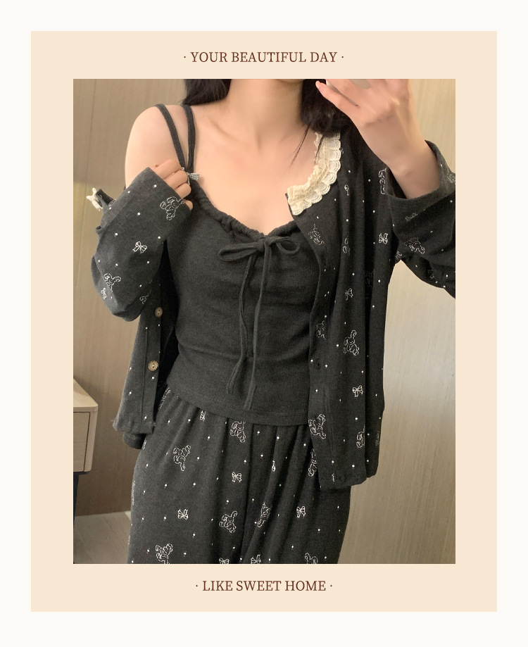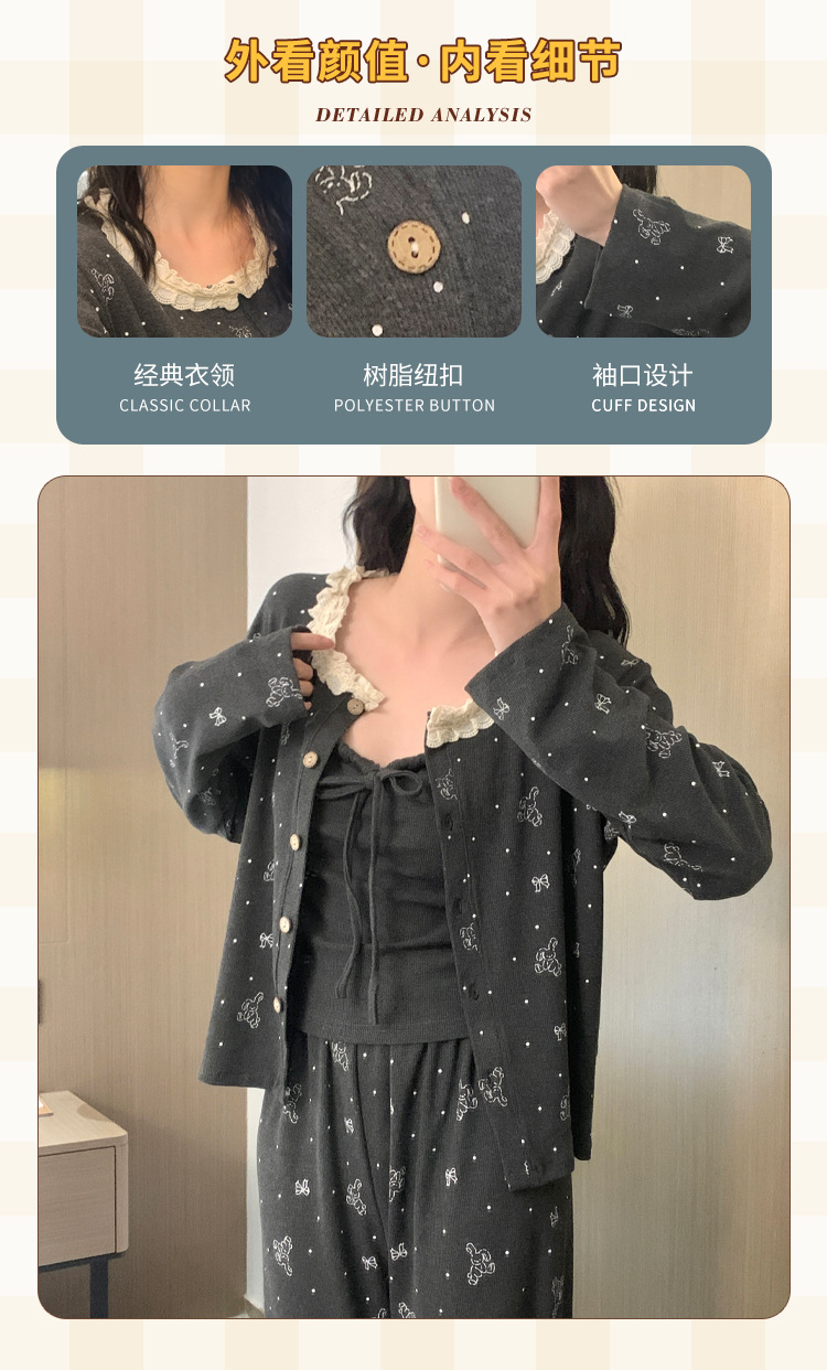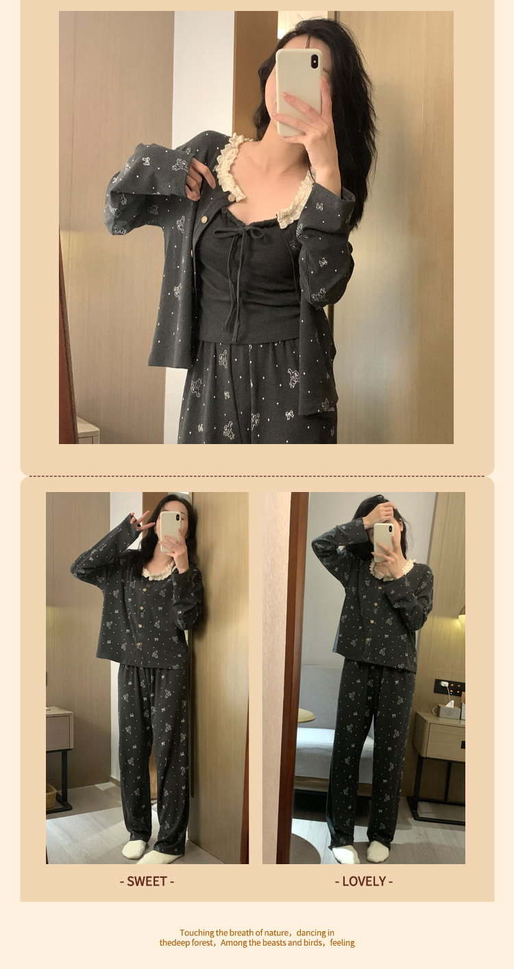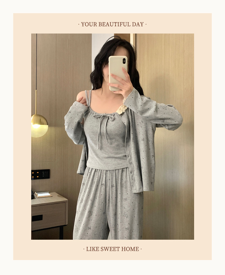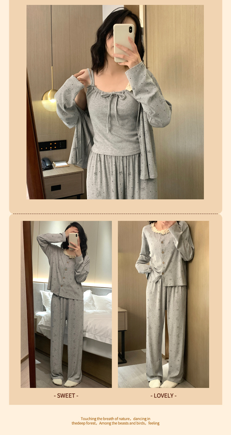 가슴 패드가 달린 게으른 스타일 모달 파자마 여성의 2025 봄과 가을 슬링 긴 소매 카디건 홈 옷 3 피스 세트스토어 가기