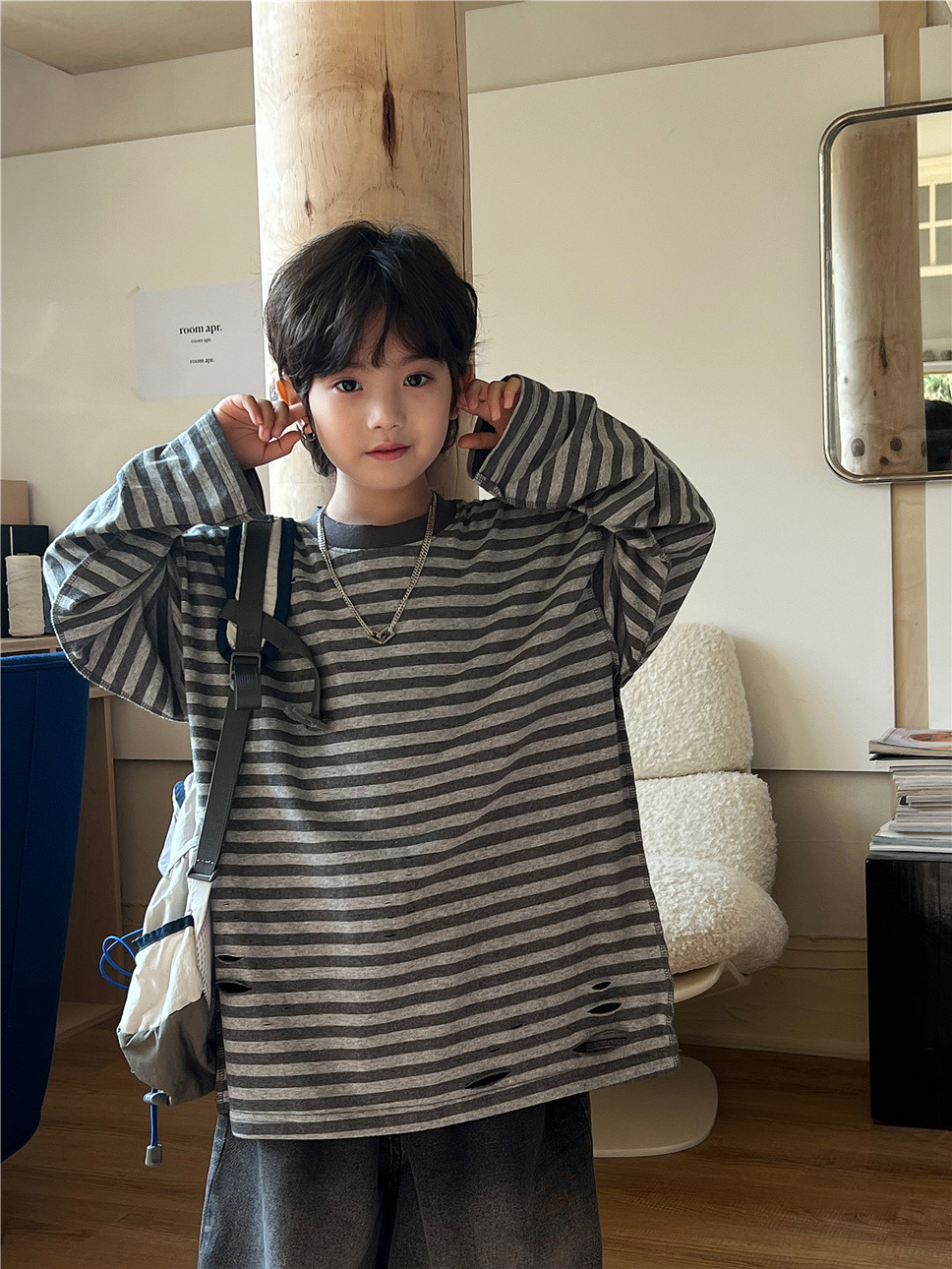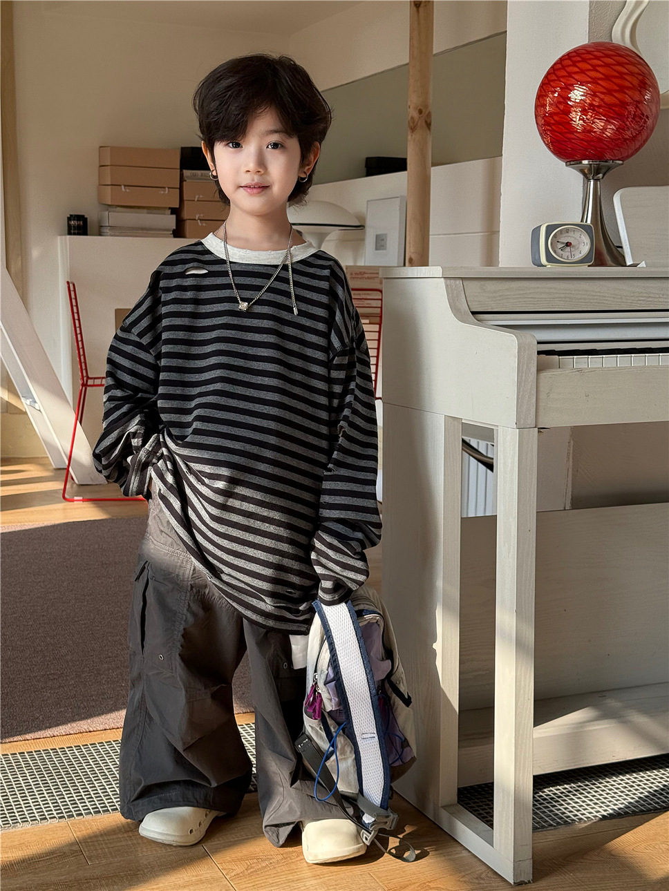 2025 아동복 봄 여름 아동용 줄무늬 바닥 셔츠 복고풍 컷 대비 색상 소년 소녀 유행 긴팔 티셔츠