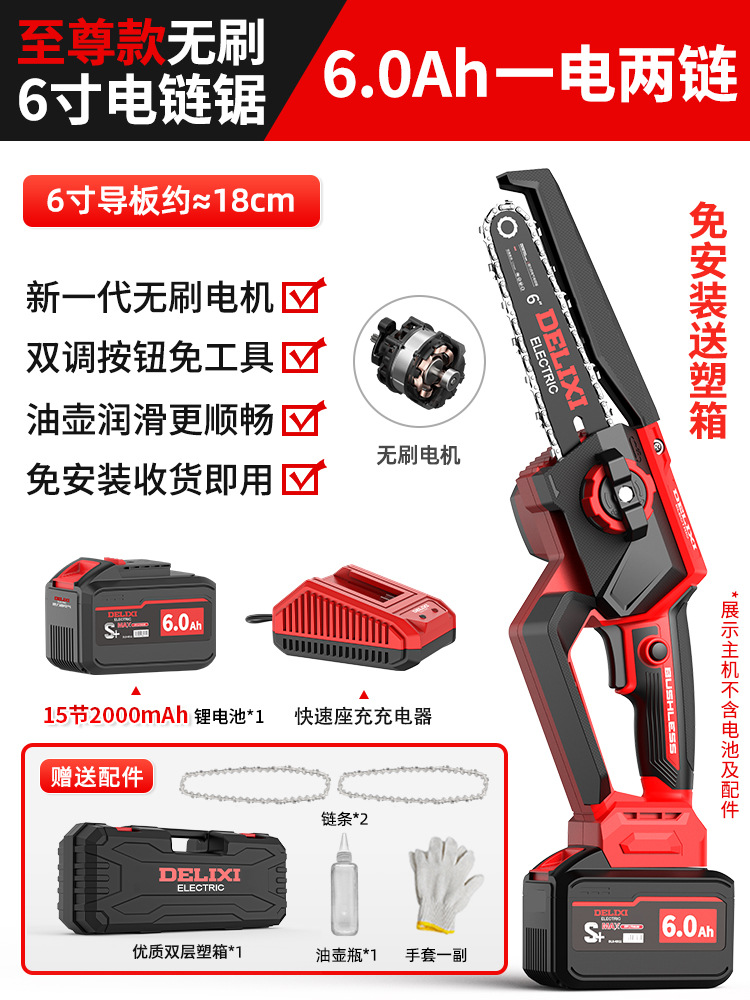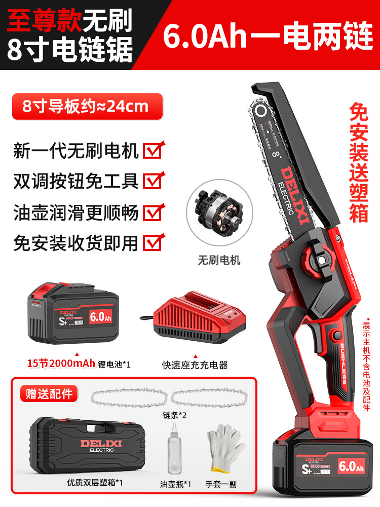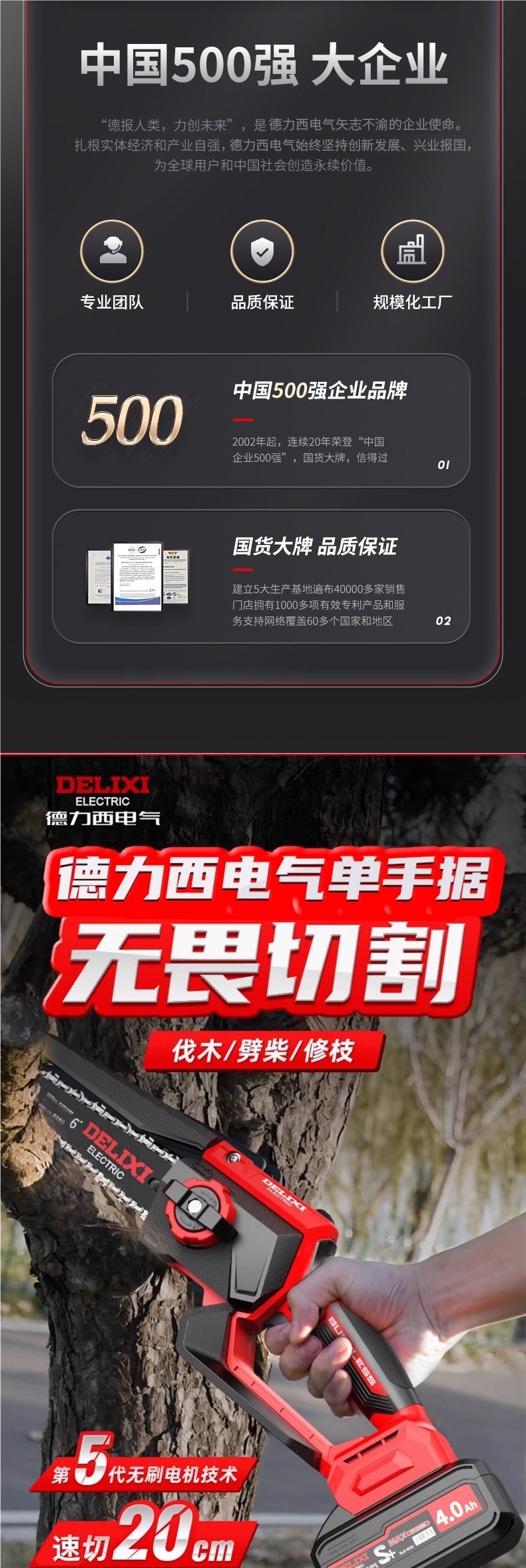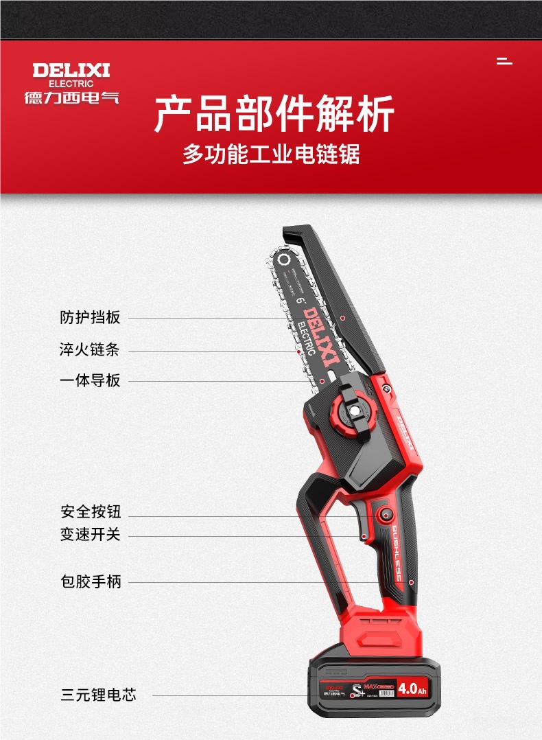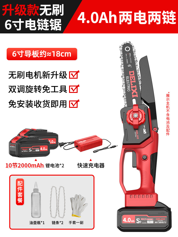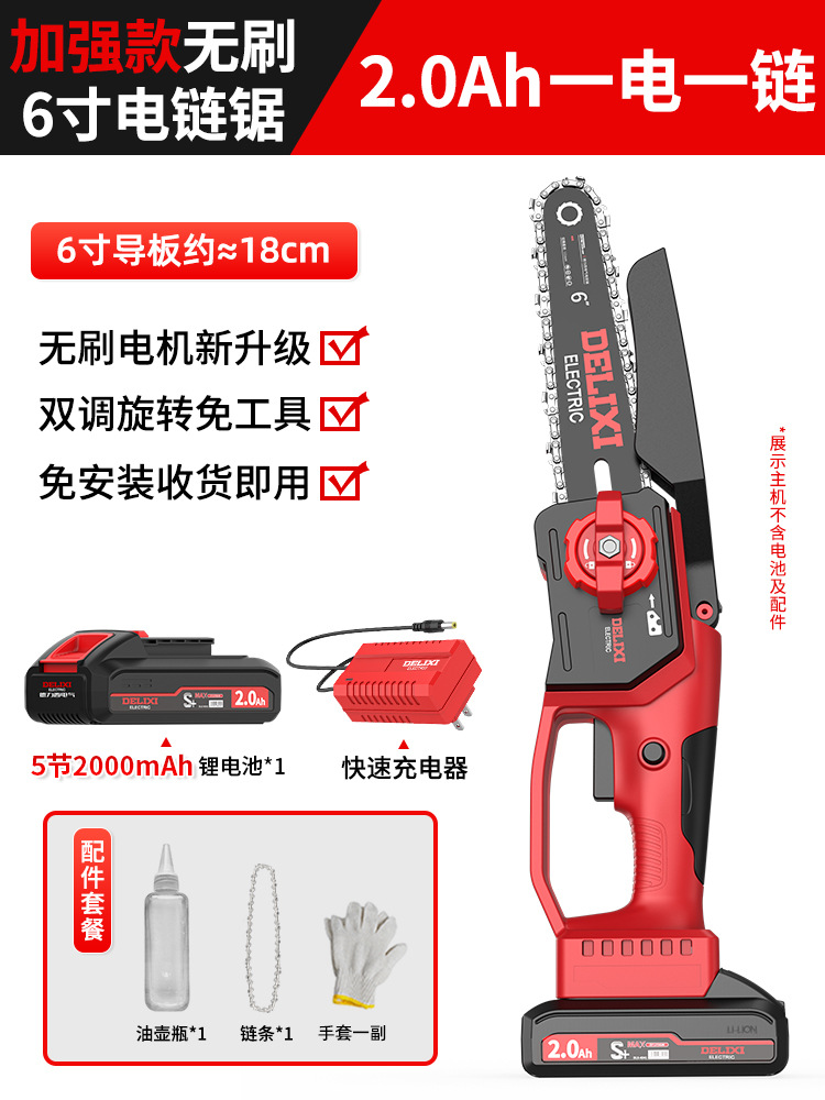 Delixi Brushless 충전식 리튬 배터리 단일 핸드 전기 톱 작은 가정용 휴대용 톱 전기 체인 톱 목재 야외 벌목스토어 가기