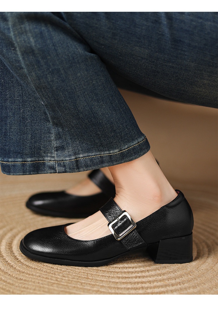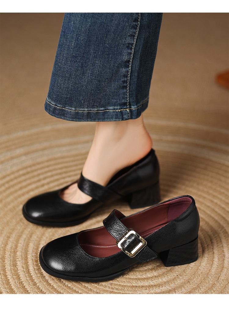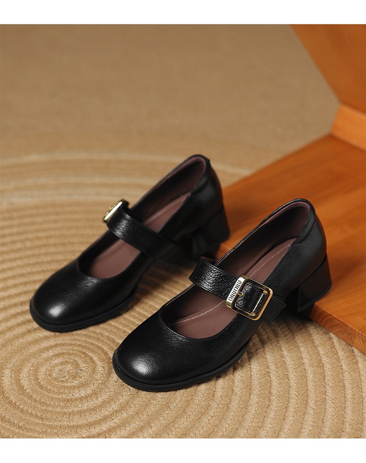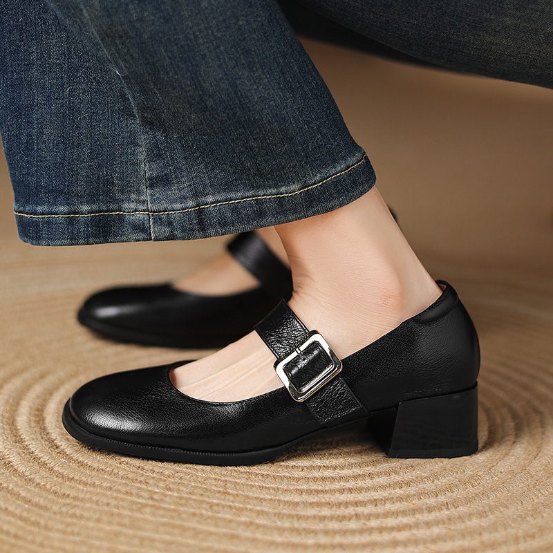 레트로 메리 제인 신발 양가죽 두꺼운 발 뒤꿈치 여성 봄과 가을 새로운 얕은 입 뒤꿈치 플러스 사이즈 여성 신발 41-43 국경