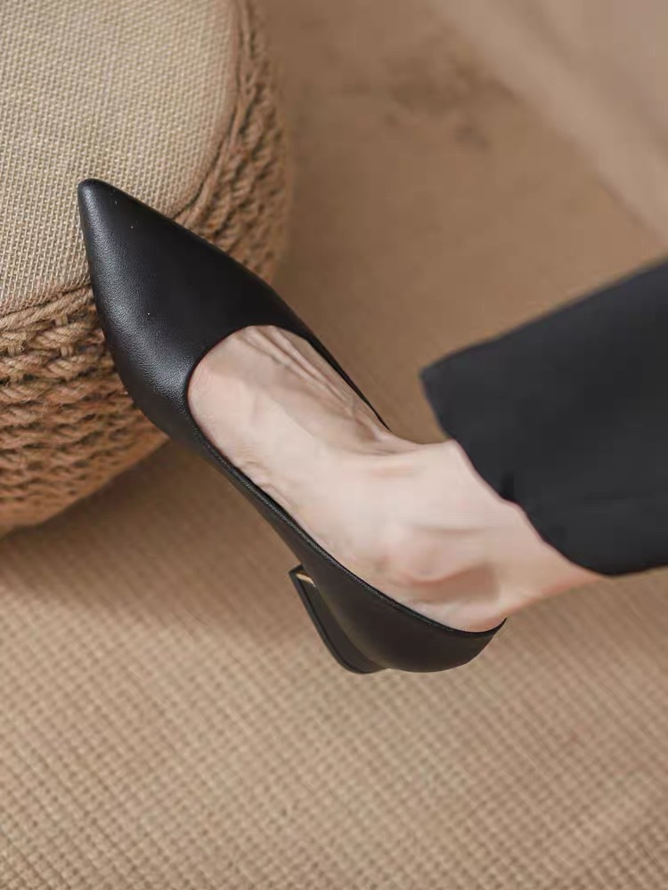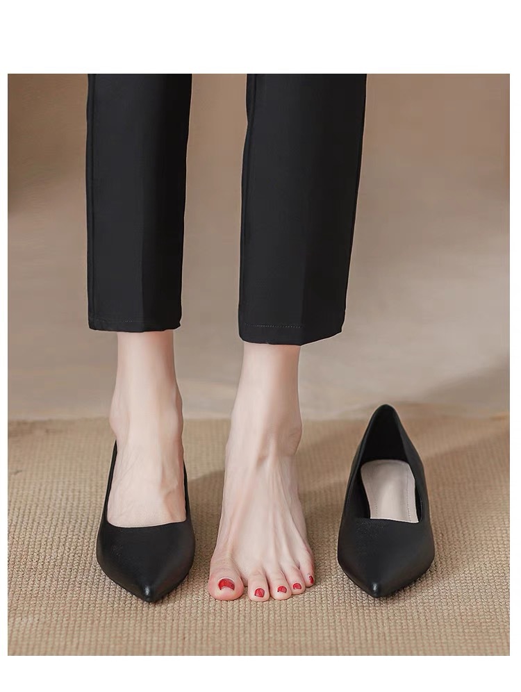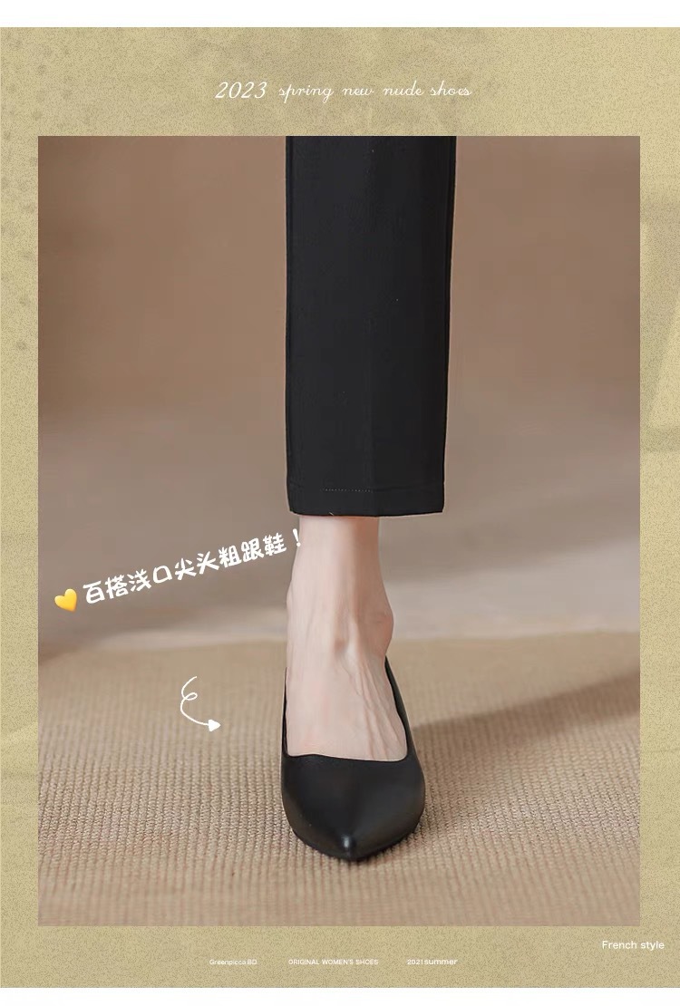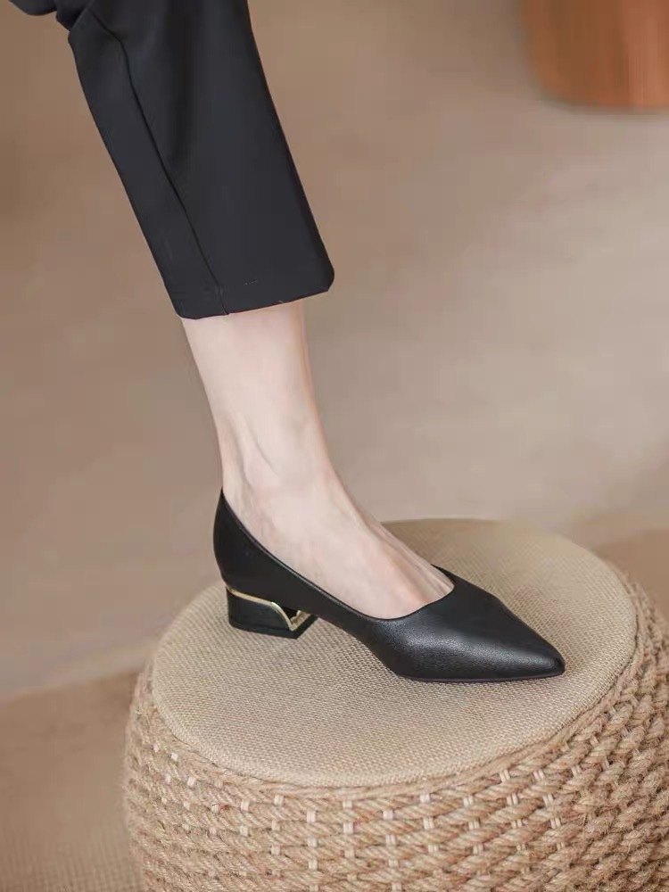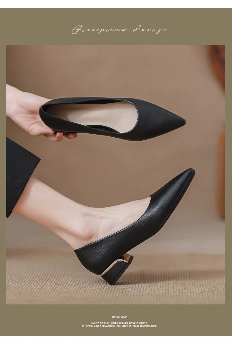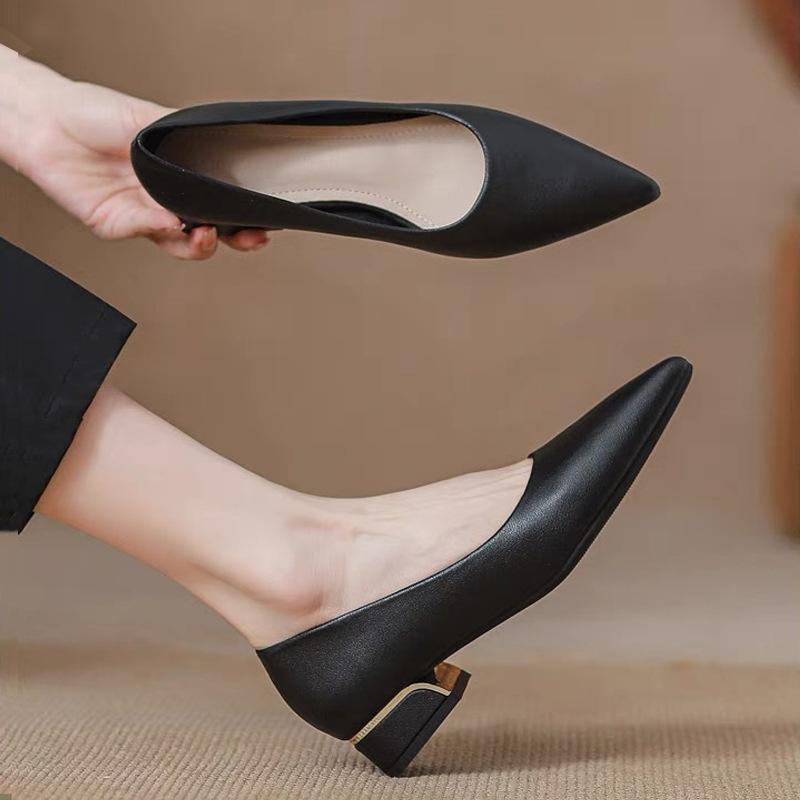 뾰족한 청키 힐 싱글 레이어 신발 여성의 2025 년 봄과 가을 새로운 블랙 소프트 가죽 미드 하이 하이힐 오래 서 피곤하지 않은 전문 작업 신발스토어 가기