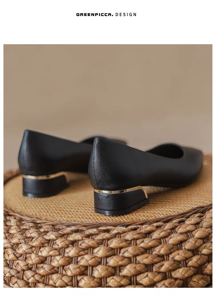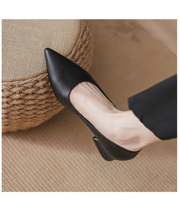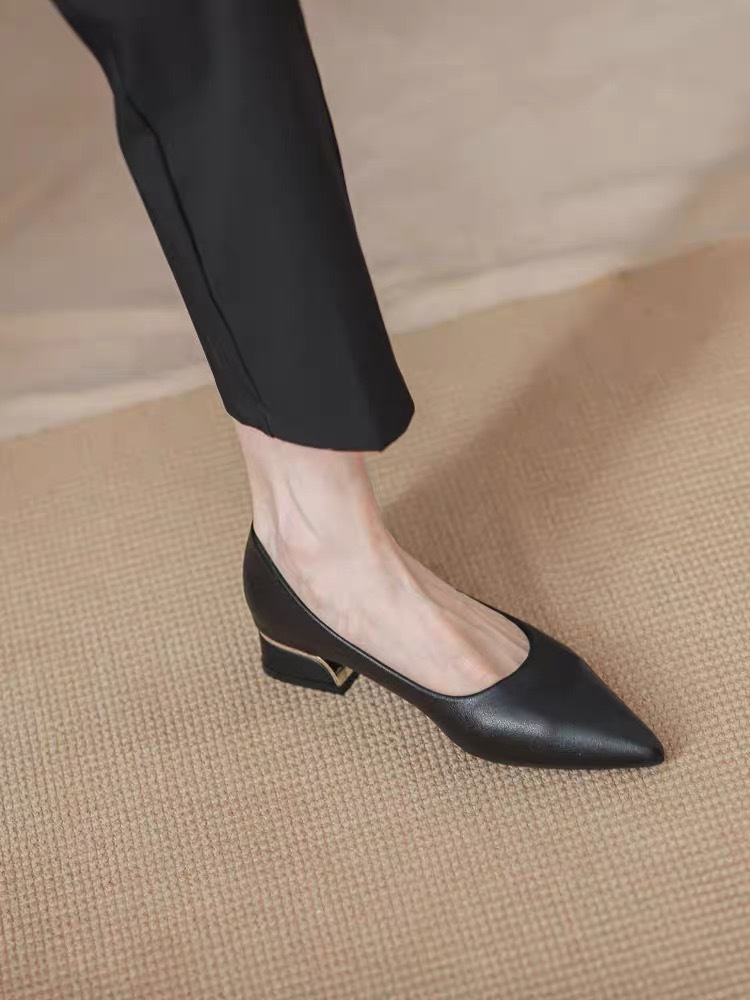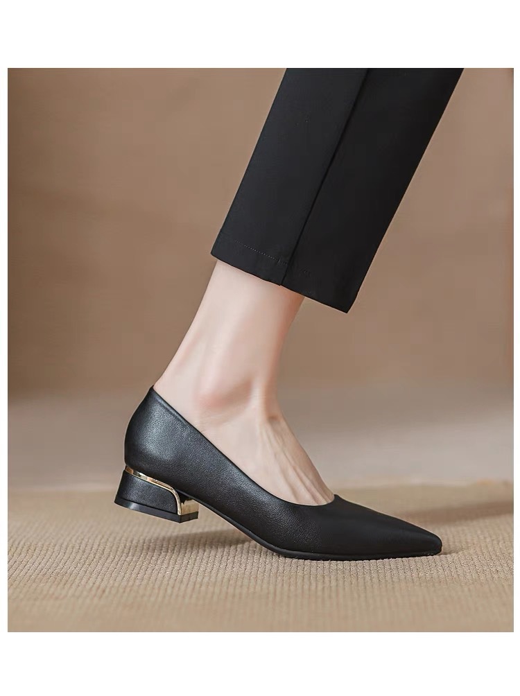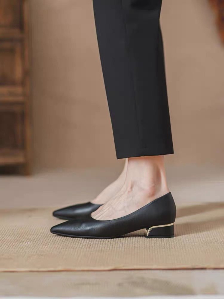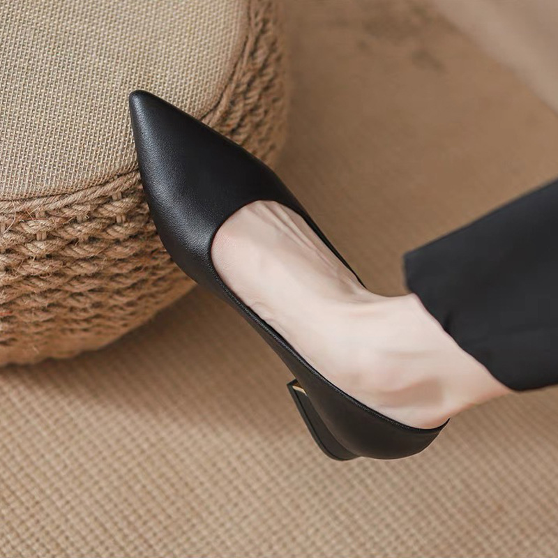 뾰족한 청키 힐 싱글 레이어 신발 여성의 2025 년 봄과 가을 새로운 블랙 소프트 가죽 미드 하이 하이힐 오래 서 피곤하지 않은 전문 작업 신발스토어 가기