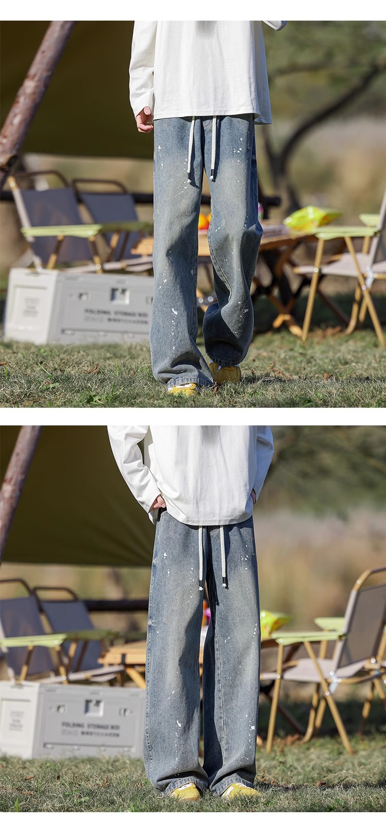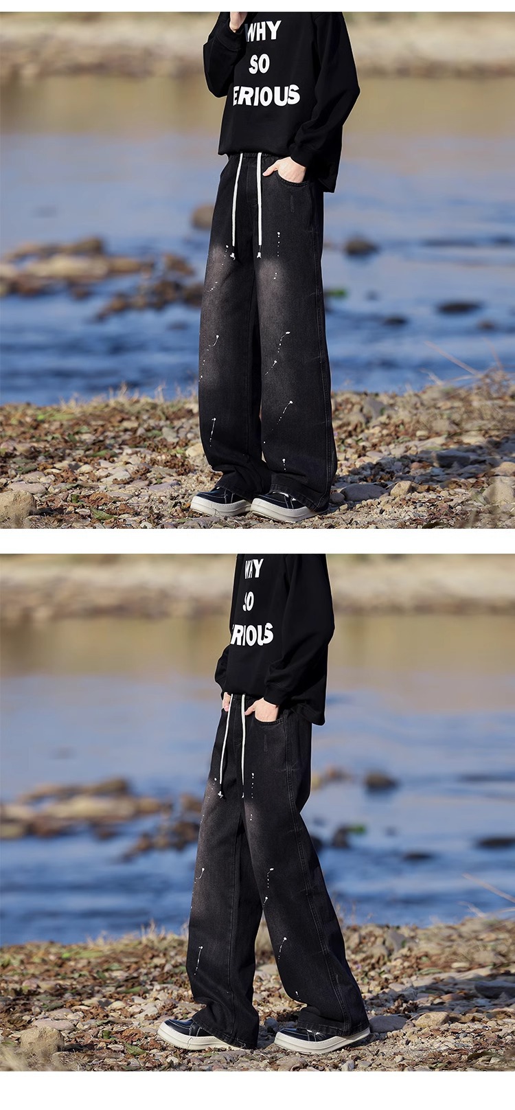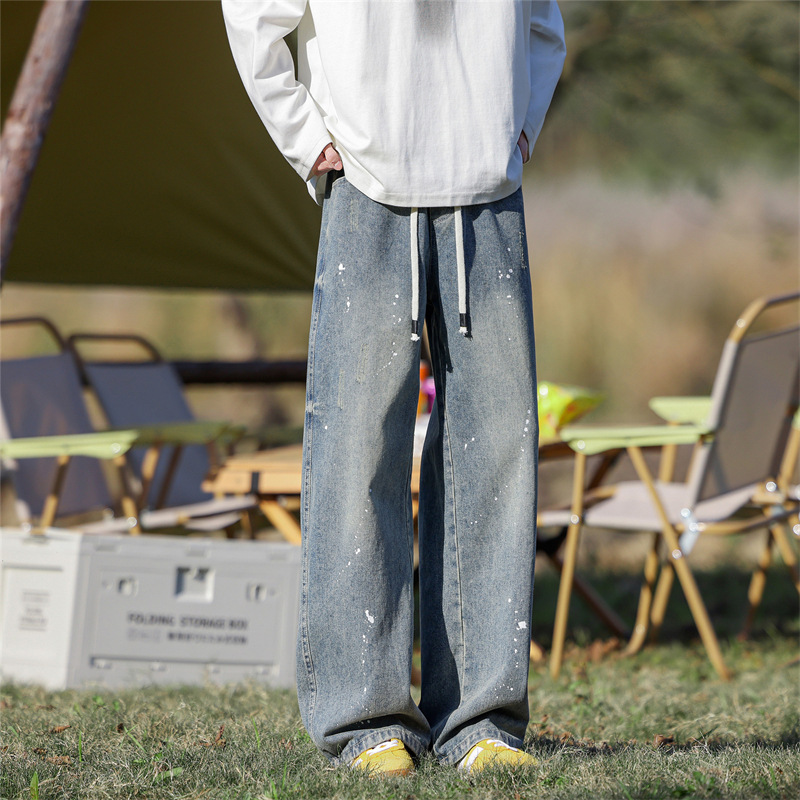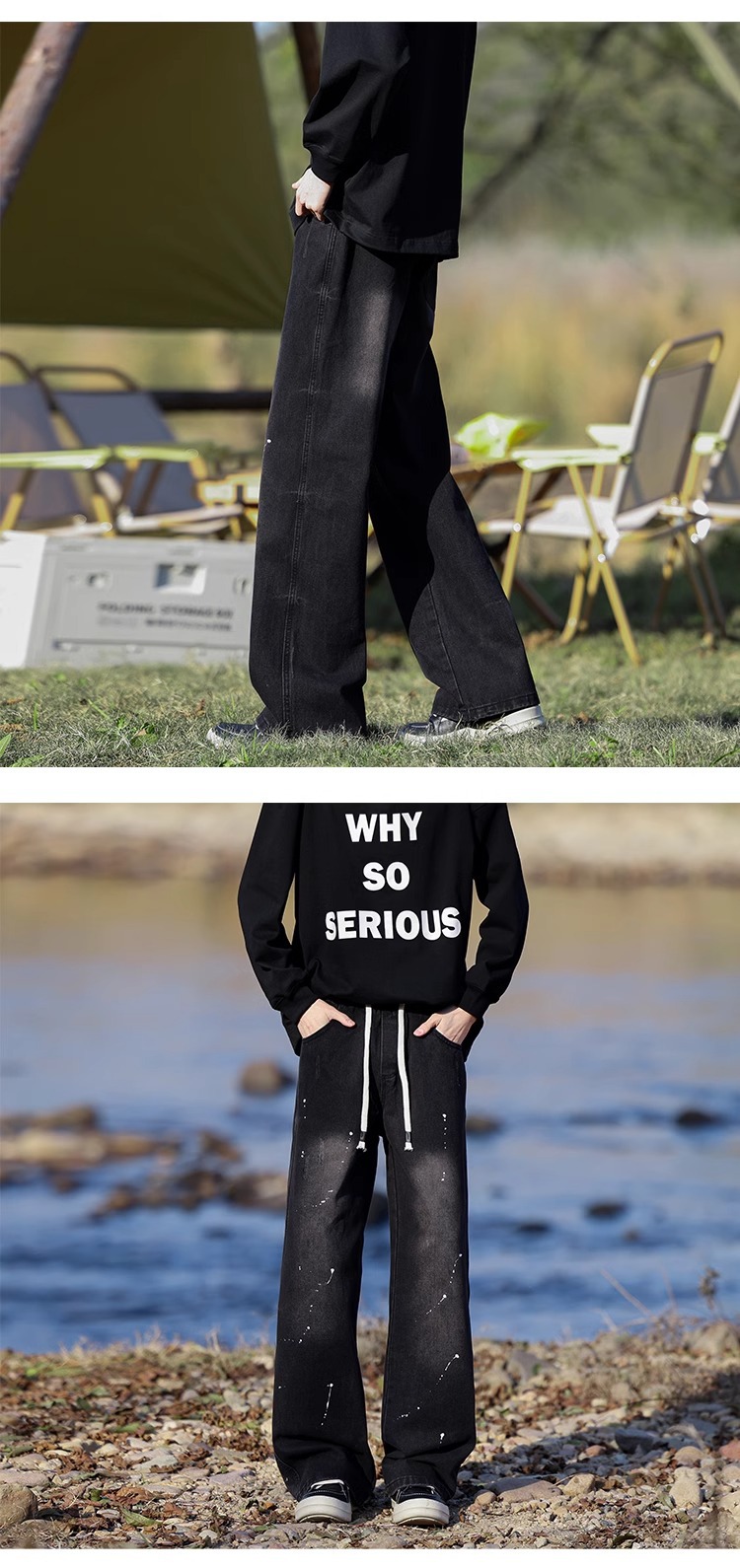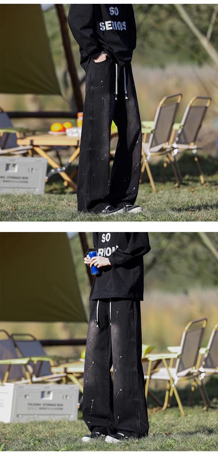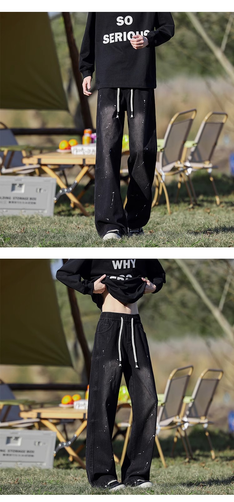 블랙 스플래시 잉크 청바지 남성 봄과 가을 일본 스타일 복고풍 느슨한 캐주얼 세탁 오래 된 강아지 잘 생긴 스트레이트 바지