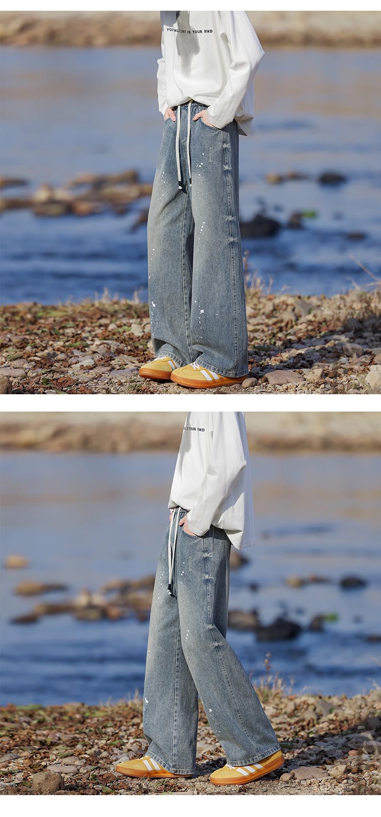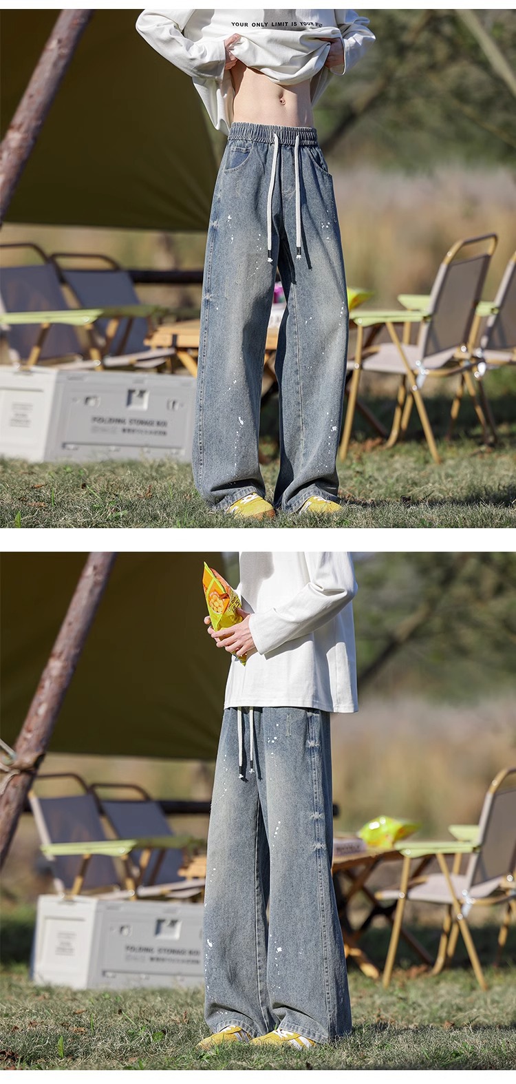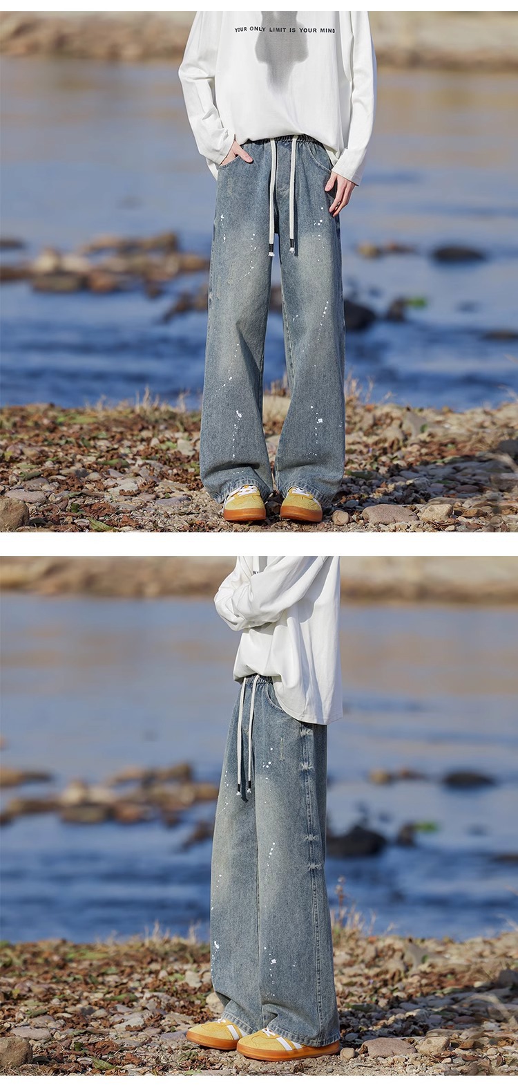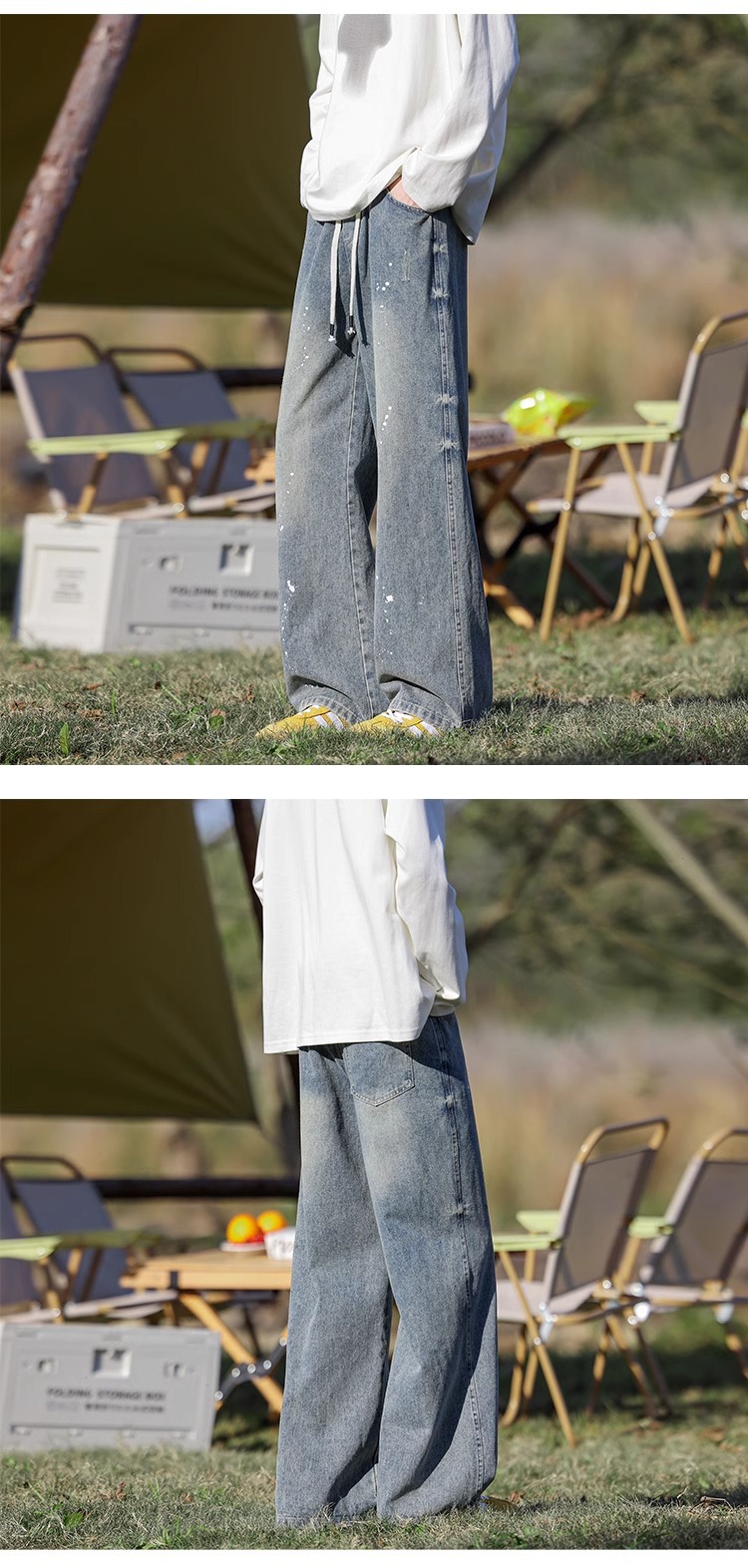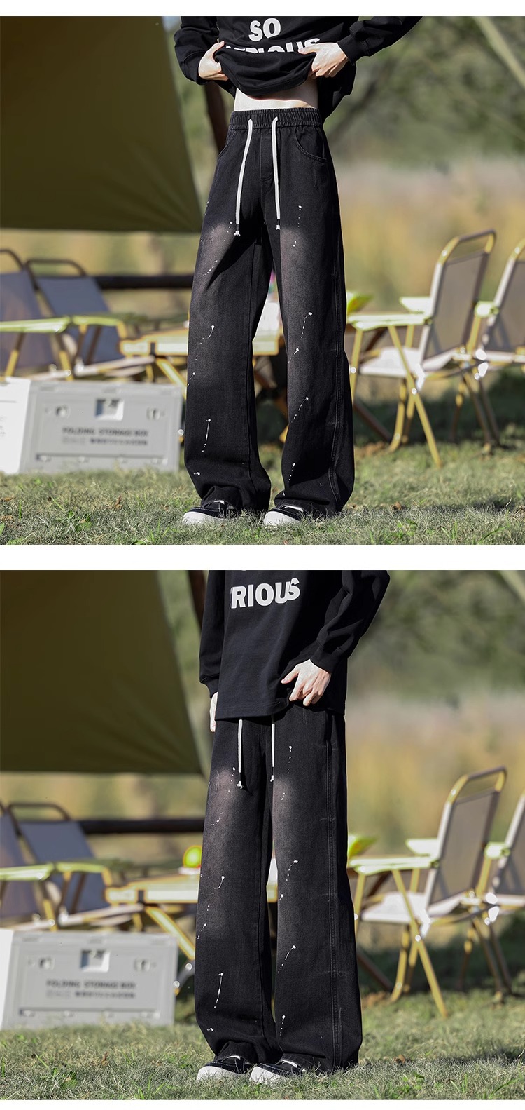 블랙 스플래시 잉크 청바지 남성 봄과 가을 일본 스타일 복고풍 느슨한 캐주얼 세탁 오래 된 강아지 잘 생긴 스트레이트 바지