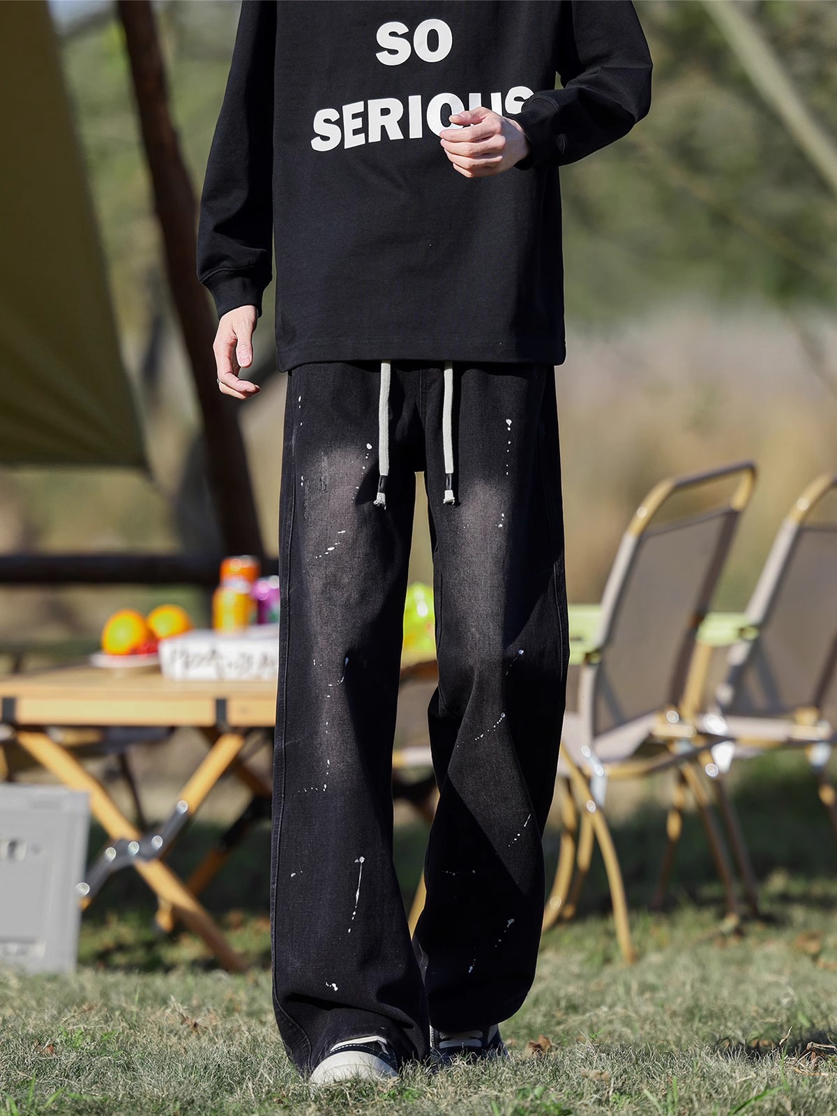 블랙 스플래시 잉크 청바지 남성 봄과 가을 일본 스타일 복고풍 느슨한 캐주얼 세탁 오래 된 강아지 잘 생긴 스트레이트 바지스토어 가기