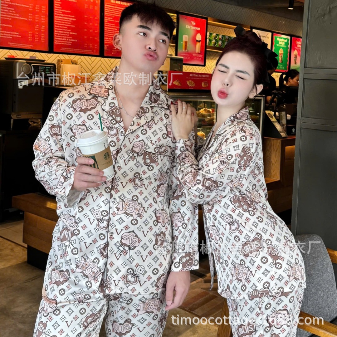 새로운 커플 아이스 실크 파자마 L 홈 라이트 럭셔리 V-넥 포켓 에디션 실크 남자와 여자의 긴 소매 세트 외부 옷을 입고
