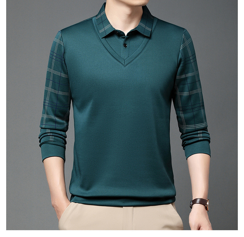 爸爸装假两件中年男士POLO衬衫领长袖格子T恤加绒男装上衣