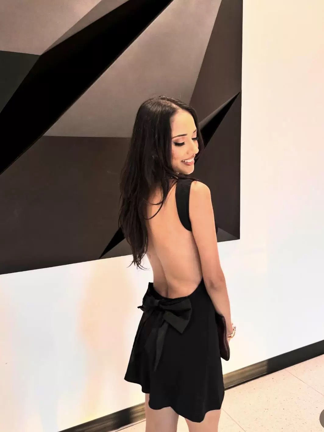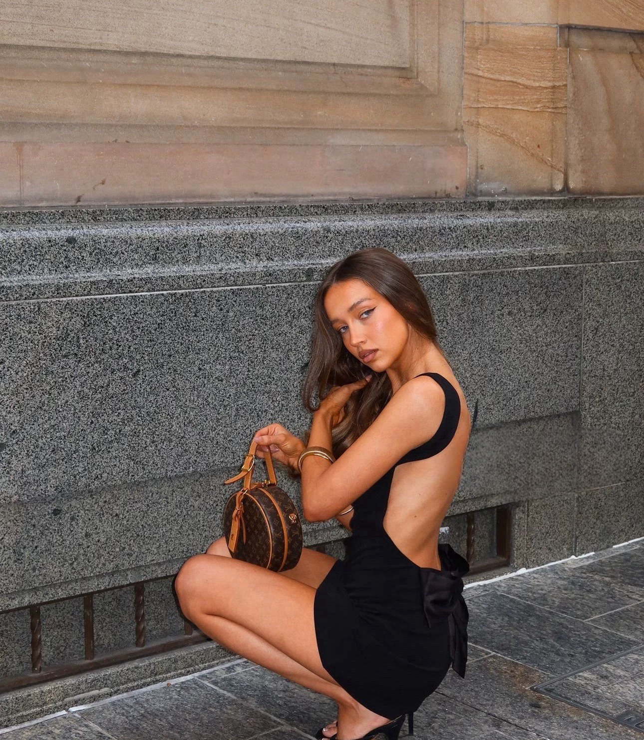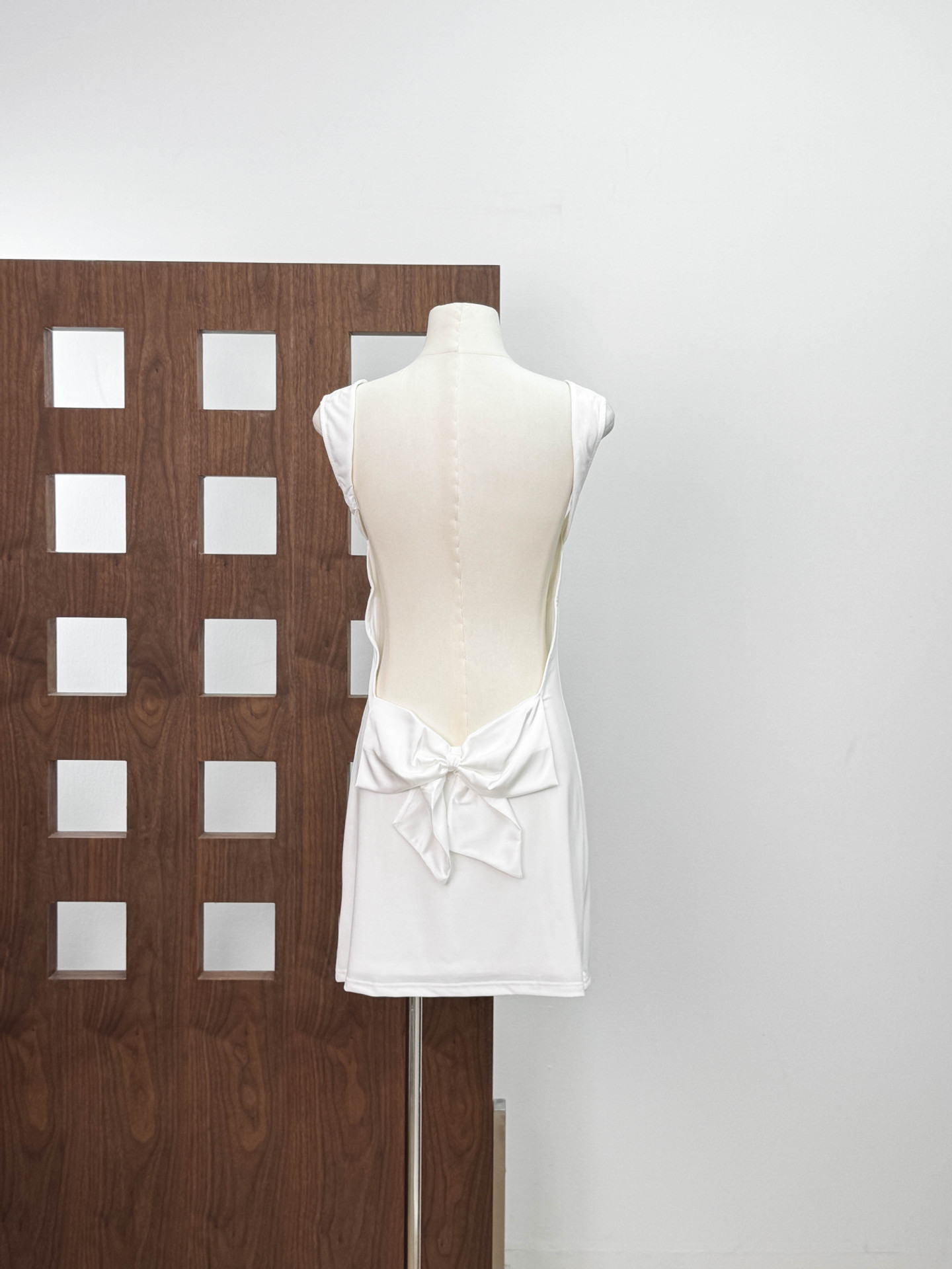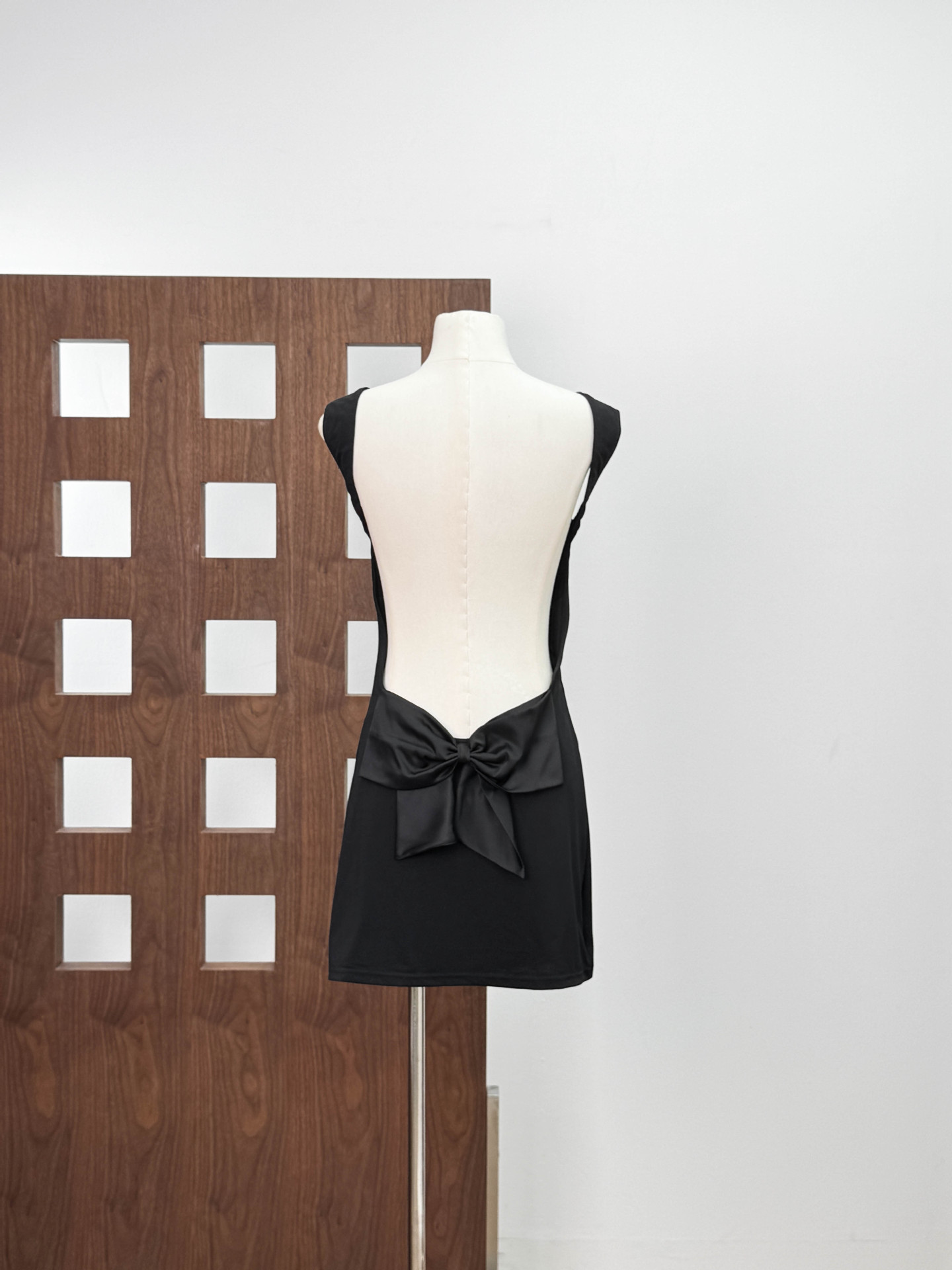 Tigermist 25ss 호주 디자인 새틴 활 뷰티 백 장식 섹시한 로우 컷 슬링 미니 원피스
