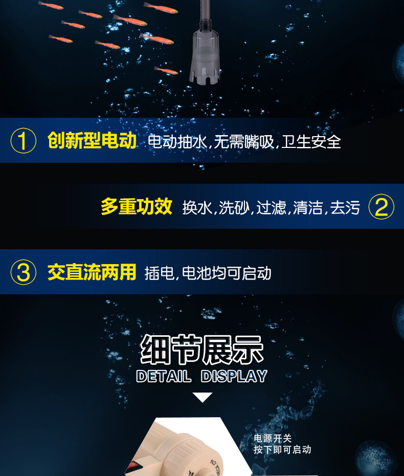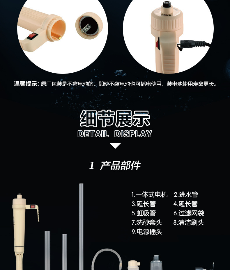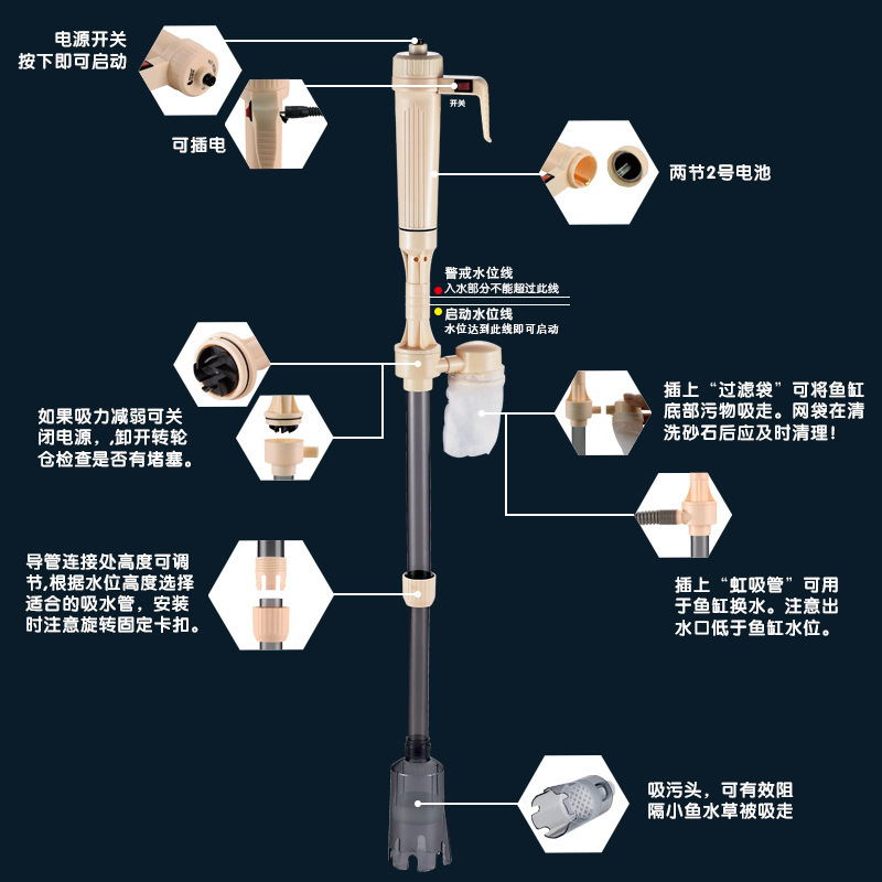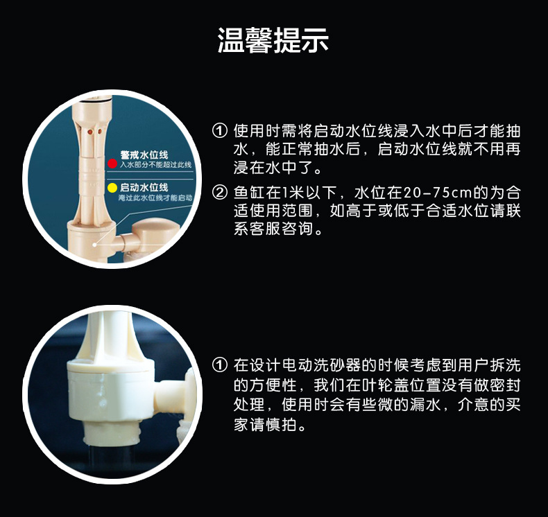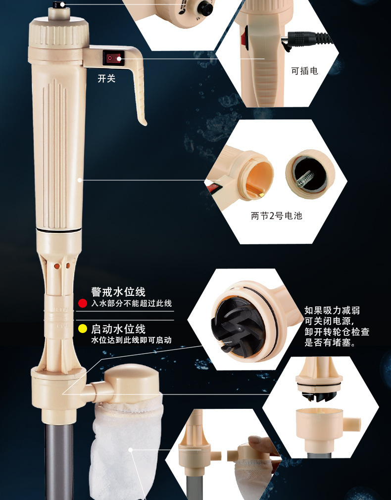 亲,洗沙器的抽水功能是利用虹吸效应来实现的哦,亲使用的时候先把洗沙器手柄处下方的启动水位线浸到水里,然后启动洗沙器,就能成功的抽出水来哦。如果水位确实太低的话,亲可以把2、3、4号延长管拆卸下来,直接用1号洗沙器主机直接抽水的哦。使用的时候请亲们注意水不要浸到警惕水位线以上的部分就可以啦!