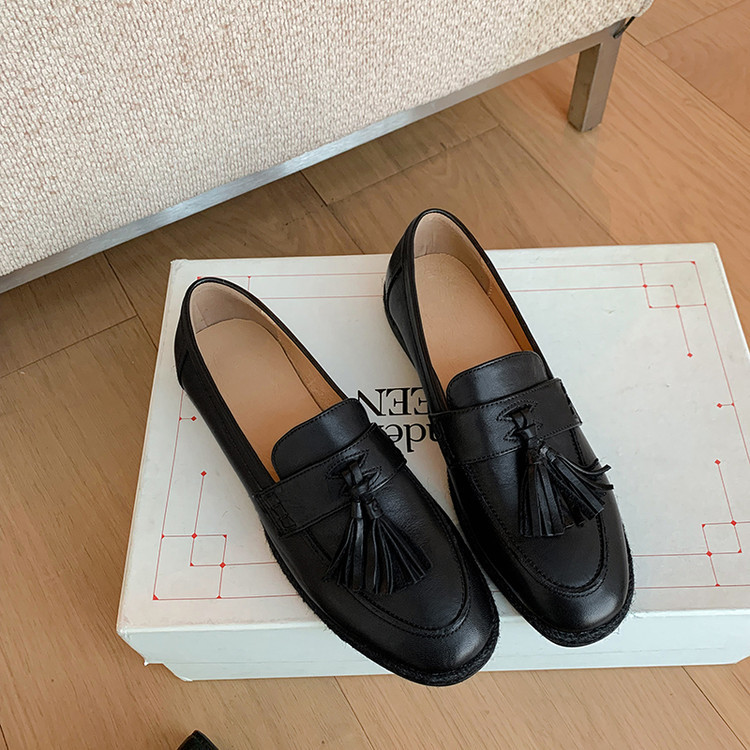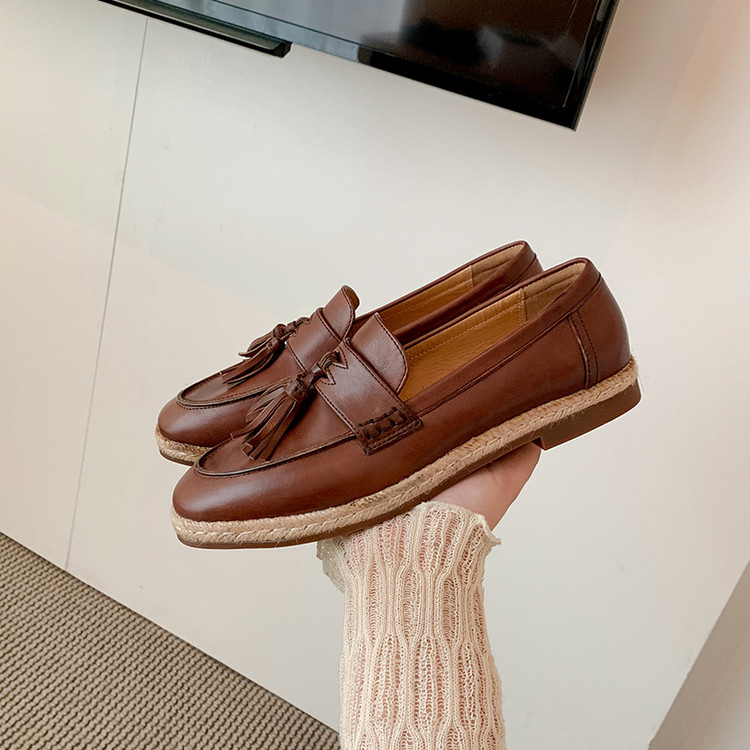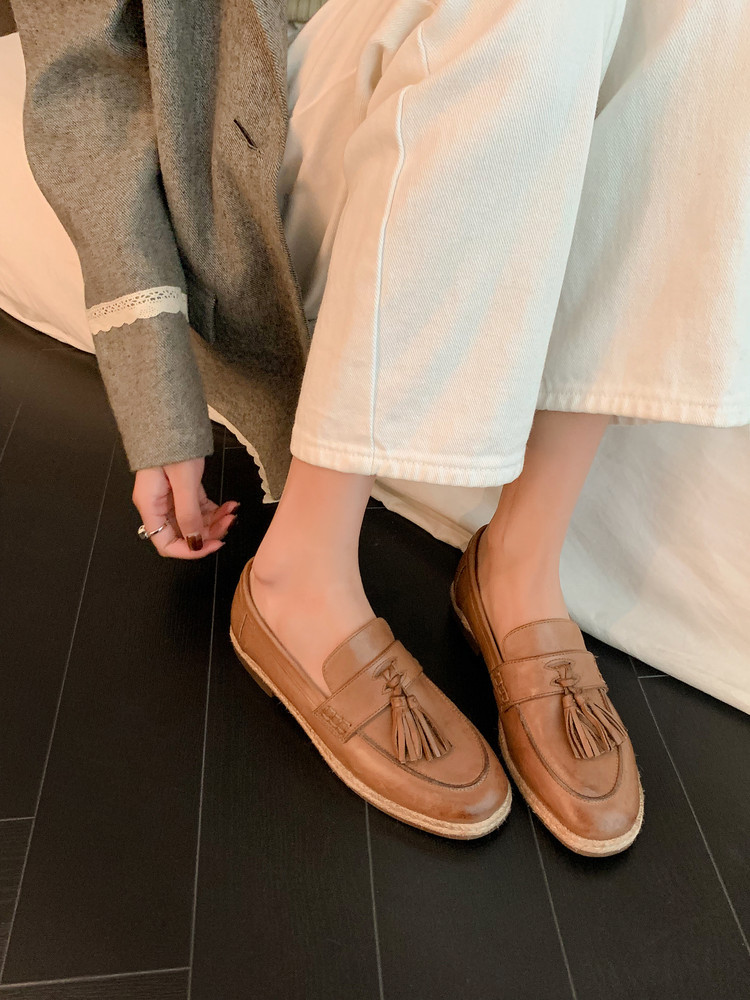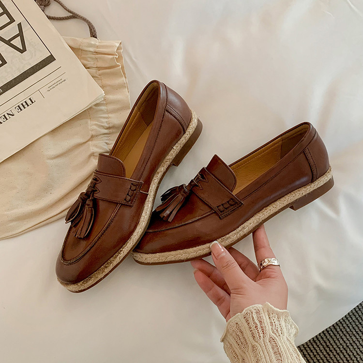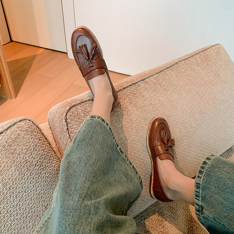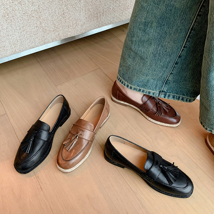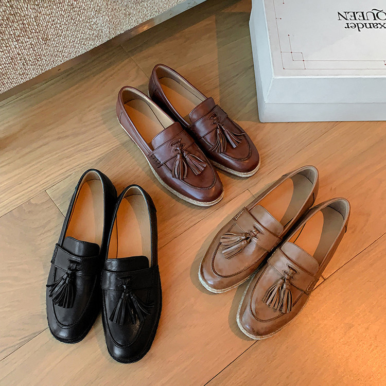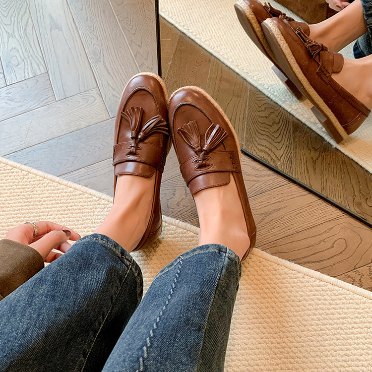 가죽 타셀 로퍼의 첫 번째 레이어는 여성 플랫 슈즈 이른 봄 풀 가죽 로우 탑 레트로 여성 신발 안팎의 새로운 라운드 토