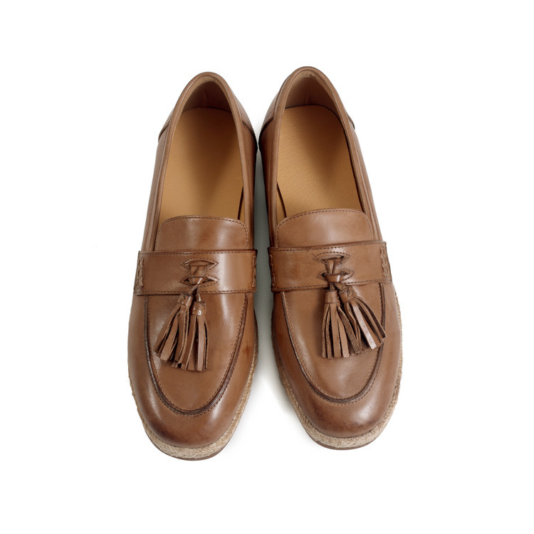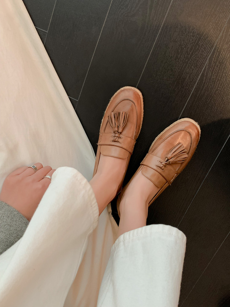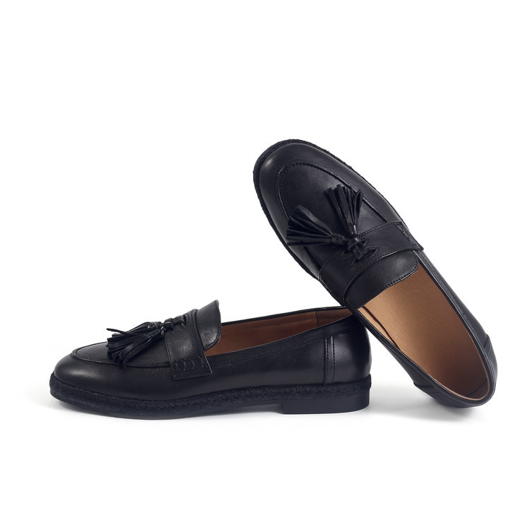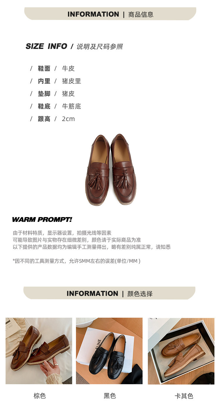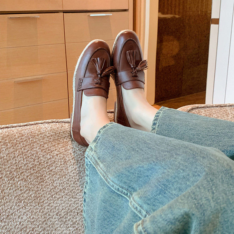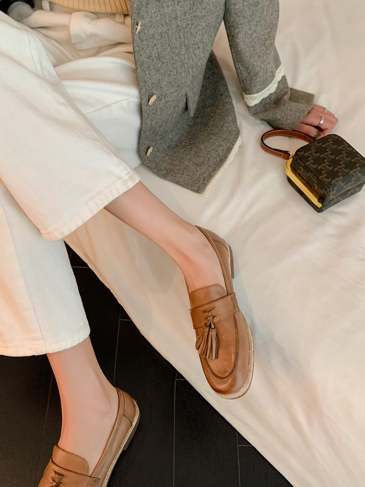 가죽 타셀 로퍼의 첫 번째 레이어는 여성 플랫 슈즈 이른 봄 풀 가죽 로우 탑 레트로 여성 신발 안팎의 새로운 라운드 토