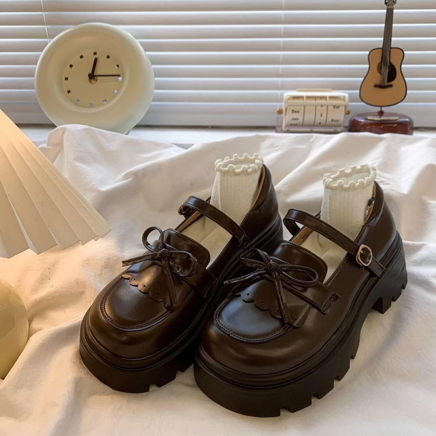 두꺼운 밑창 머핀 두꺼운 뒤꿈치 활 작은 가죽 신발 여성의 2025 년 봄 새로운 일본 달콤한 메리 제인 신발