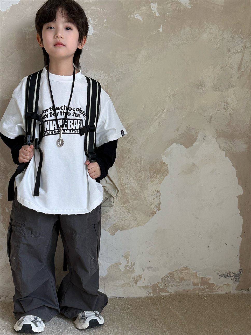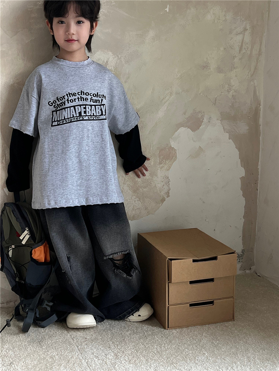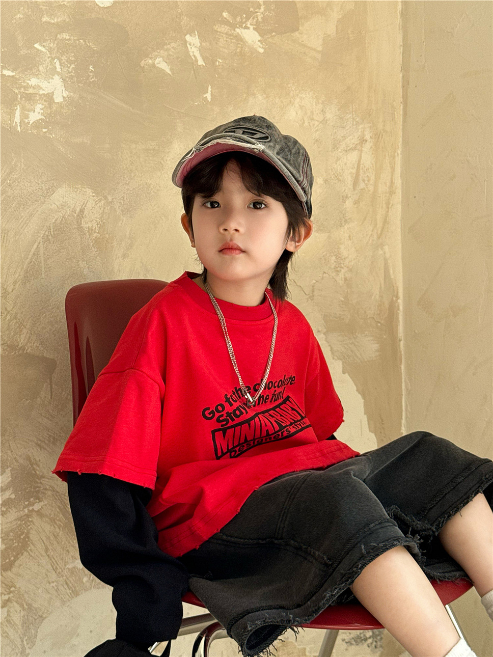 2025 가을 아동복 큰 어린이 가짜 투피스 긴 T 복고풍 대학 스타일 은 편지 어린이 바닥 셔츠 유행스토어 가기
