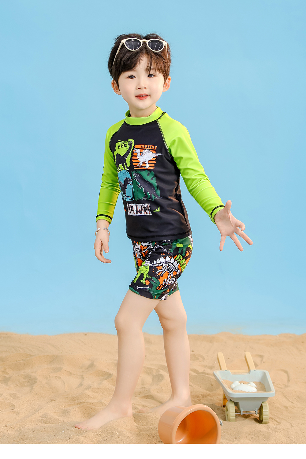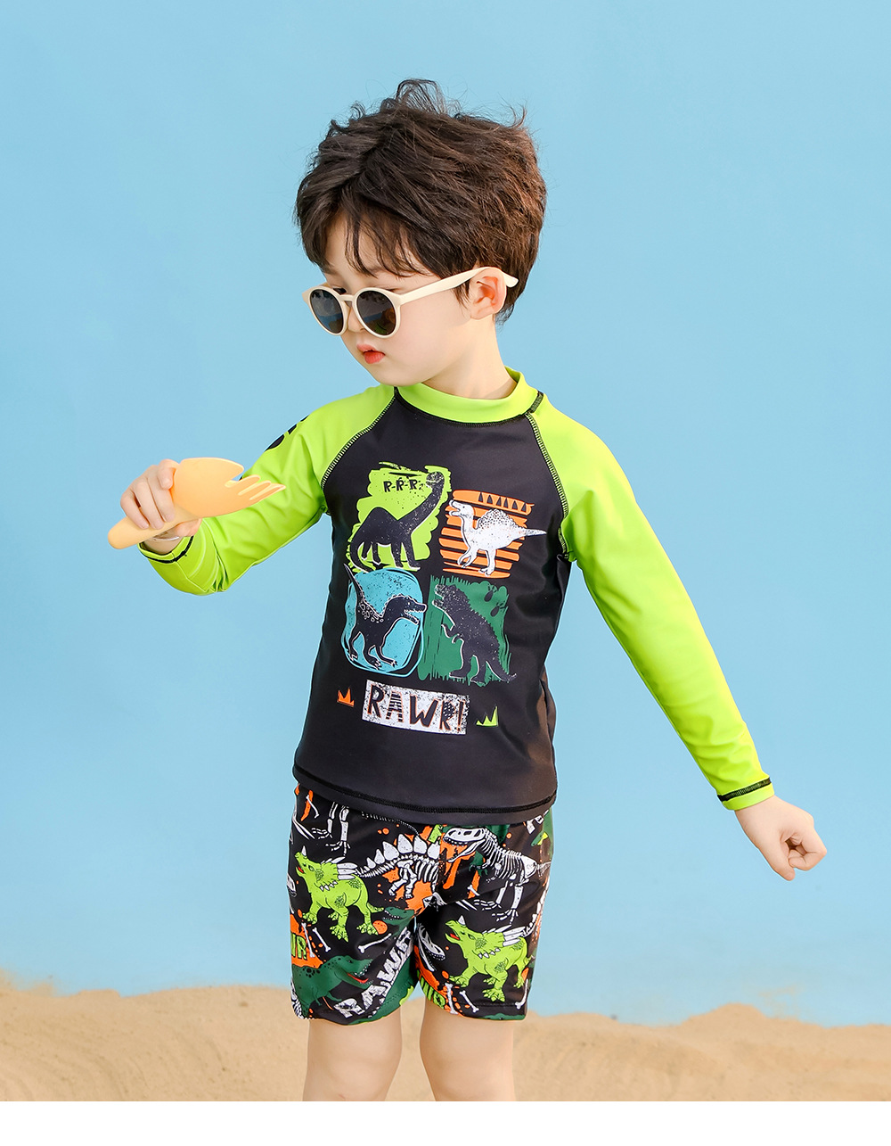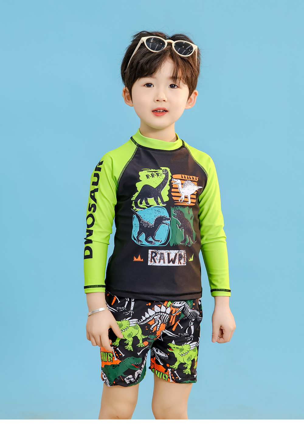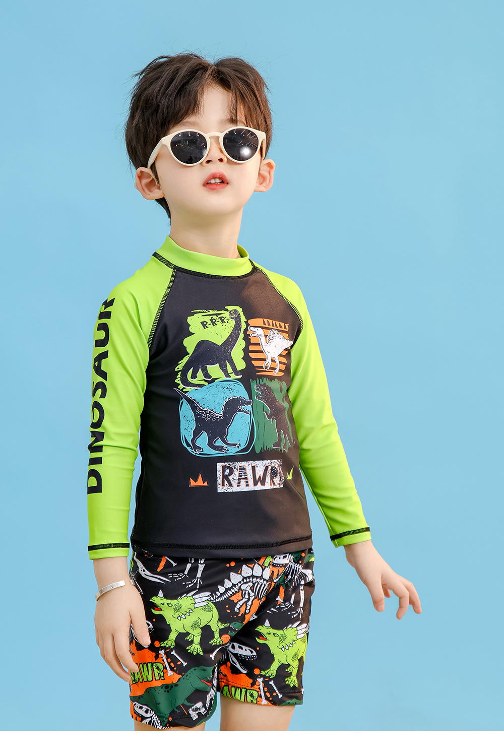어린이 수영복 소년 수영 트렁크 긴 소매 태양 방지 빠른 건조 공룡 중형 및 대형 어린이 소년 아기 따뜻한 수영복