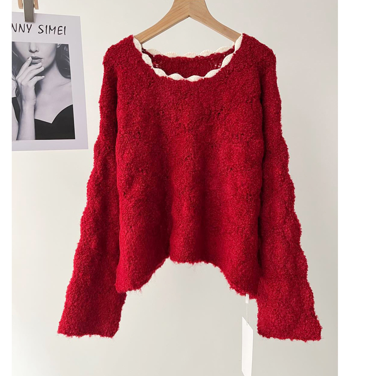 재고 팹 스타일 이른 봄 새로운 레이스 크루 넥 레드 스웨터 캐주얼 루즈 올 매치 니트 탑