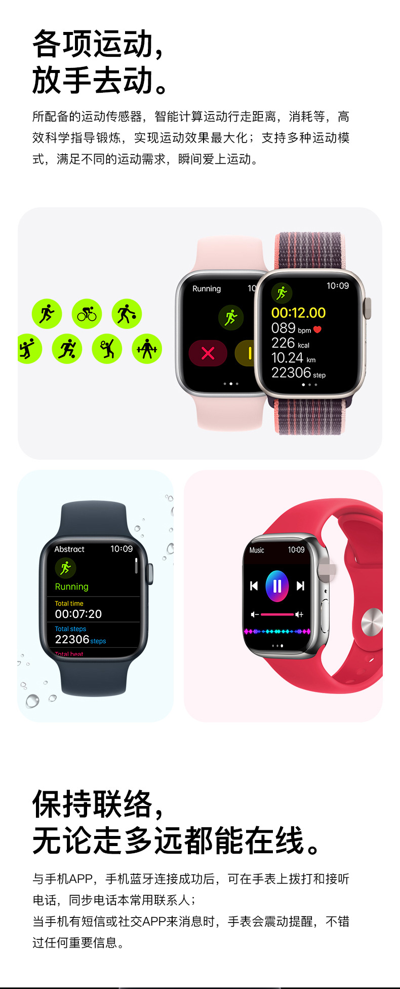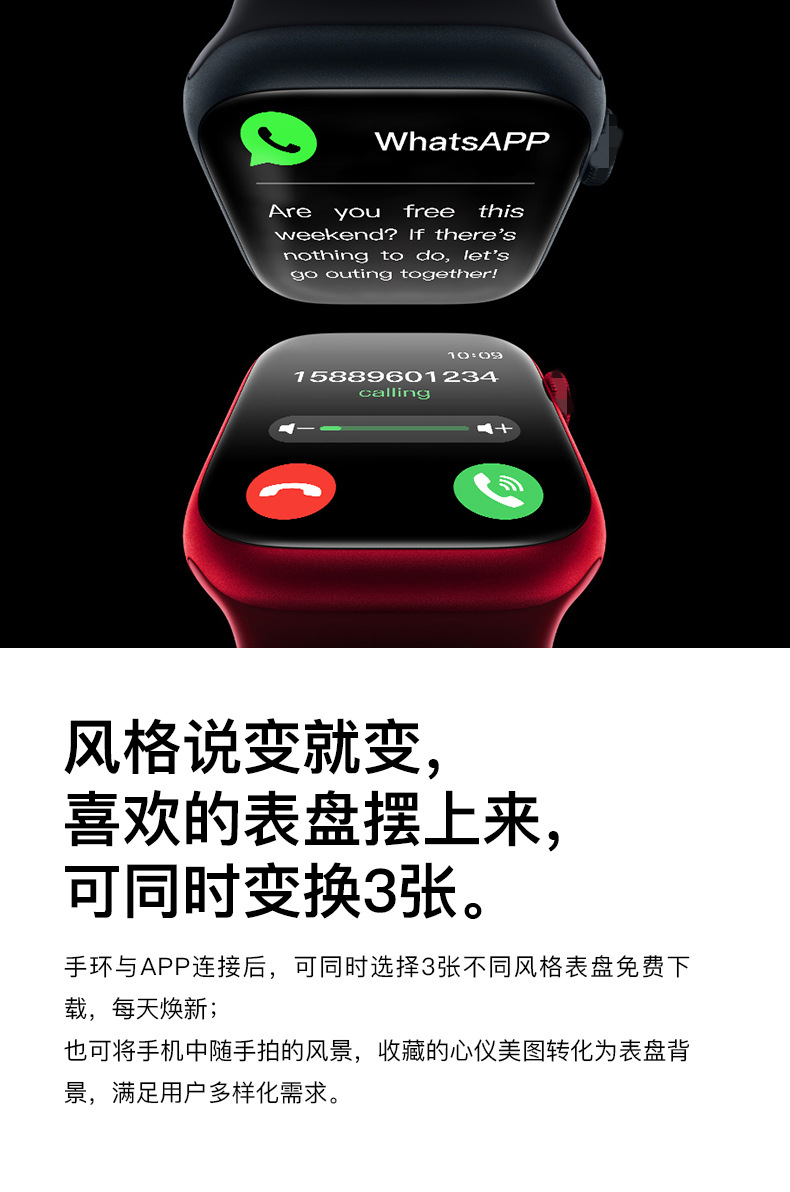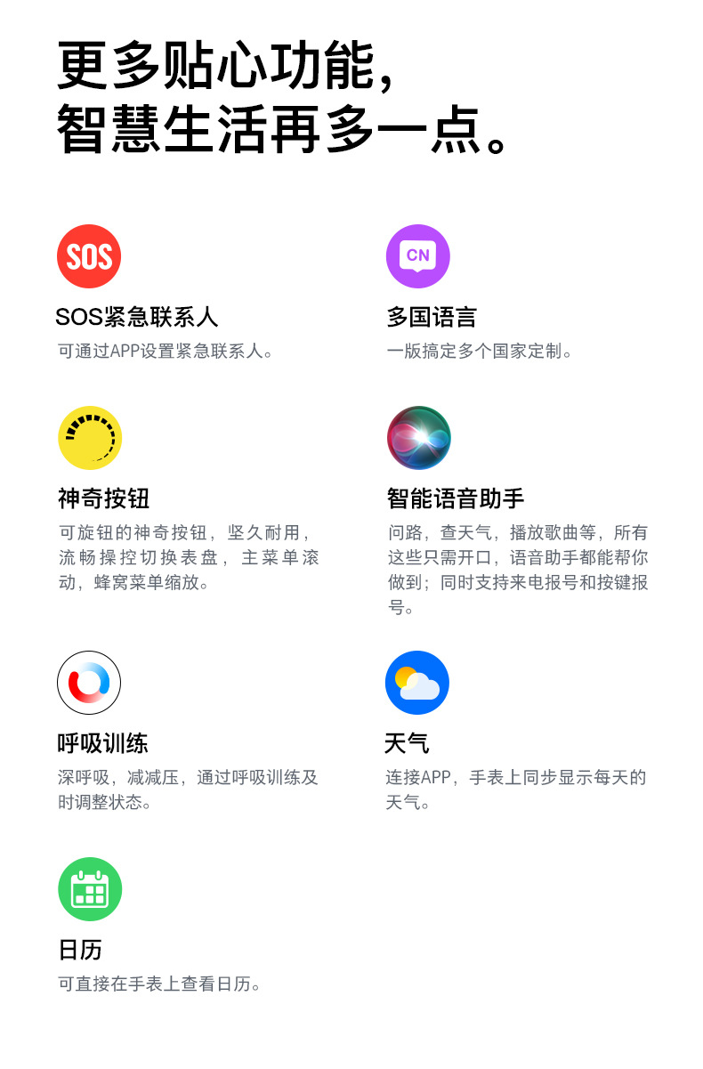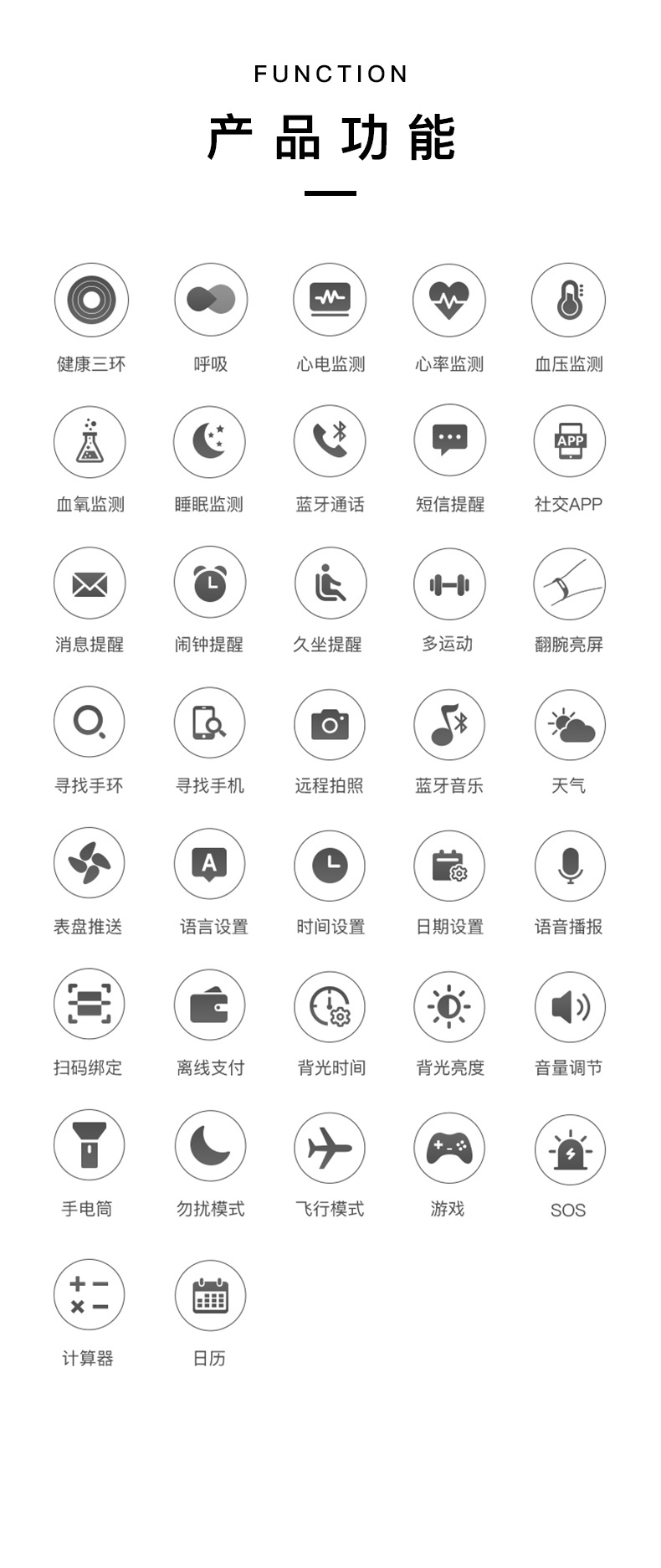 计步、距离、卡路里、心率/血压/血氧监测、蓝牙通话、蓝牙音乐、睡眠监测、来电提醒、短信提醒、社交APP消息提醒、闹钟提醒、久坐提醒、多运动、翻腕亮屏、寻找手环、寻找手机、远程拍照、勿扰模式、表盘自定义、来电报号、按键报号