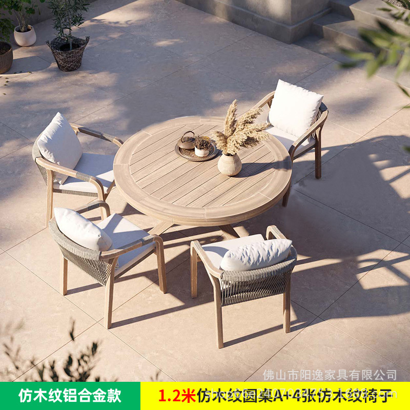 • 1.2m 원형 테이블 + 야외용 의자 4개 [알루미늄 합금 모조 나뭇결 모델]