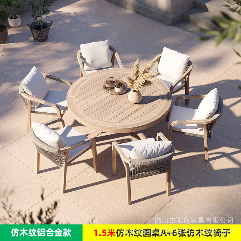 • 1.5m 원형 테이블 + 야외용 의자 6개 [알루미늄 합금 모조 나뭇결 모델]