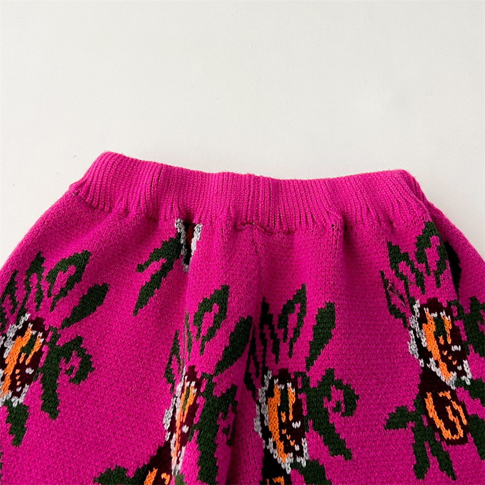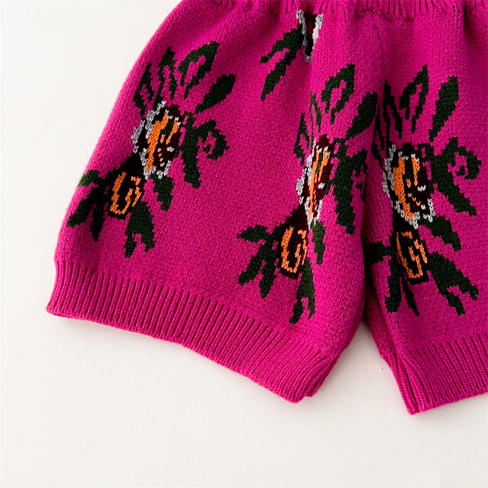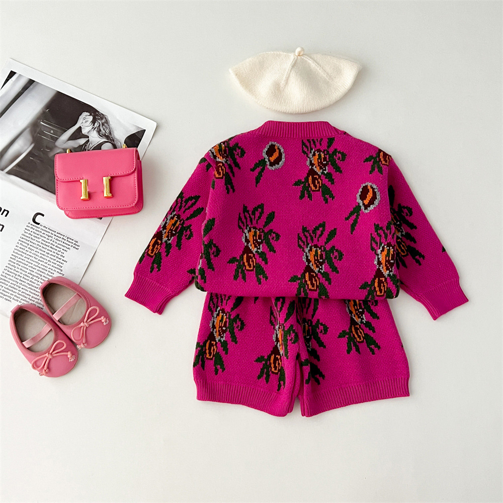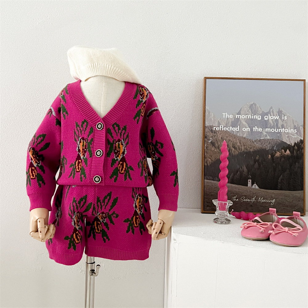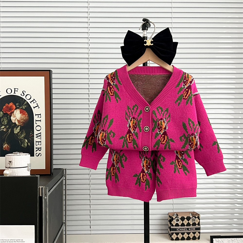 2024 가을 겨울 니트 아동복 세트 여아 민족풍 프린트 스웨터 가디건 + 반바지 여아 민족풍