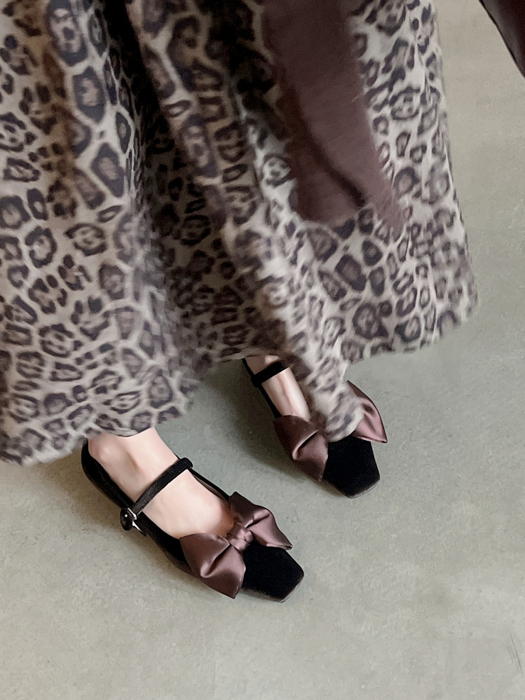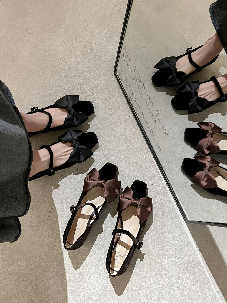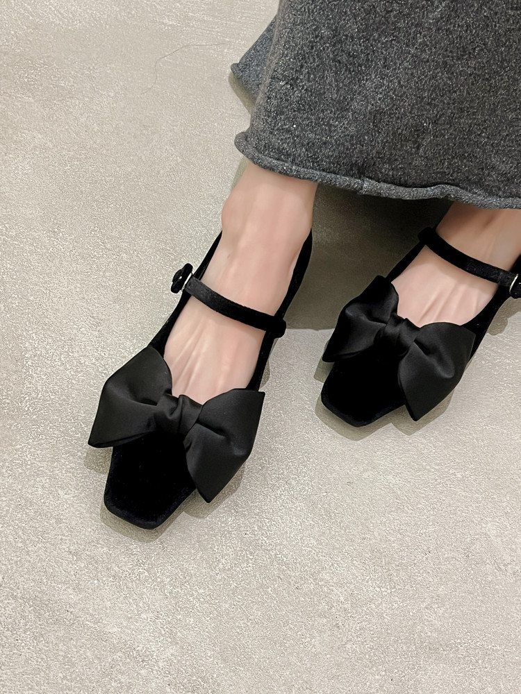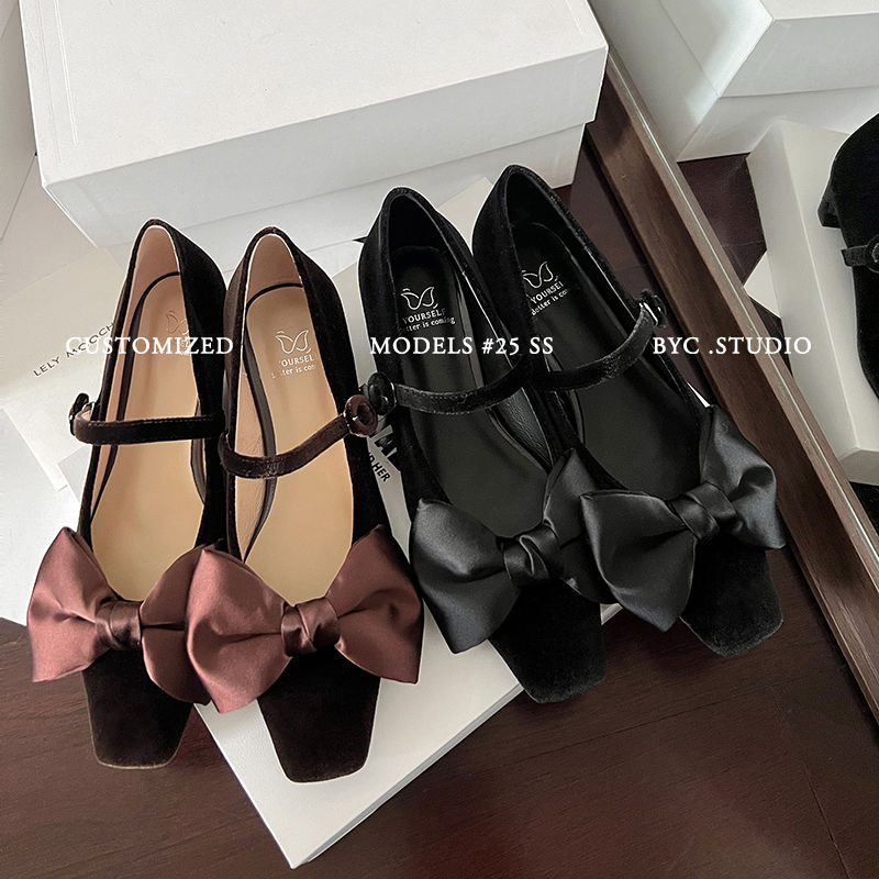 벨벳 스위트 보우 메리 제인 신발 여성 로우 힐 2025 봄 광장 발가락 고양이 뒤꿈치 얕은 입 신발 여성용 신발 트렌디