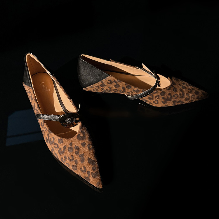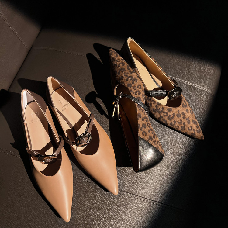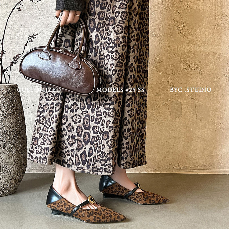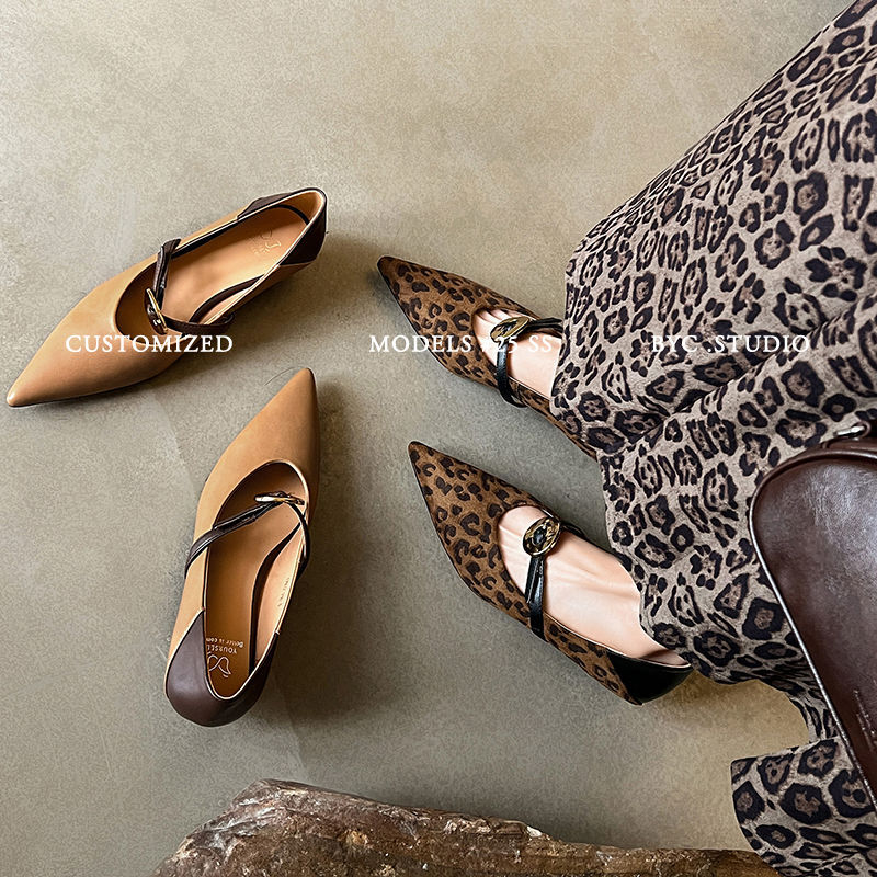 2025 봄과 가을 새로운 색상 매칭 레오파드 무늬 한 단어 포인팅 고양이 힐 미드 힐 싱글 레이어 신발 하이힐 얕은 입 여성용 신발 특종 신발스토어 가기