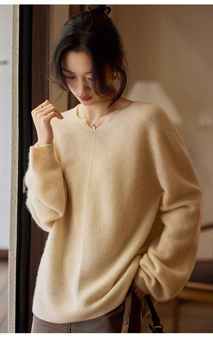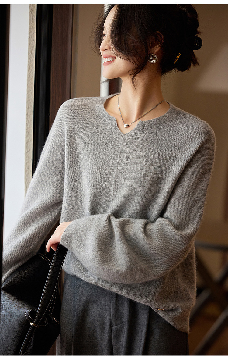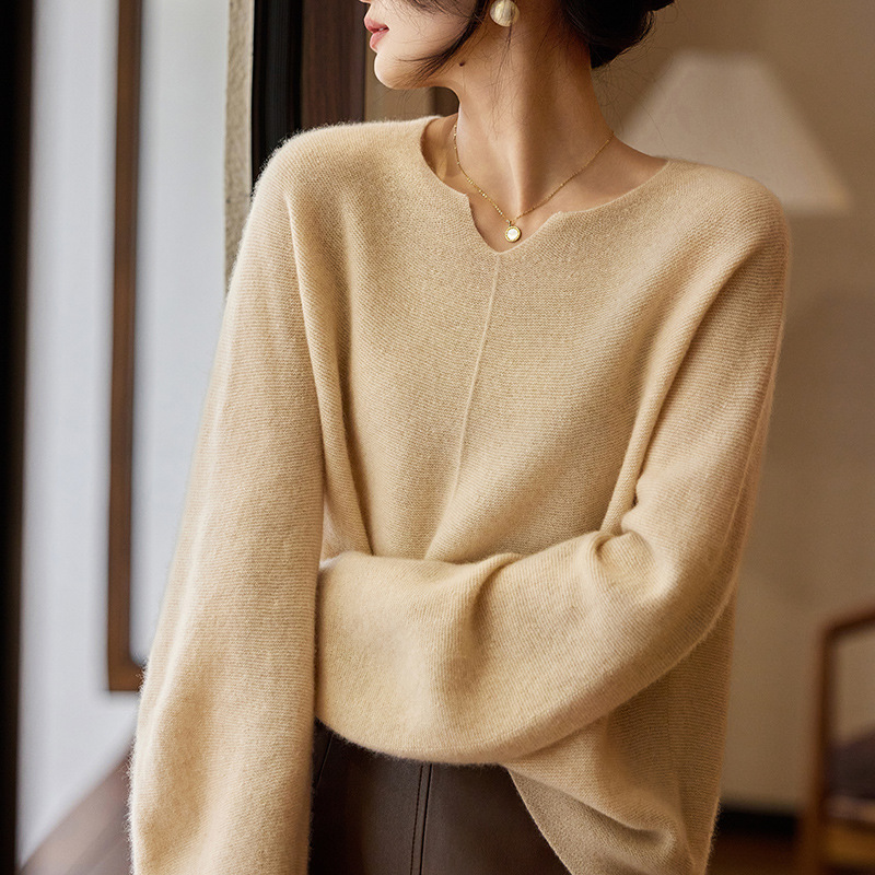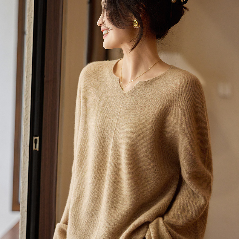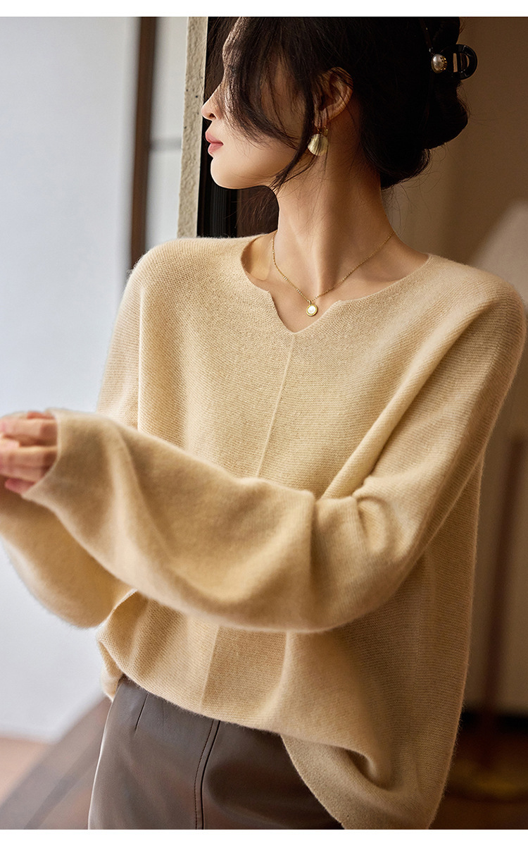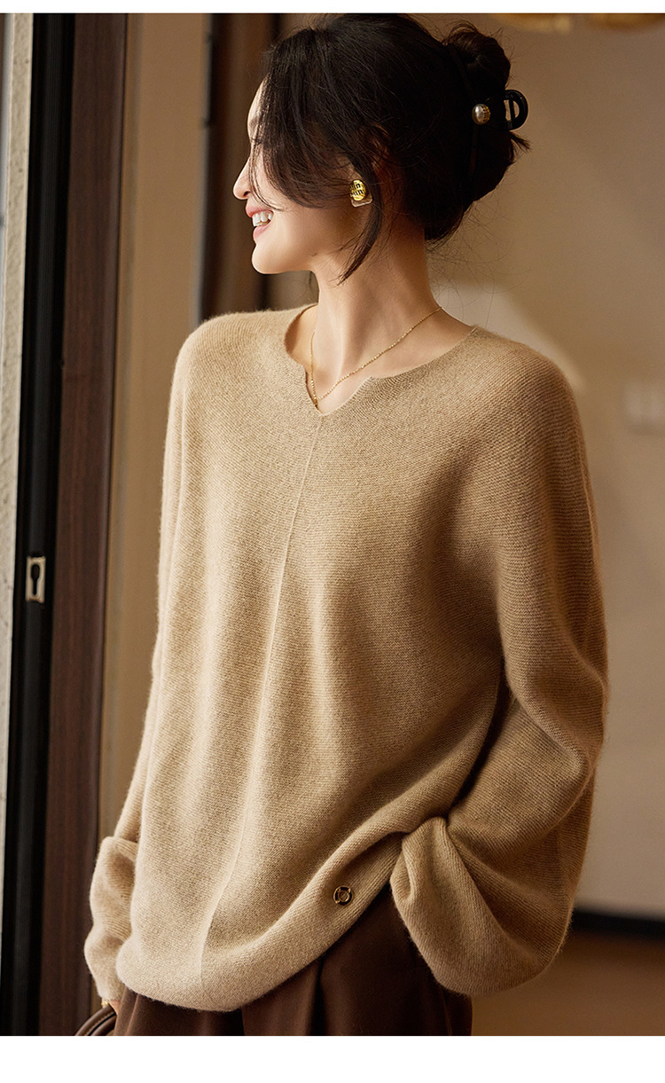 이른 봄 탑 여성의 새로운 게으른 스타일 V 넥 니트 긴팔 단색 느슨한 풀오버 소프트 왁스베이스 울 스웨터스토어 가기