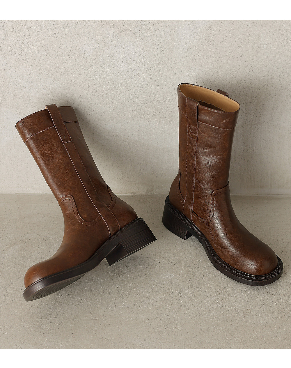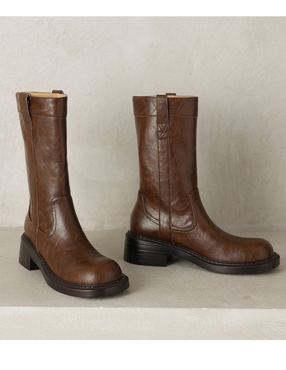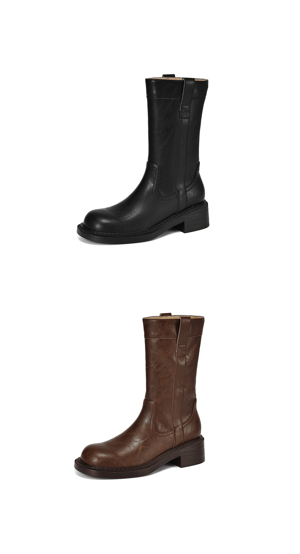 2025 레트로 다크 브라운 Maillard 라운드 헤드 두꺼운 힐 미드 힐 부츠 여성용 새로운 도착 스몰 올 매치 미드 힐 패션 부츠스토어 가기
