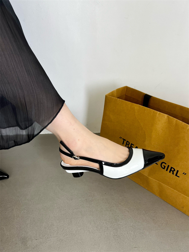 샤넬 스타일 프렌치 스타일 올 매치 두꺼운 하이힐 슈즈 여성의 2025 뾰족한 발가락 백 뒤꿈치 빈 트립 스트랩 컬러 매칭 얕은 입 신발
