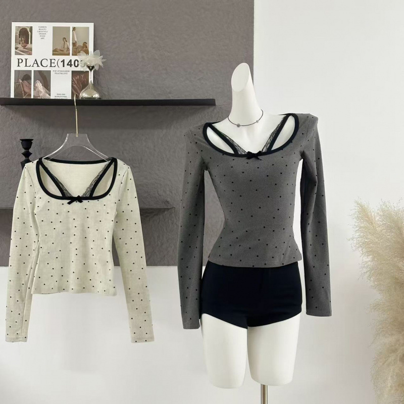 재고! 레이스 V 넥 디자인 활 북극점 긴 소매 기본 티셔츠 여성용 복고풍 스타일 슬리밍 내부 탑스토어 가기