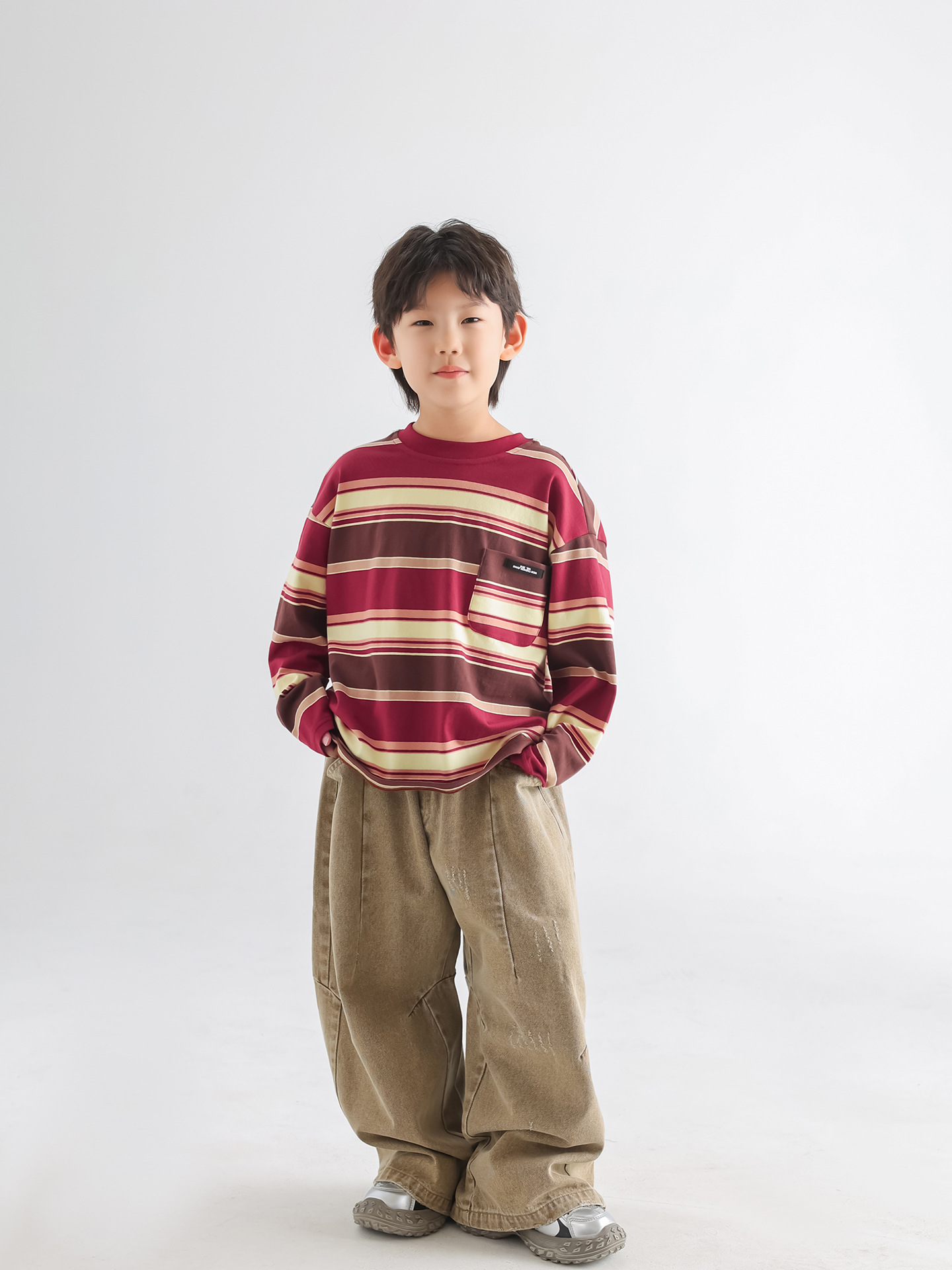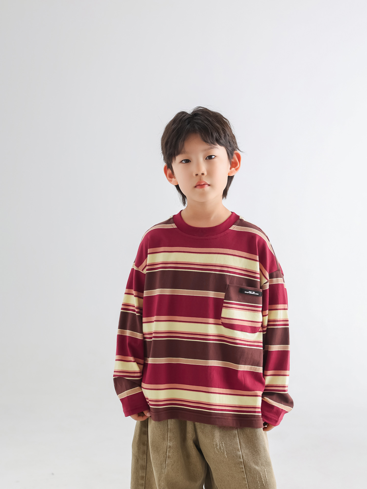 소년 티셔츠 가을 한국 스타일 아동복 2025 아동용 새 줄무늬 가을 긴팔 루즈 풀오버 땀 흡수 탑